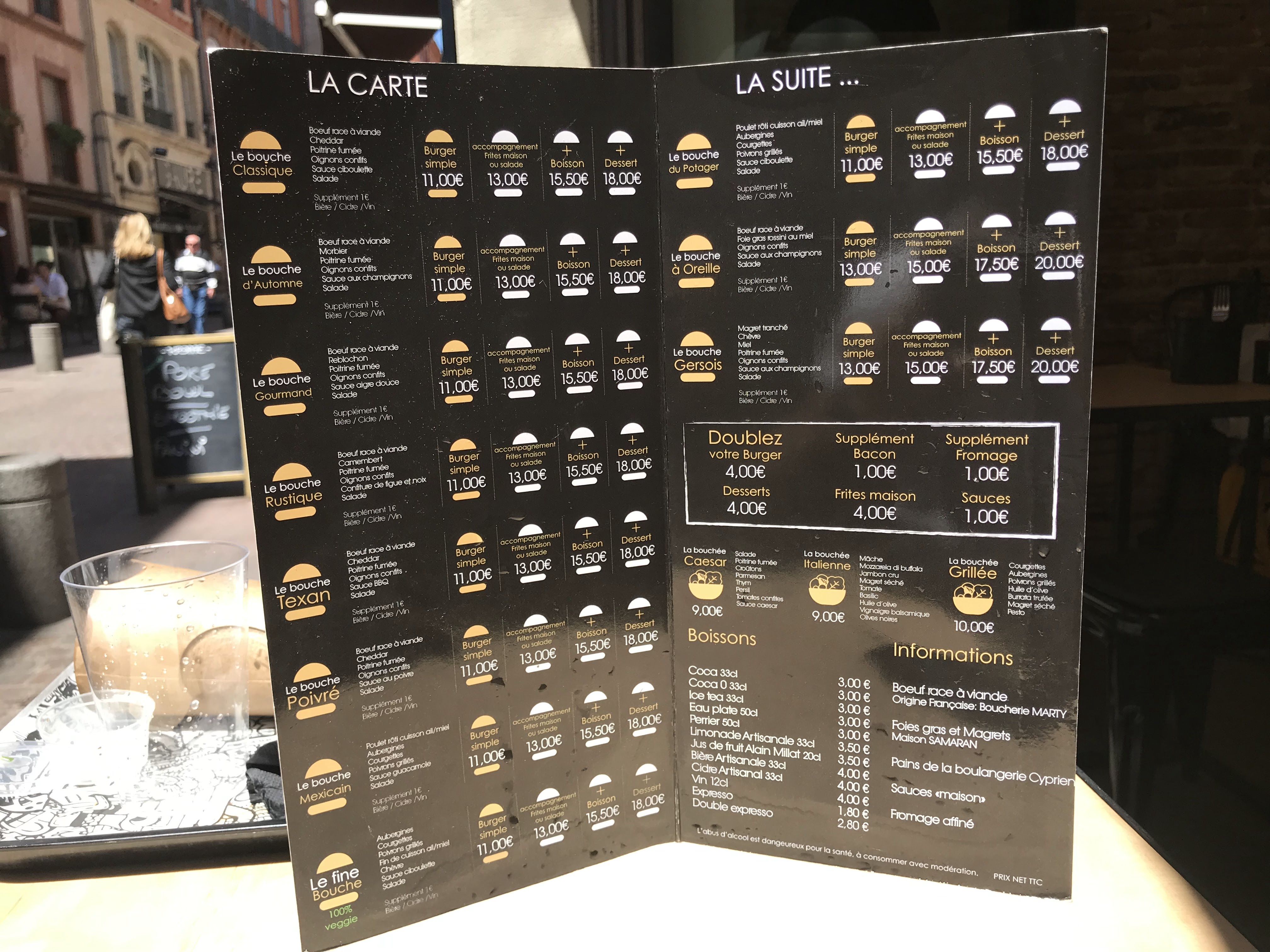 Nouveau lieu toulousain pour ceux qui aiment les hamburgers. Il existe une formule pour les végétariens. L’accueil est bon et le service est rapide mais pas très souriant. En ce qui concerne les prix vous pouvez les voir sur la carte que j’ai pris en photo. À mon humble avis c’est un peu cher pour des hamburgers.