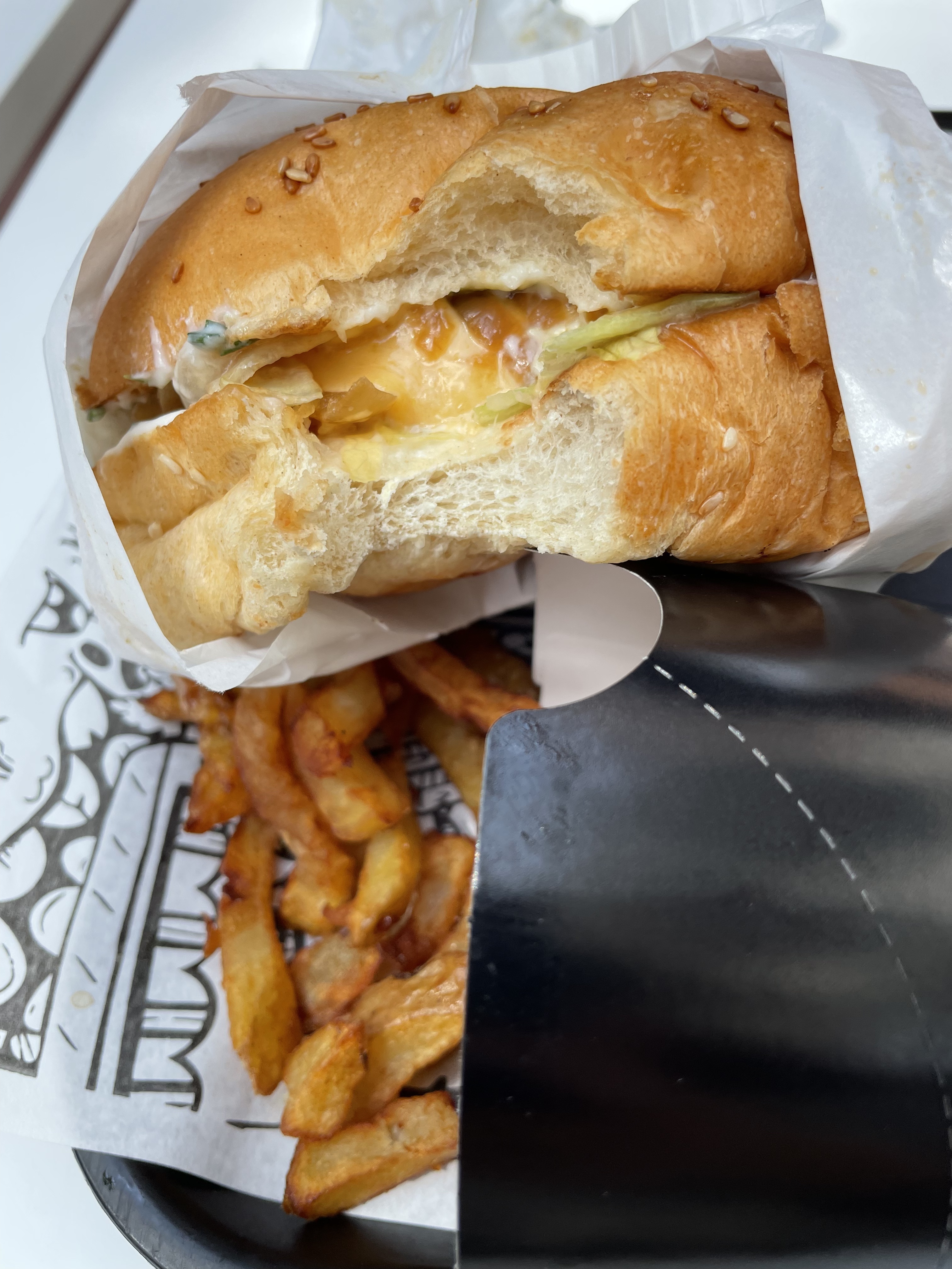 Frites et burger excessivement gras, l'huile coulait sur mes mains... 🤮 L'hamburger végétarien se déchire trop facilement.