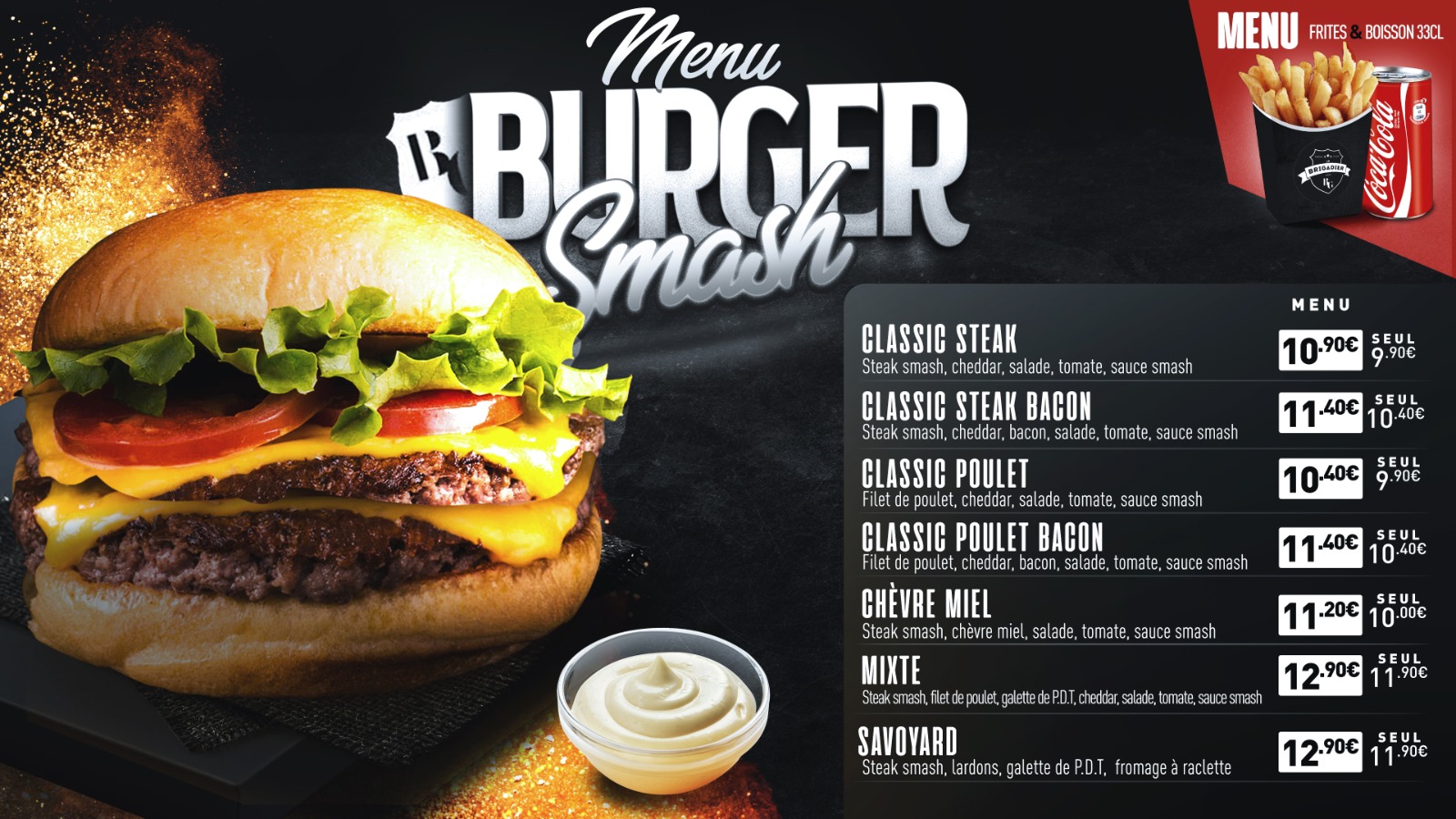 Menu smash délicieux accueil chaleureux, service rapide