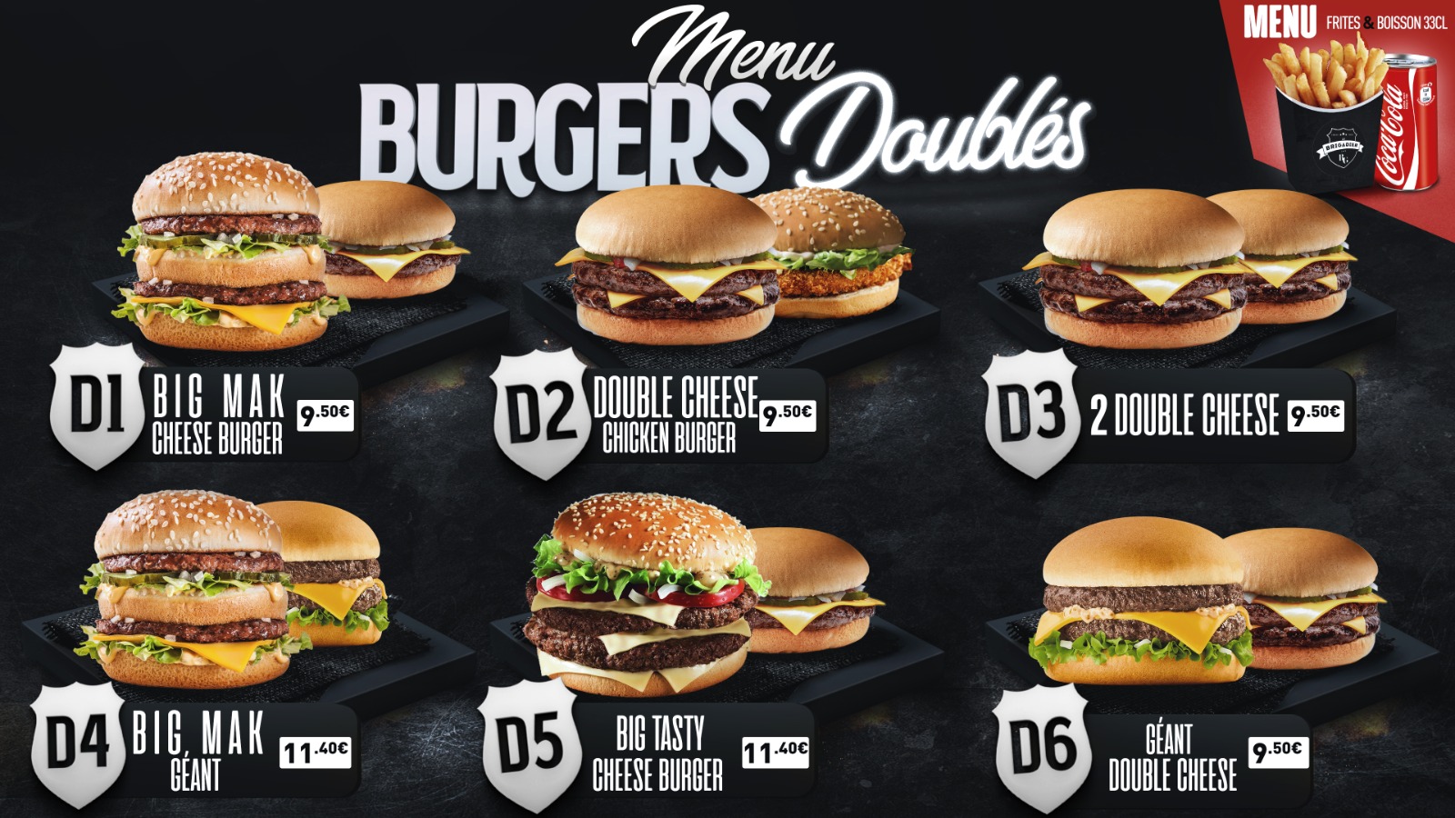 Vous avez raison ! Nos menus doublés propose deux fois plus de plaisir avec deux hamburgers, une fritte et sa boisson. Vous permettre de passez un agréable moment autour d'un bon repas est notre priorité. Au plaisir de vous revoir ! L'équipe Brigadier