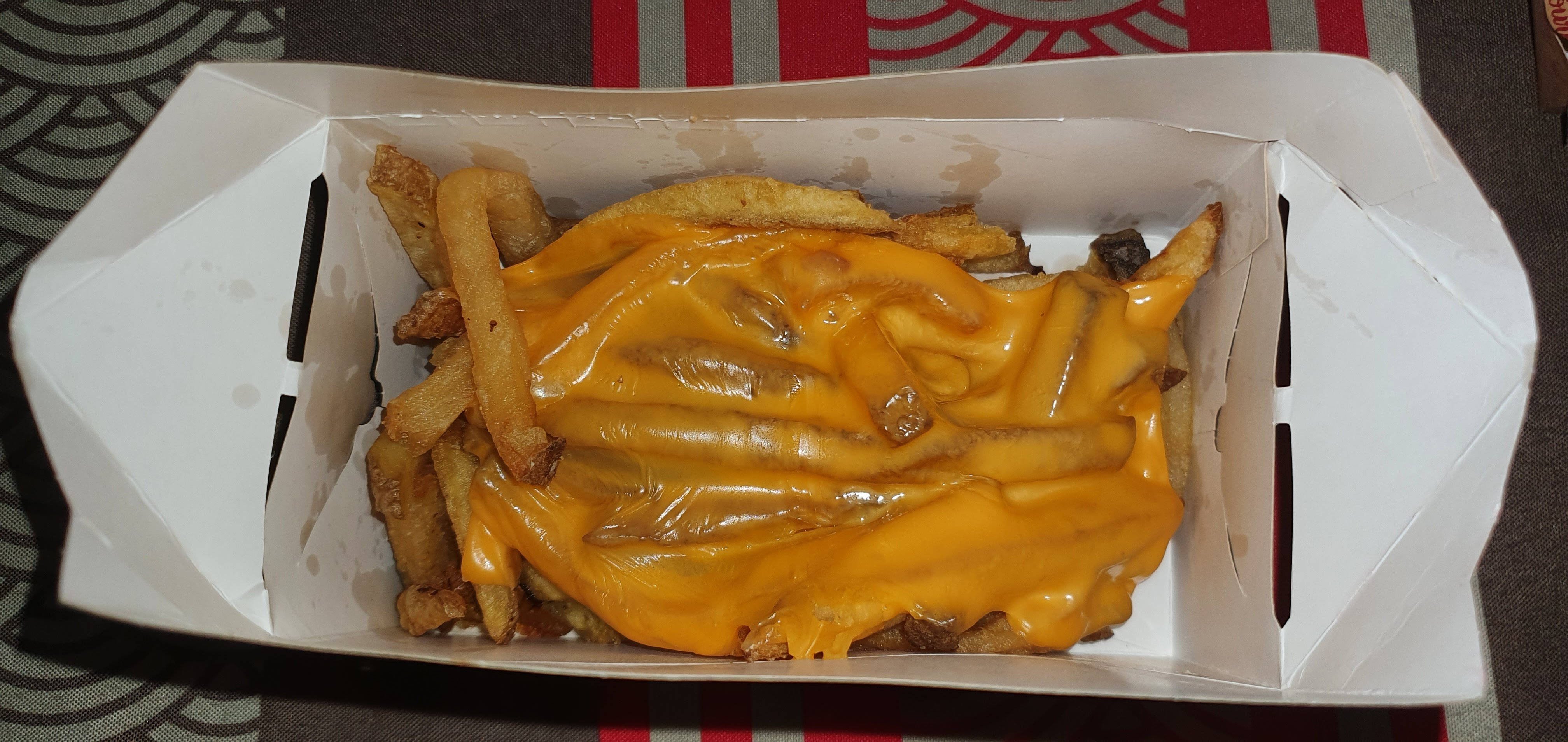 Frites cheddar collé a l’emballage, pas salées. Tenders sans goûts et sans sauces en accompagnement. Burgers correct. Pas de serviette fournies. Livraison rapide.