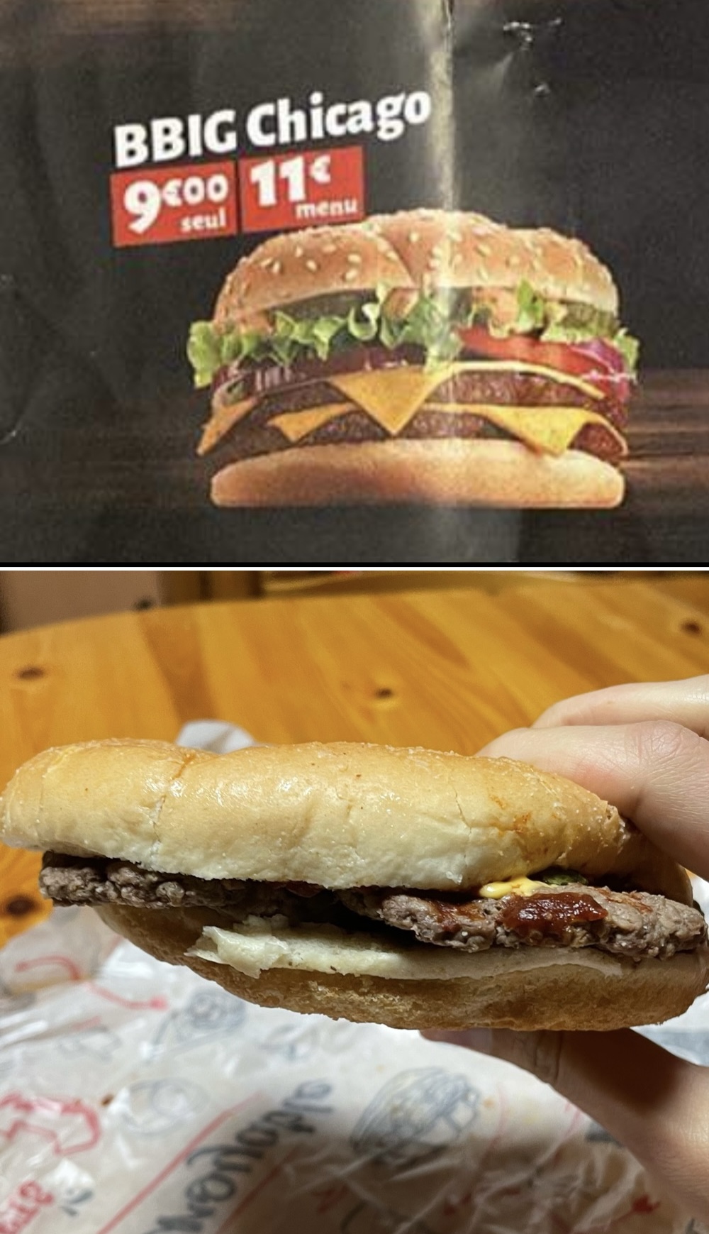 Après 1h d’attente (fête de la musique, on mange sur place), on se signale. Elle me dit qu’il y a beaucoup de monde mais que la prochaine commande qu’ils préparent c’est la nôtre. 40mn après, ils ont encore un hamburger a préparé mais qu’ils nous offrent des desserts en supp. On finit par partir il est 22h15. Tout le monde est dépité. Plus envie d’aller à la fête de la musique. Arrivée à la maison. Pas le bon hamburger pour moi. Pas de dessert en cadeau (on s’en fout) et en plus il en manque un !!! FOUTAGE DE GUEULE !!!