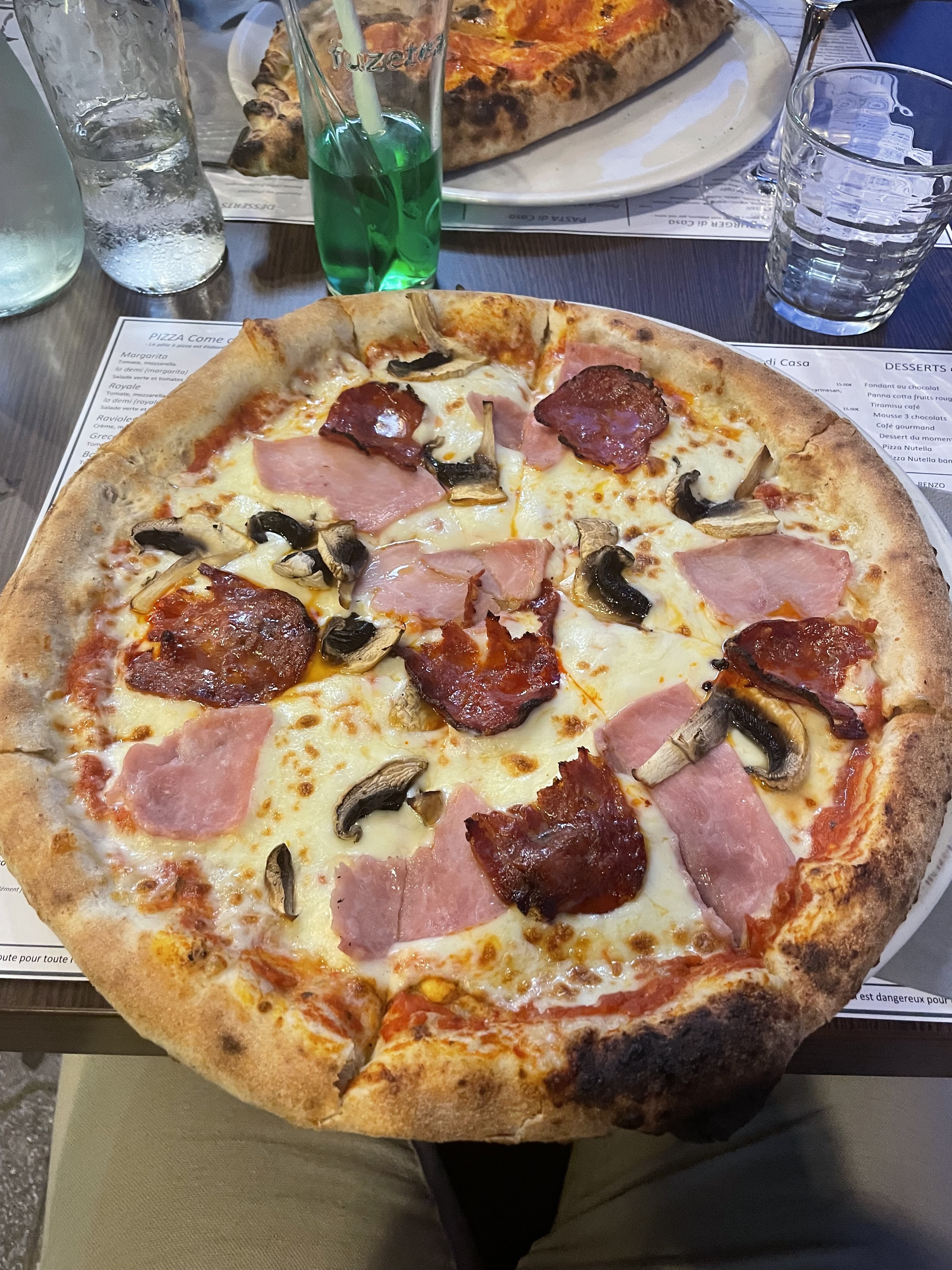 Ambiance et restaurant sympa. Le gros hic pour la pizza. Servi tout d'abord très rapidement (ce qui m'a surpris), autant visuellement l'aspect était très alléchant, autant en la mangeant, la pâte était complètement molle, tiede et pas croustillante comme une pizza qui sort d'un four ce qui n'est pas logique (et je sais de quoi je parle car nous vivons en italie. ) Mon épouse n'a mangé qu'un quart et malgré l'avoir signalé à la fin du repas, pas le moindre geste commercial. Dommage car leur hamburger alpin est vraiment bon, mais pour les pizzas j'ai doute sur leurs fabrications..🫤 Alors je n'ai pas la raison de ce raté mais peut etre devriez vous revoir la partie creation.