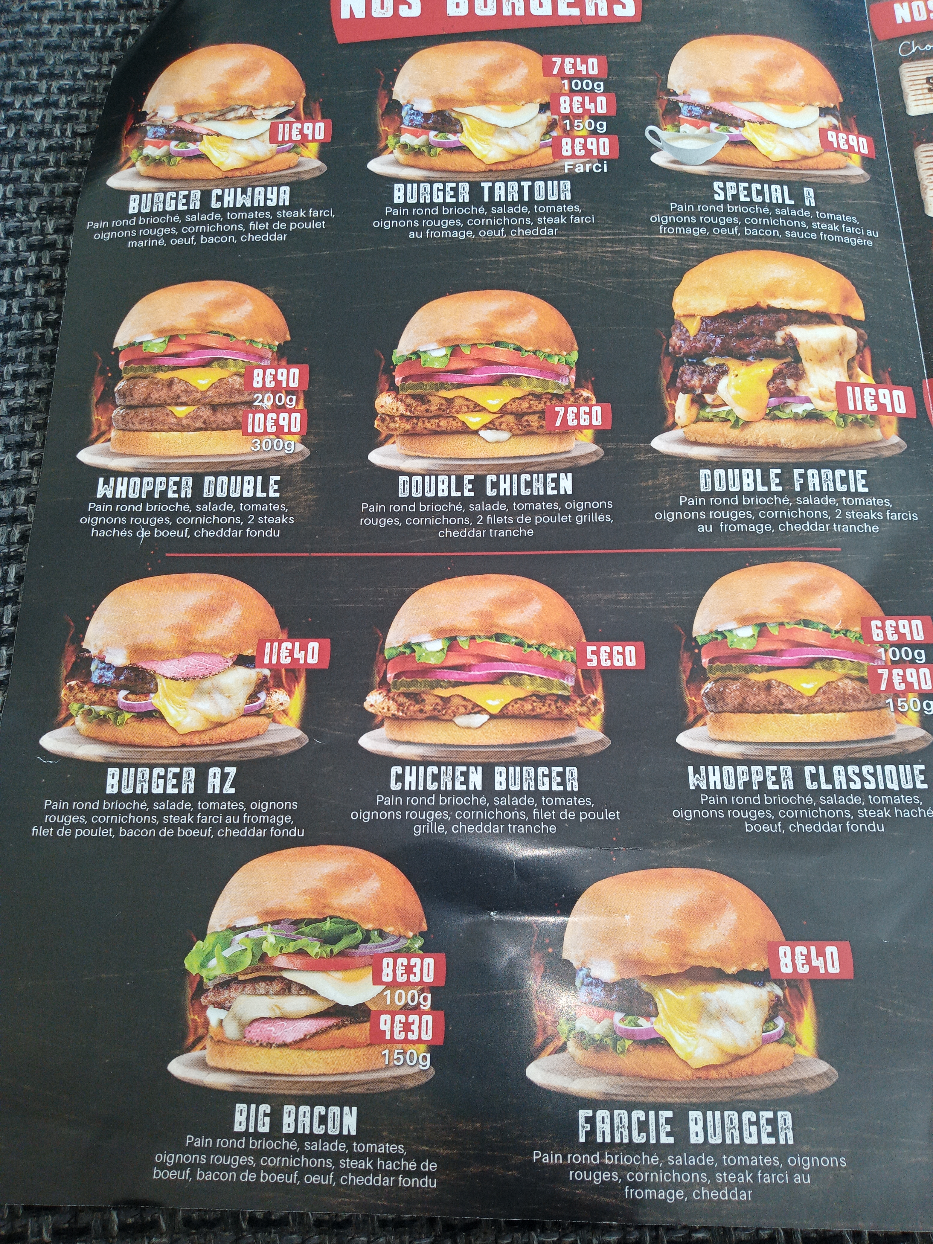 Bonjour walass salas, Merci d'avoir pris le temps de nous partager votre expérience. Nous restons et sommes quelques peu étonné de votre commentaire. Nous tenons à vous informer que les Restaurants Burger Ch'waya mettent un point d'honneur sur la qualité, la fraicheur ainsi que les restrictions d'hygiènes. Nous sommes navrés que vous n'ayez pas apprécié la qualité et le goût unique de nos Burgers qui font le succès des restaurants Burgers Ch'waya. À très vite dans l'un de vos restaurants Burger Ch'waya