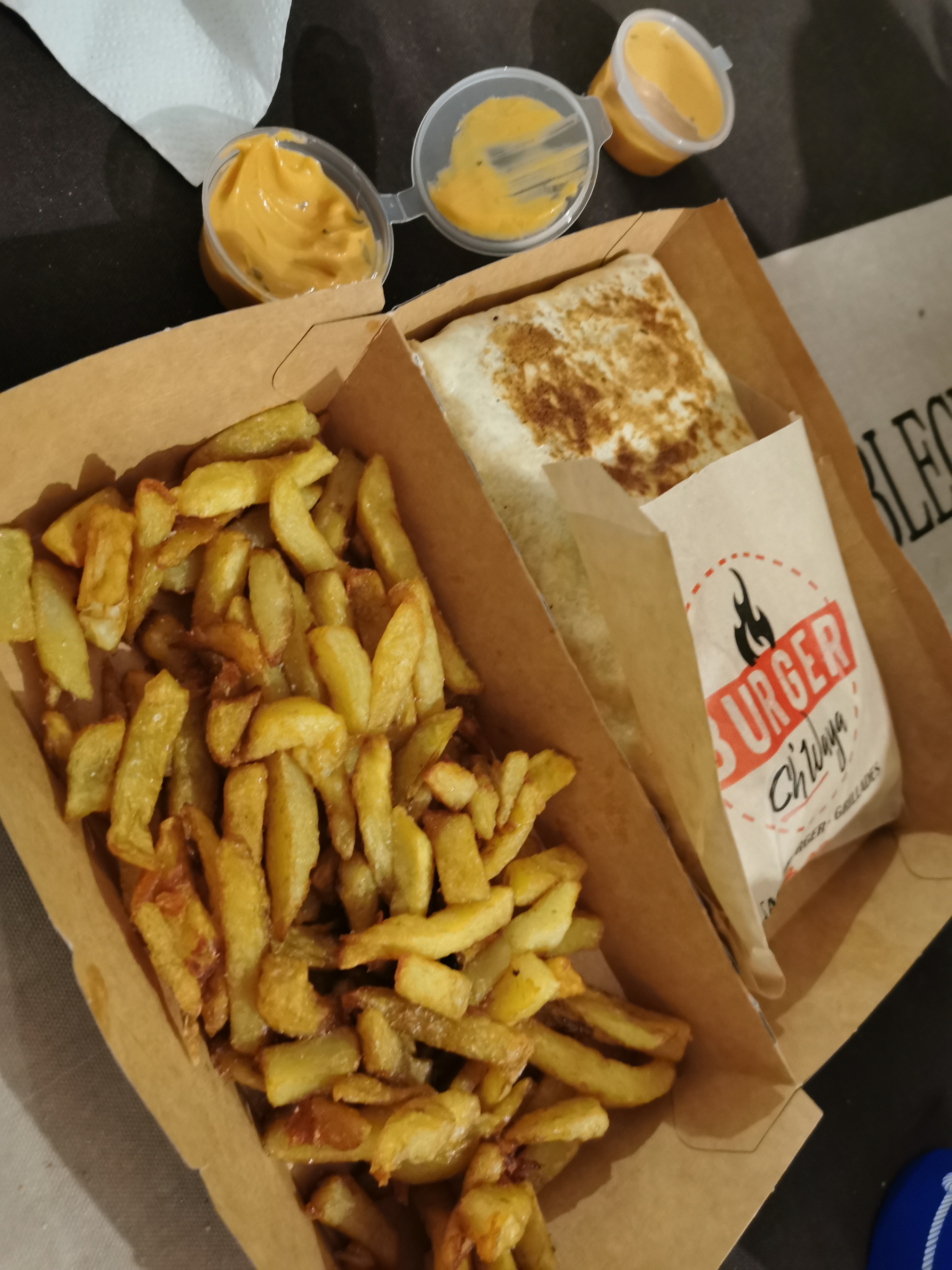 Toujours au top 👍 viandes super bonne Un choix de sandwich large Avec une petite préférence burger ch'waya Frites maison 🤤