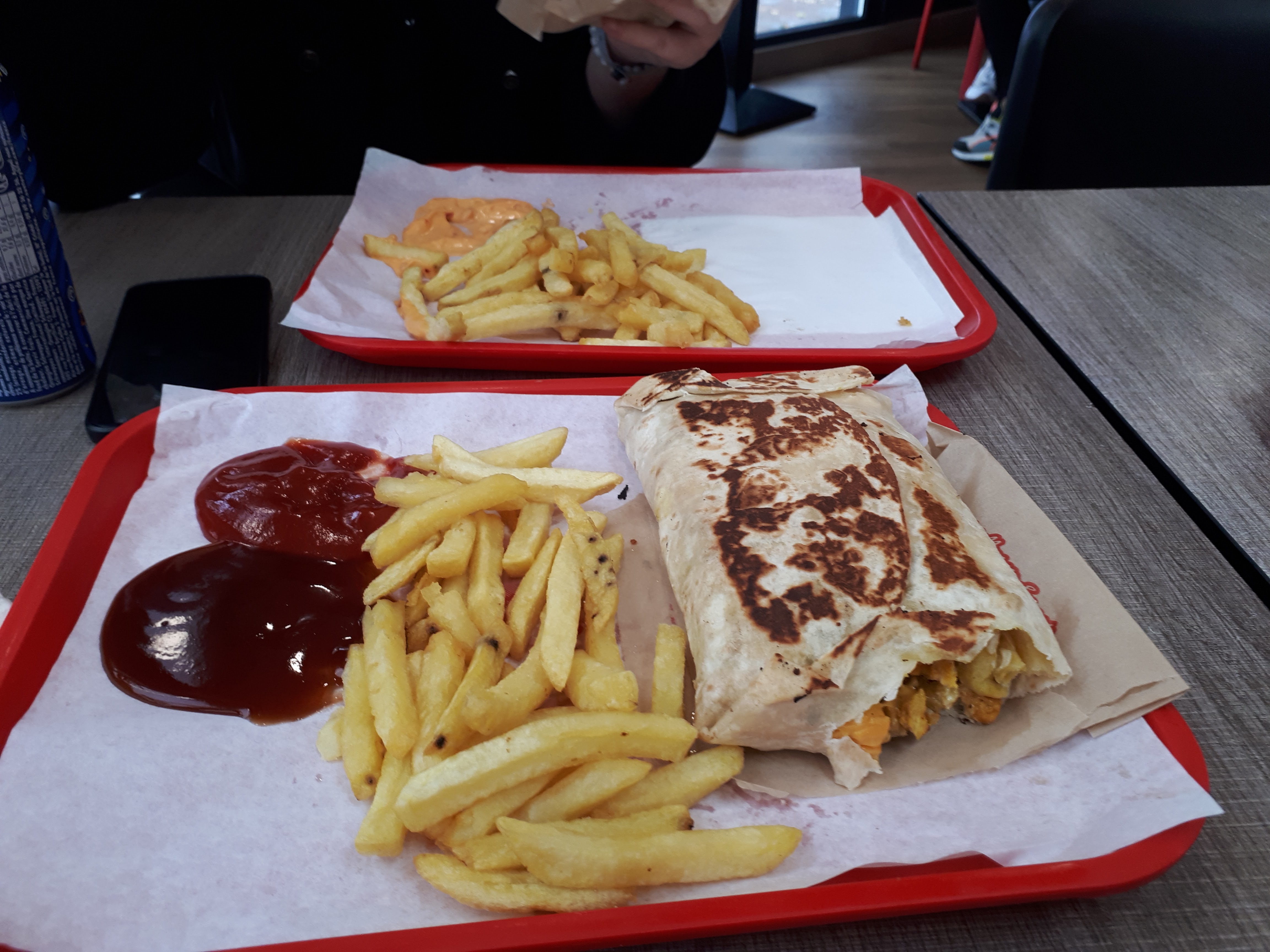 Commande avec un retard de 45 minute, erreur dans les commandes. Bout de bois de brochette retrouvé dans un des sandwichs. Heureusement que l’on avait faim. Bon courage.