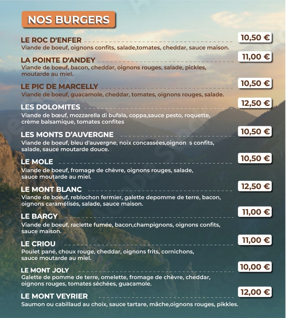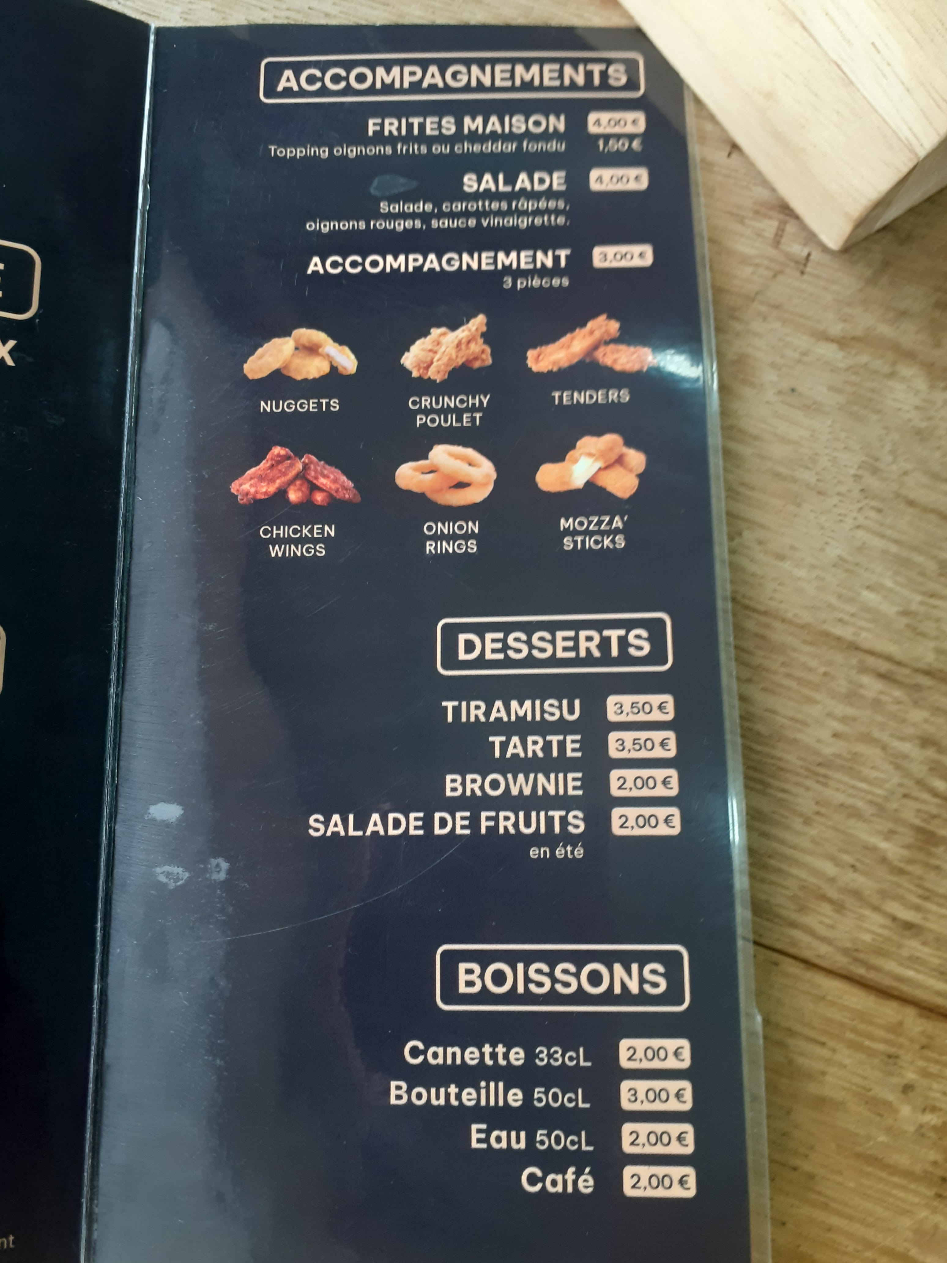 J’ai testé le burger mont blanc il était vraiment excellent pour 9,50€ ce n’était pas cher je recommande.