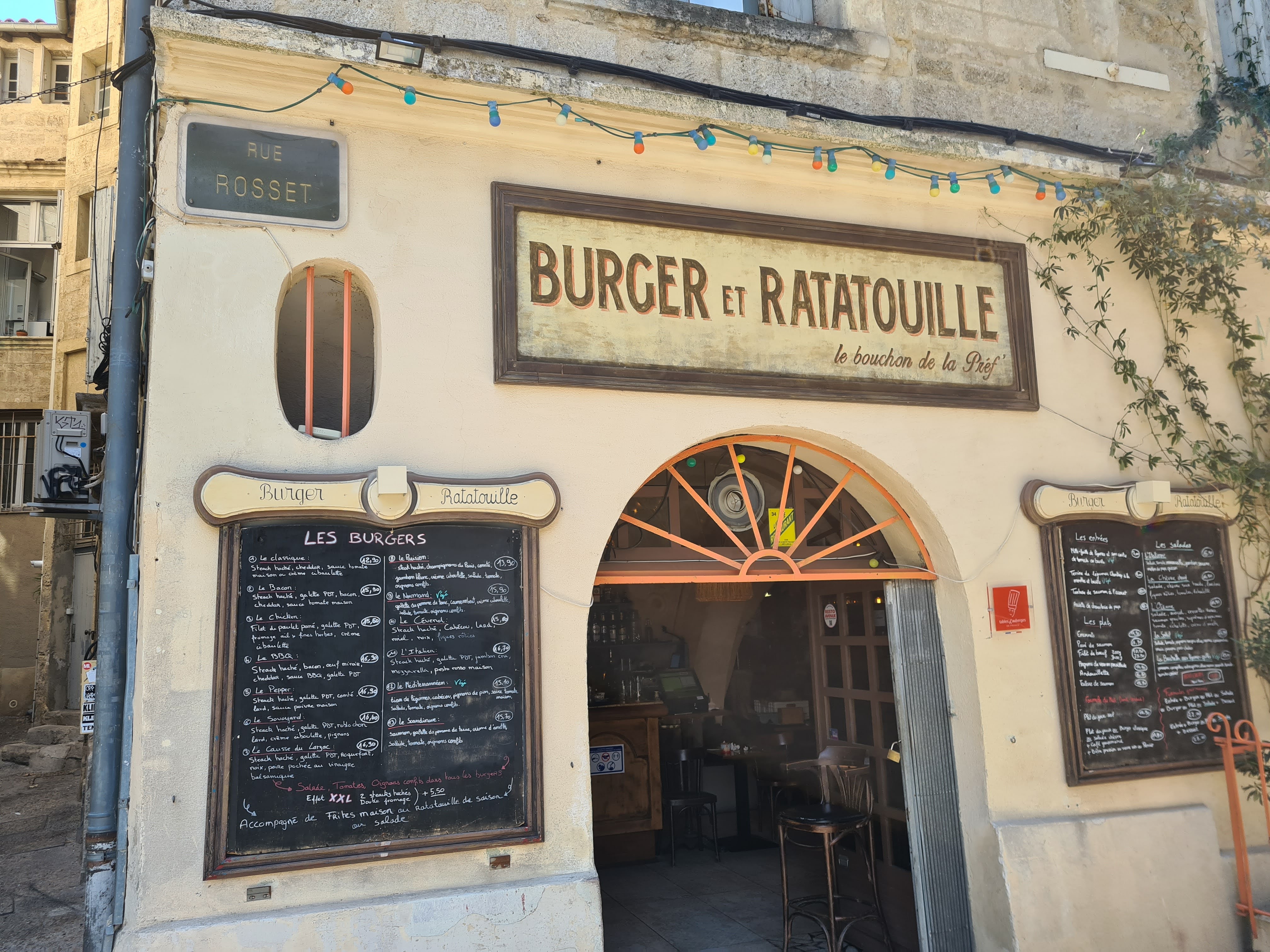 Resto sympa. Comme l'indique le titre, qui propose principalement des burger et des ratatouilles, mais même sans etre fan de l'un ou de l'autre on peut y trouver son compte car la carte est très variée. L'originalité est présente également. Original tout en restant simple, avec une cuisine maison :) Personnel et cadre très agréable. Seul petit bémol, les prix, même si ça reste tout a fait correct, on commence à manger suffisamment à partir de 20e (sinon vous risquez d'avoir un peu faim après). Moment sympa et très bon ;)