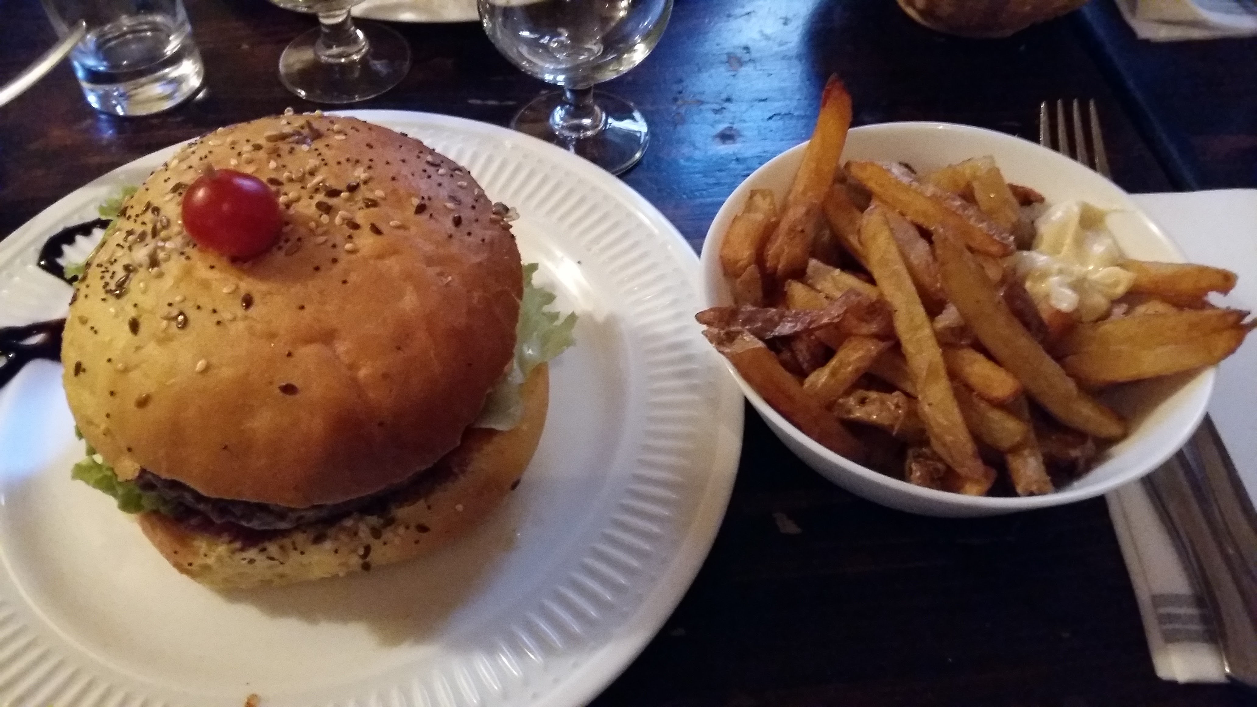 Excellent, contente de mon choix, j'ai pris le burger au chèvre car j'adore ça mais également parce que je n'aime pas trop les galettes de pomme de terre et malheureusement il y en a dans tous les burgers... c'est ma seule déception. Les frites sont excellentes ! j'adore quand elles sont un peu trop grillées (marrons) et un peu molles :) ça ne fait absolument pas industriel ni surgelé. Elles paraissent faites maison, et si ce n'est pas le cas, elles sont quand même très très bonnes ! Le prix est un petit peu élevé (chiffre vite avec un verre de vin) mais la qualité est présente. Resto petit avec une ambiance très sympa, cosy, mignon comme tout.
