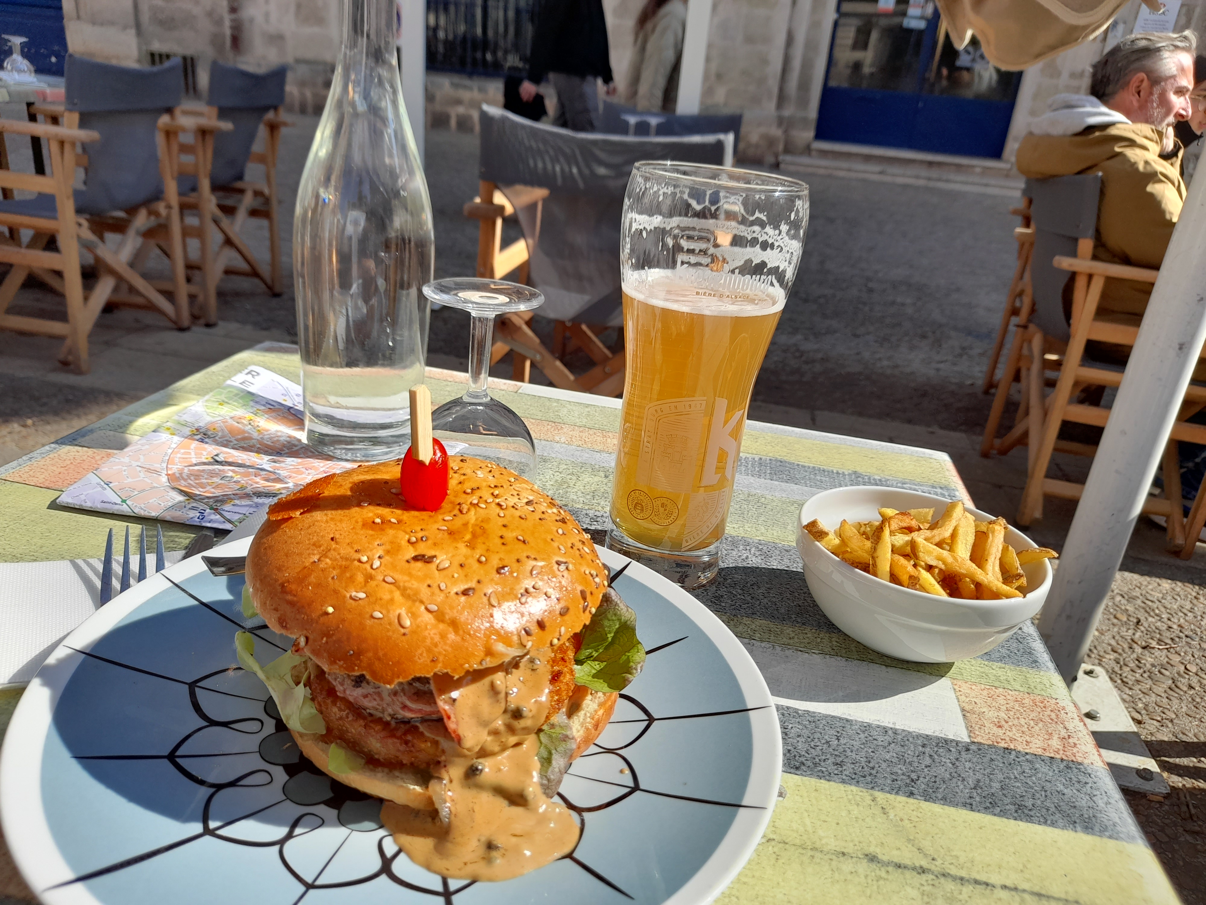 Très bon burger maison frites maison aussi Sur une place ombragée et agreable