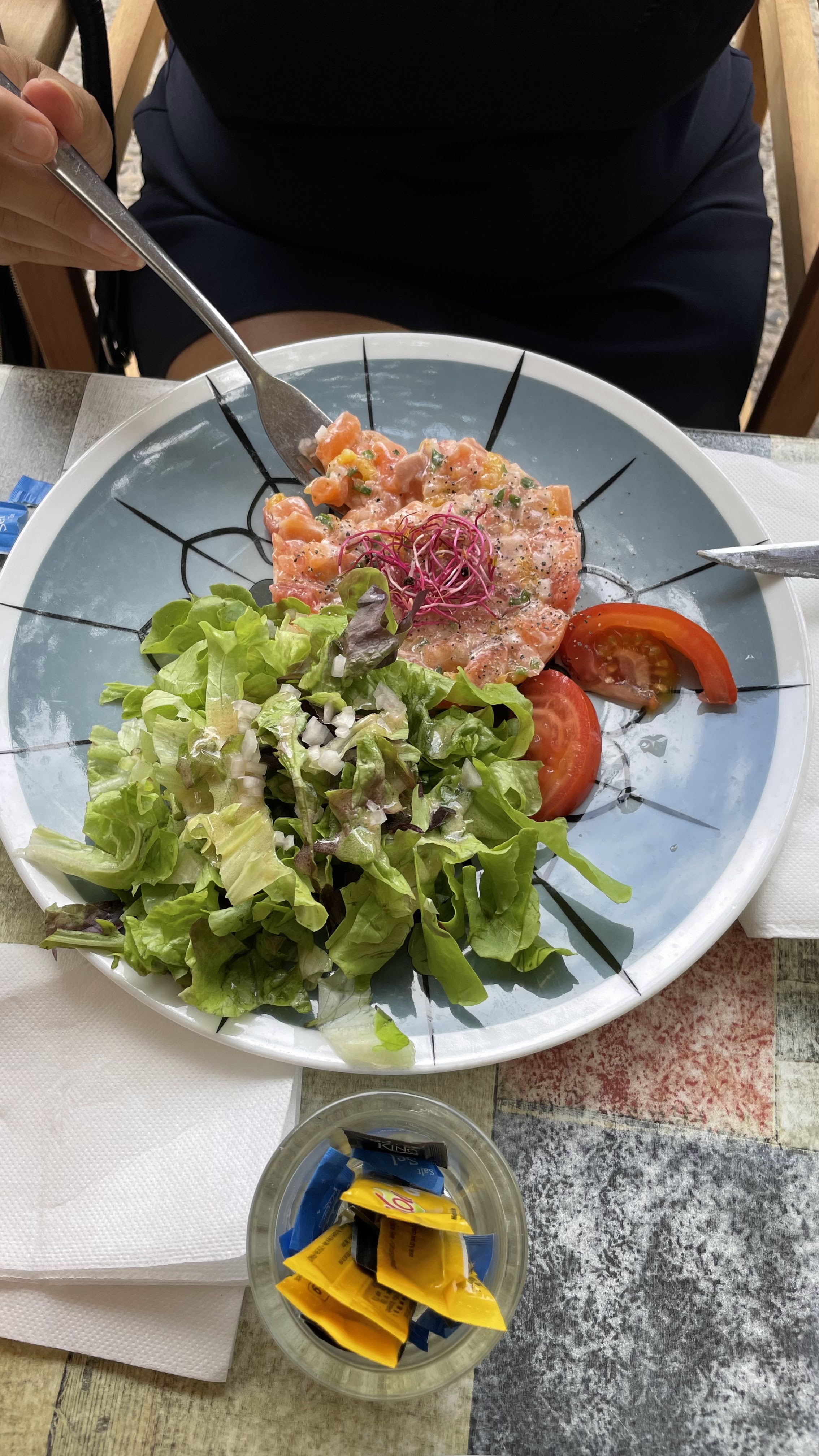 Tres agréable terrasse au frais pour le déjeuner. Salade copieuse idéale pour un déjeuner d'été