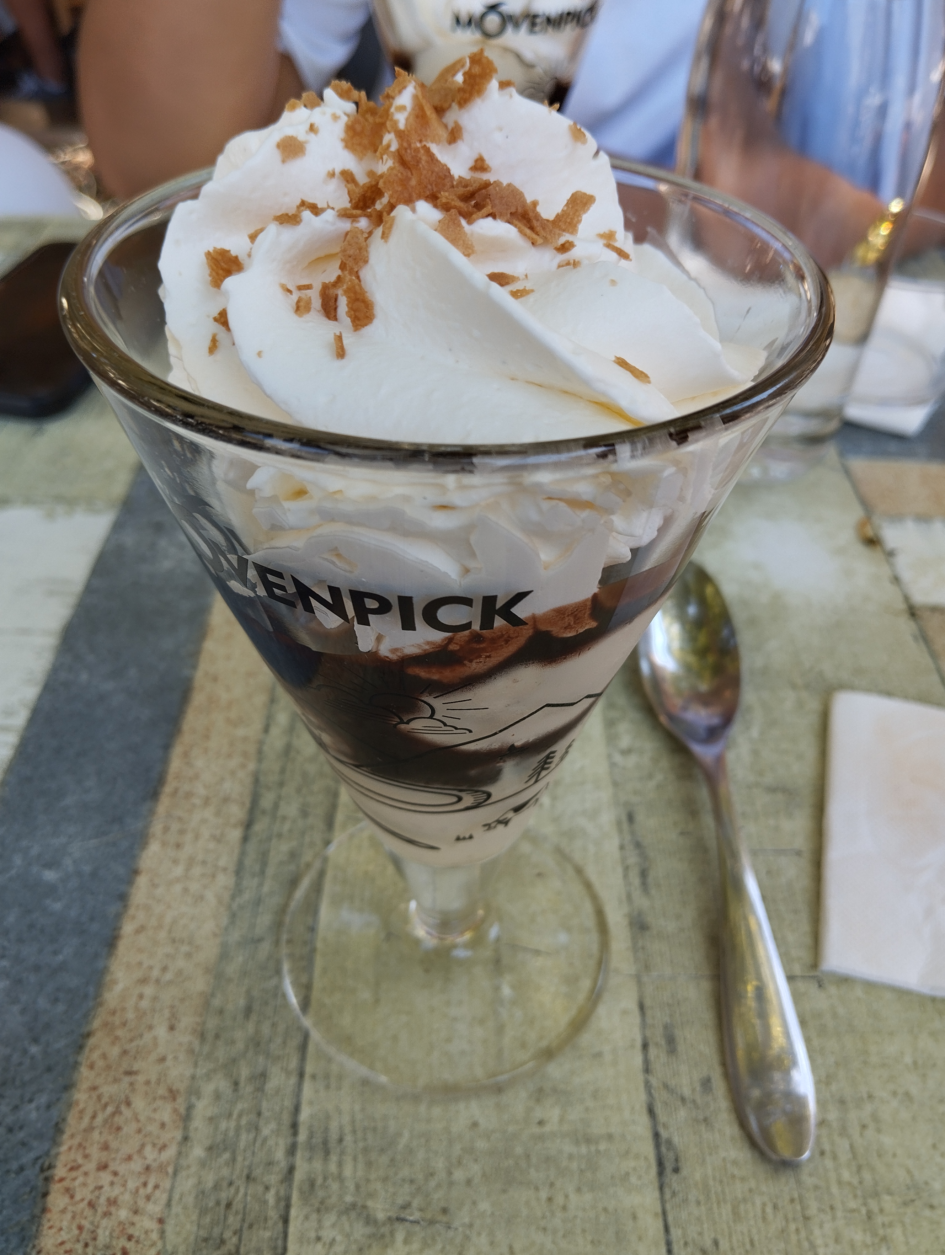 Bof bof bof, on vous amène les plats en même temps que les apéritifs, le vin pratiquement à la fin du repas, une salade avec de la mayonnaise comme seul assaisonnement, des frites douteuses faites à base de pommes de terre non épluchées et on se demande combien de bains de cuisson elles on subies. Le café gourmand : heureusement qu'il y a une boule de glace vanille pour sauver le lot car mousse au chocolat totalement chimique et panacotta acide avec un coulis encore plus acide, je ne reviendrai pas