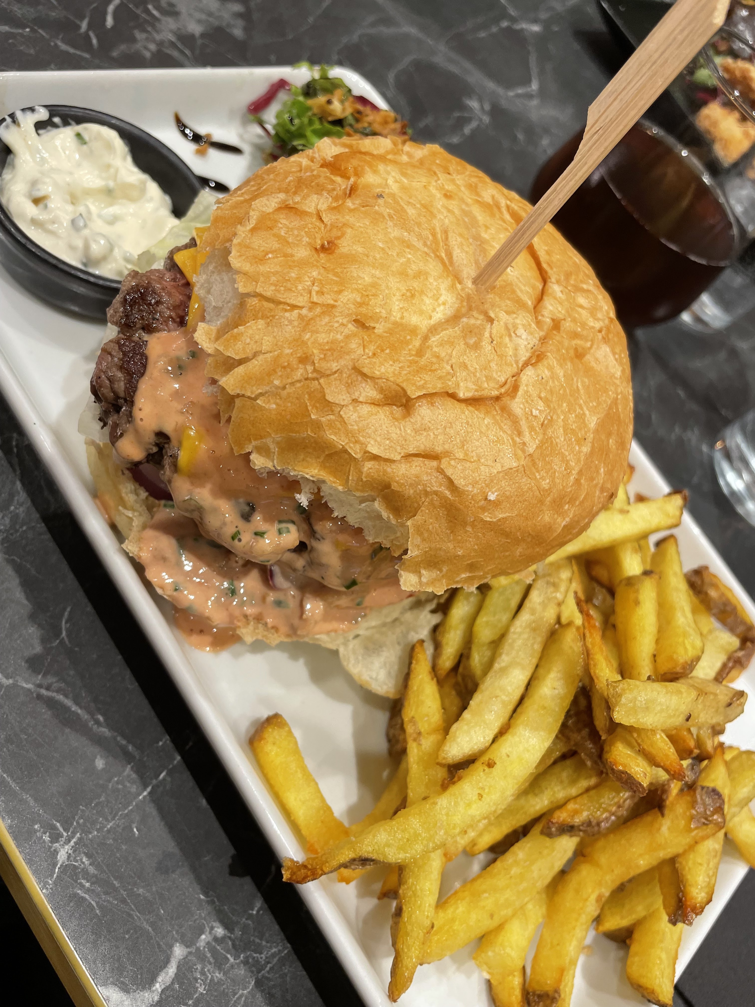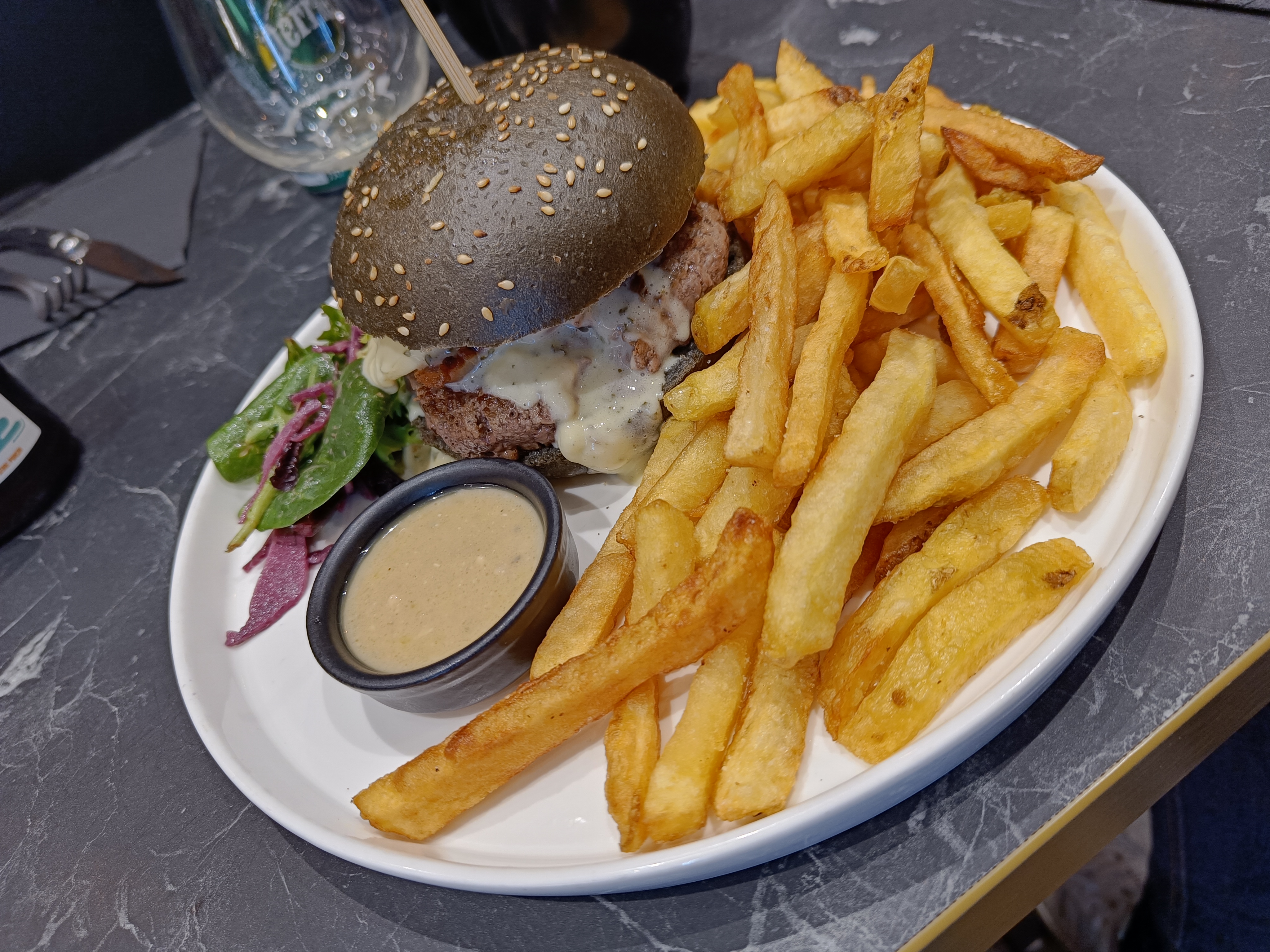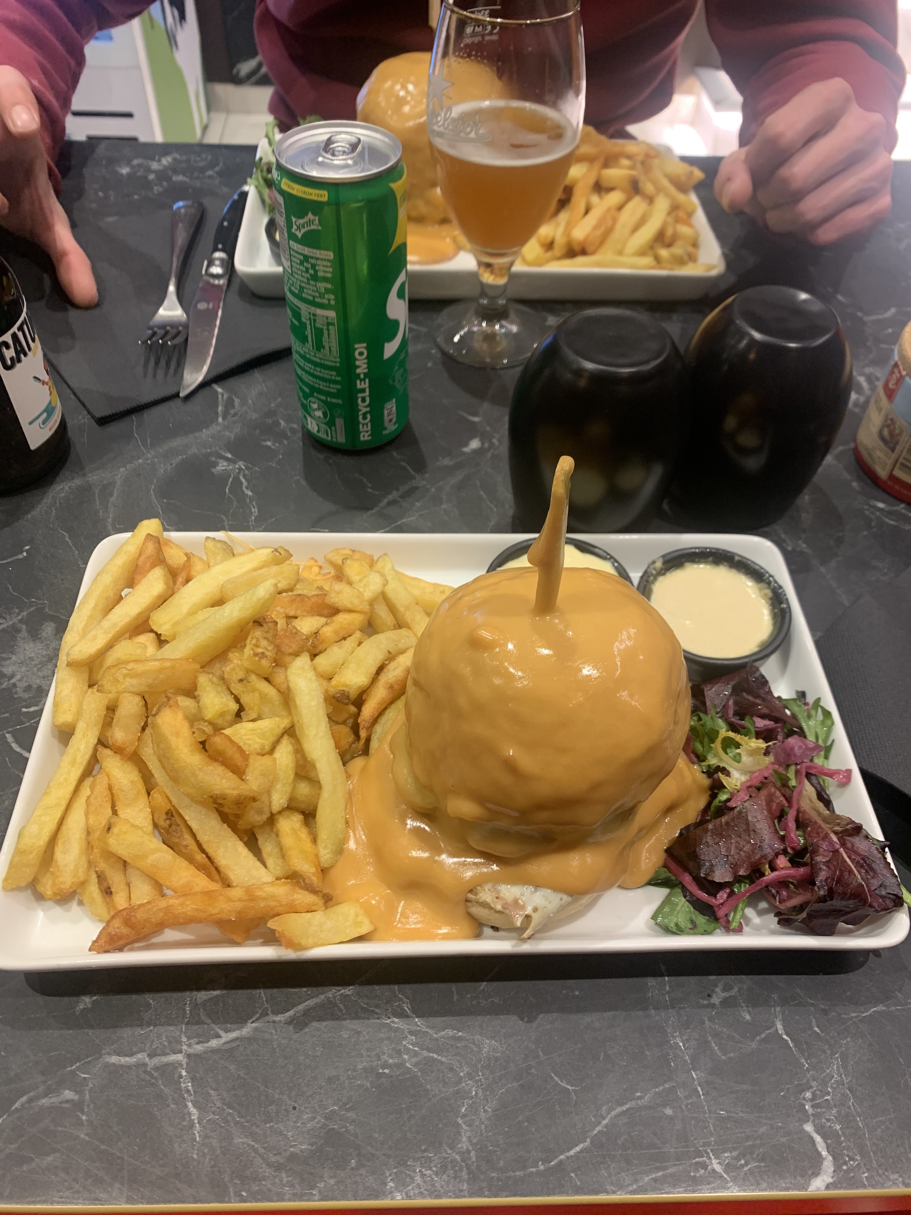 Très très déçue!!! Moi et mon partenaire avons voulu nous fiez aux avis positifs, mais falsifiés. Au moment du service des apéritifs, la serveuse a ramené une bière à mon partenaire, mais reçue tiède, en la renversant à moitié sur la table, nous laissant en plan, sans serviette pour éponger celle ci…Gros manque de professionnalisme à ce niveau là!! De plus, je souhaitais prendre un Perrier, je me retrouve avec un coca ? Lors de la réception des plats, j’ai été outrée d’avoir été servie par un enfant…Les burgers étaient à peine tiède et peu garni, avec une viande demandée saignante, qui se retrouve trop cuite avec quelques résidus de cramé en dessous du steak. Heureusement que les frites rattrapaient la mise bien que le burger ainsi que la sauce ne semblaient pas fait maison comme indiqué par le serveur lors de la prise des commandes… Pour finir, je conclurais en disant que cela ressemble plutôt à une vulgaire gargote sans intérêt plutôt qu’à un soit disant restaurant spécialisé dans les burgers… je ne recommande vraiment pas vu le prix.. A fuir!!!