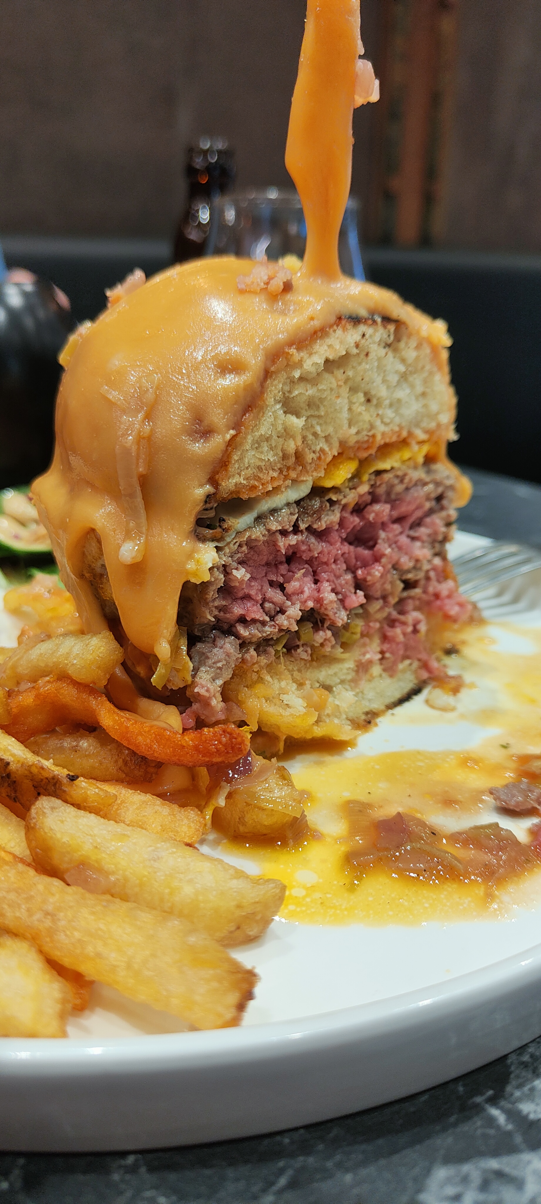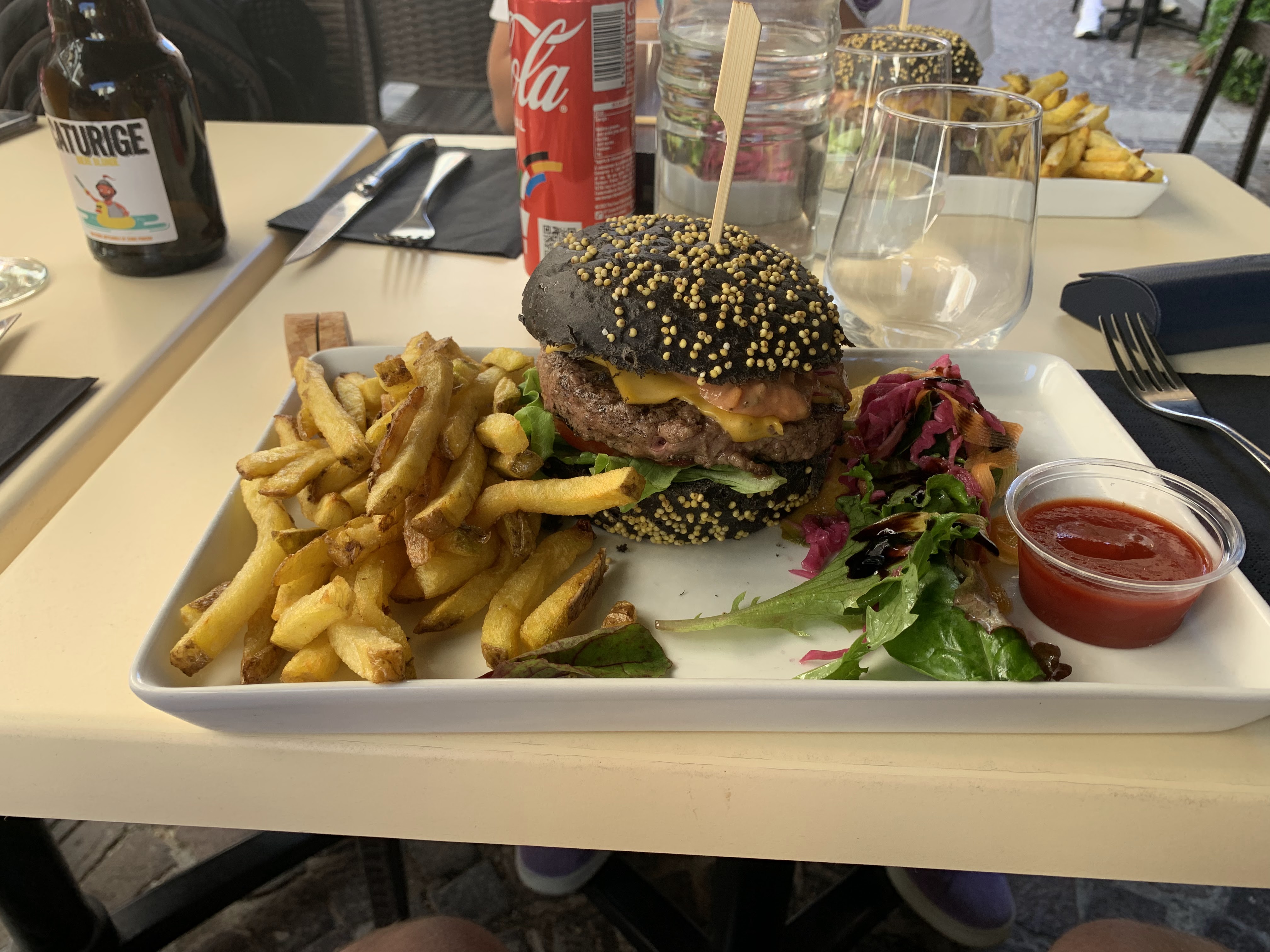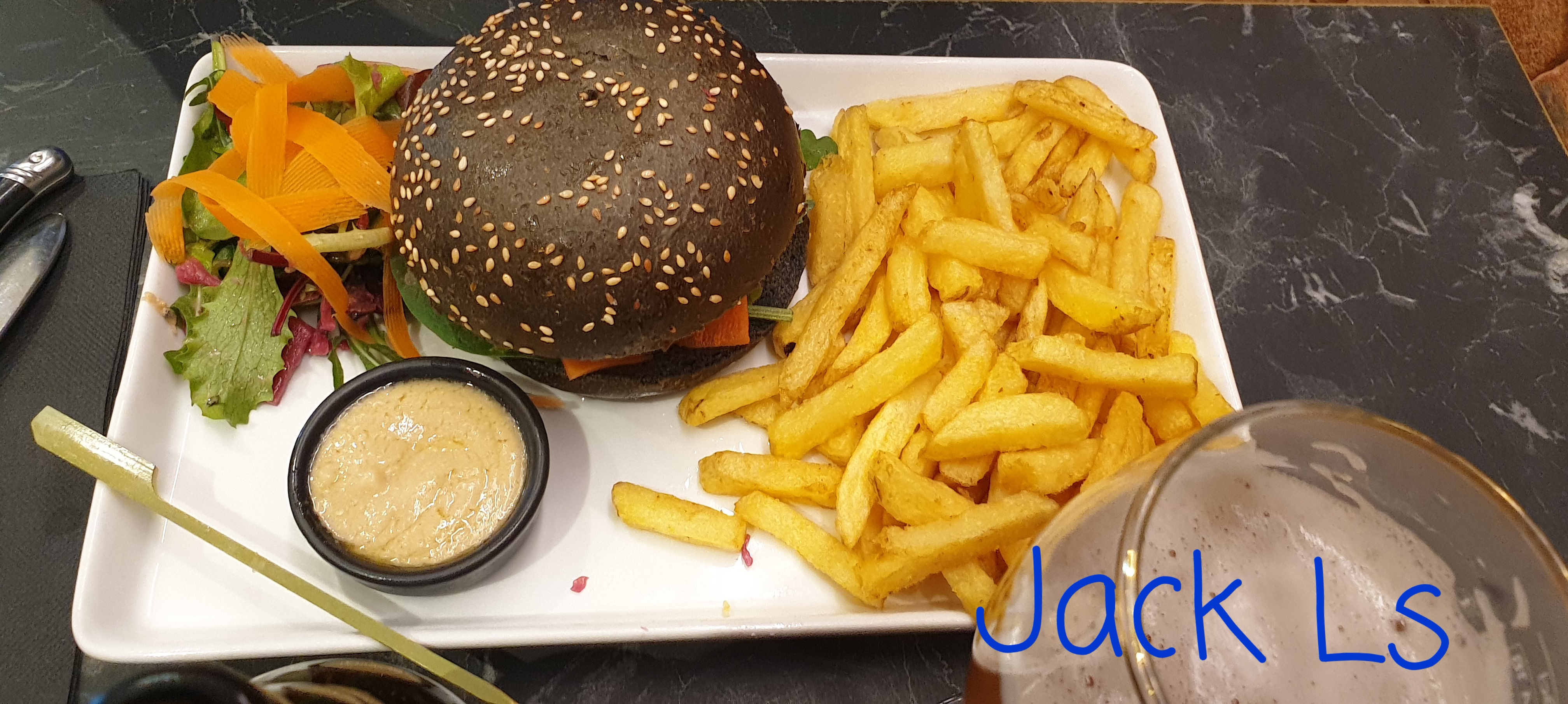 Très très déçue!!! Moi et mon partenaire avons voulu nous fiez aux avis positifs, mais falsifiés. Au moment du service des apéritifs, la serveuse a ramené une bière à mon partenaire, mais reçue tiède, en la renversant à moitié sur la table, nous laissant en plan, sans serviette pour éponger celle ci…Gros manque de professionnalisme à ce niveau là!! De plus, je souhaitais prendre un Perrier, je me retrouve avec un coca ? Lors de la réception des plats, j’ai été outrée d’avoir été servie par un enfant…Les burgers étaient à peine tiède et peu garni, avec une viande demandée saignante, qui se retrouve trop cuite avec quelques résidus de cramé en dessous du steak. Heureusement que les frites rattrapaient la mise bien que le burger ainsi que la sauce ne semblaient pas fait maison comme indiqué par le serveur lors de la prise des commandes… Pour finir, je conclurais en disant que cela ressemble plutôt à une vulgaire gargote sans intérêt plutôt qu’à un soit disant restaurant spécialisé dans les burgers… je ne recommande vraiment pas vu le prix.. A fuir!!!