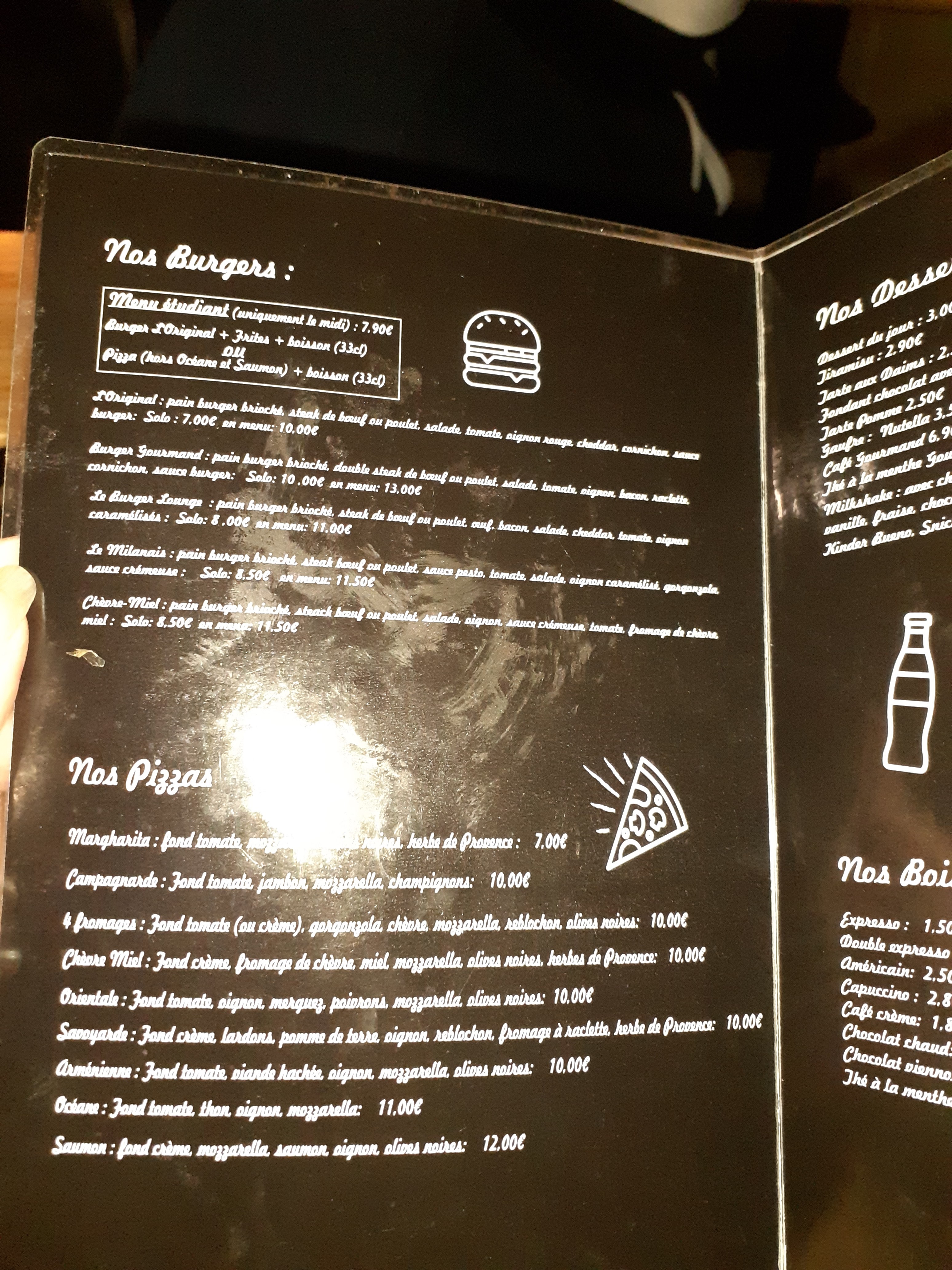 Très bon accueil et repas très bon ! On peut venir manger un vrai burger avec de vraies frites. Il y a un menu étudiant à 7euros90 et on n'a vraiment plus faim en sortant, n'hésitez pas :)