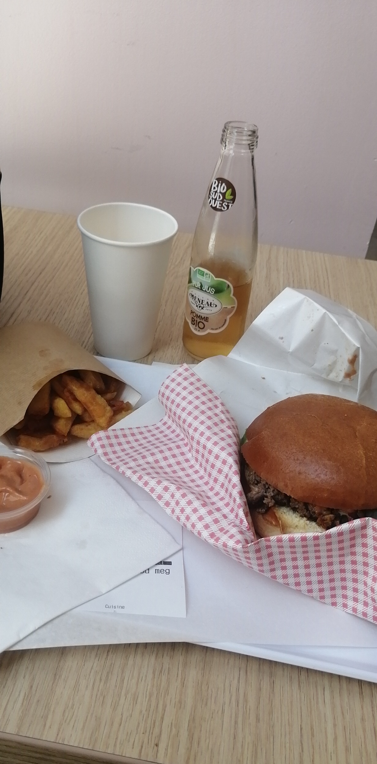 Très bon Hamburger avec viande Française de Terroir, sauce maison, vins Bio au verre !!! A découvrir. On y retournera.