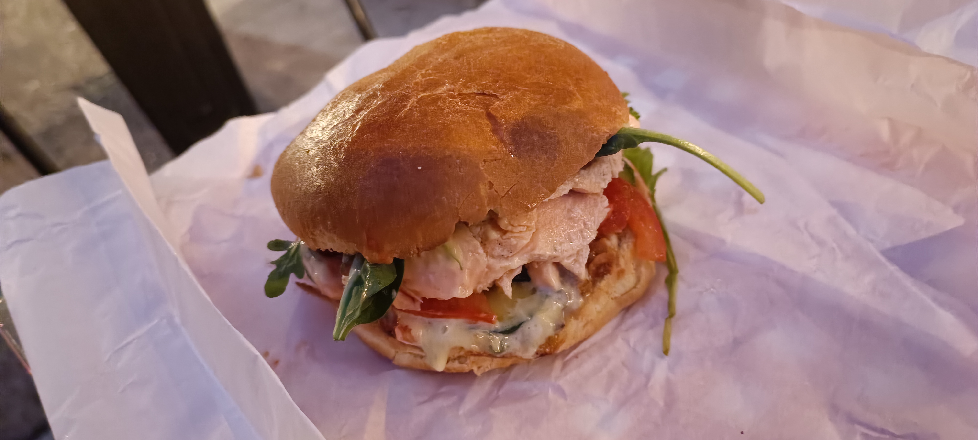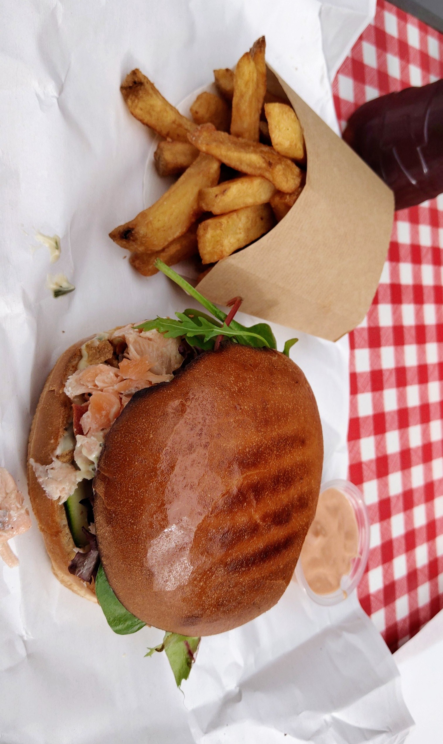 Moyen. Un burger au saumon mal construit. Degoulinant. On voit la negligence. Et en fait le gars a la caisse s' en fout. Dommage. Formation des employés à revoir, recettes à corriger.