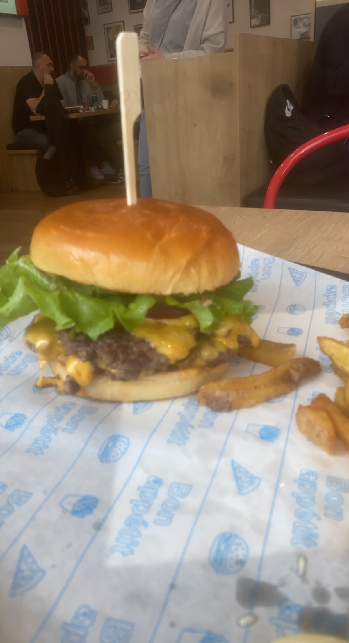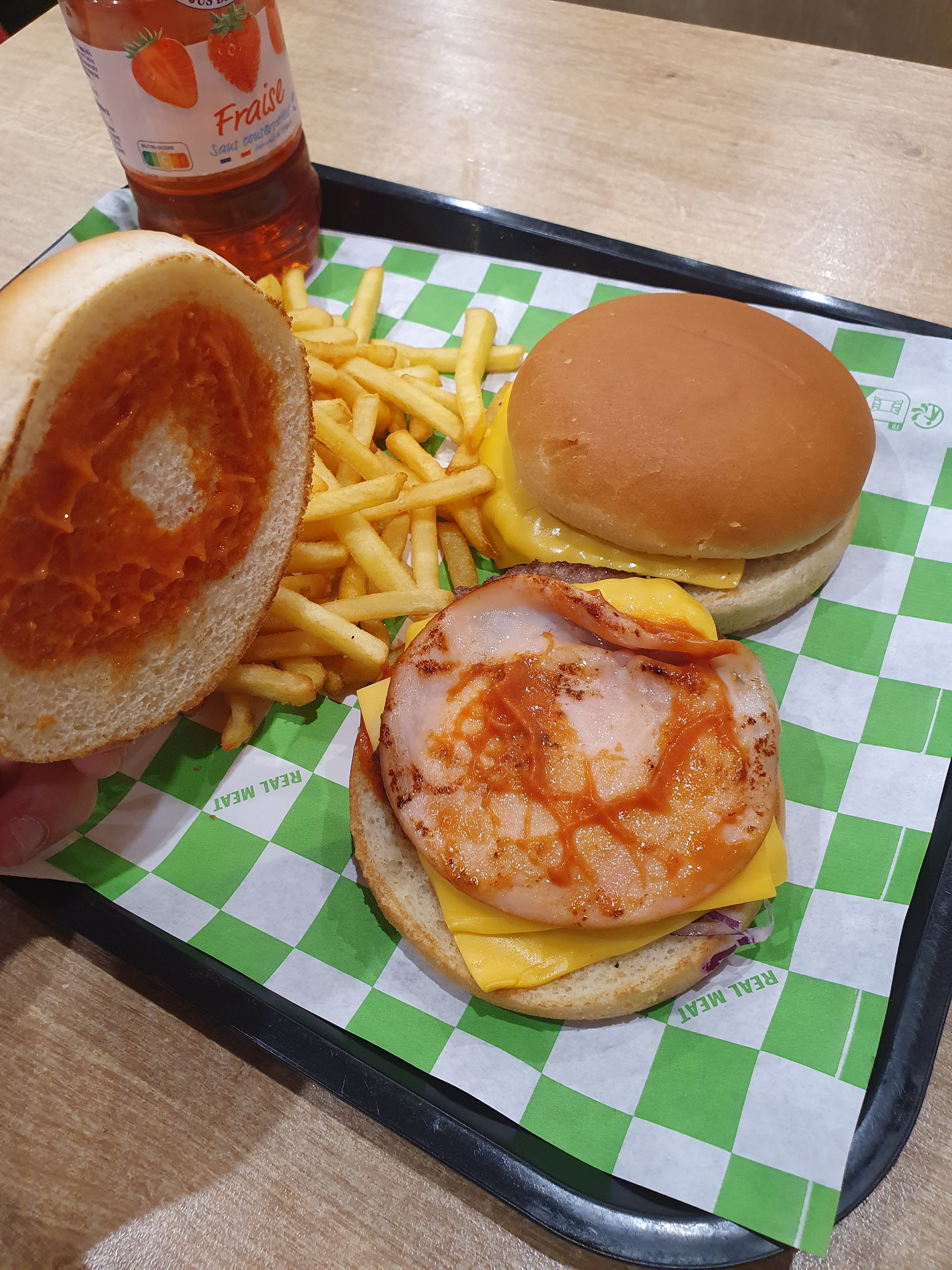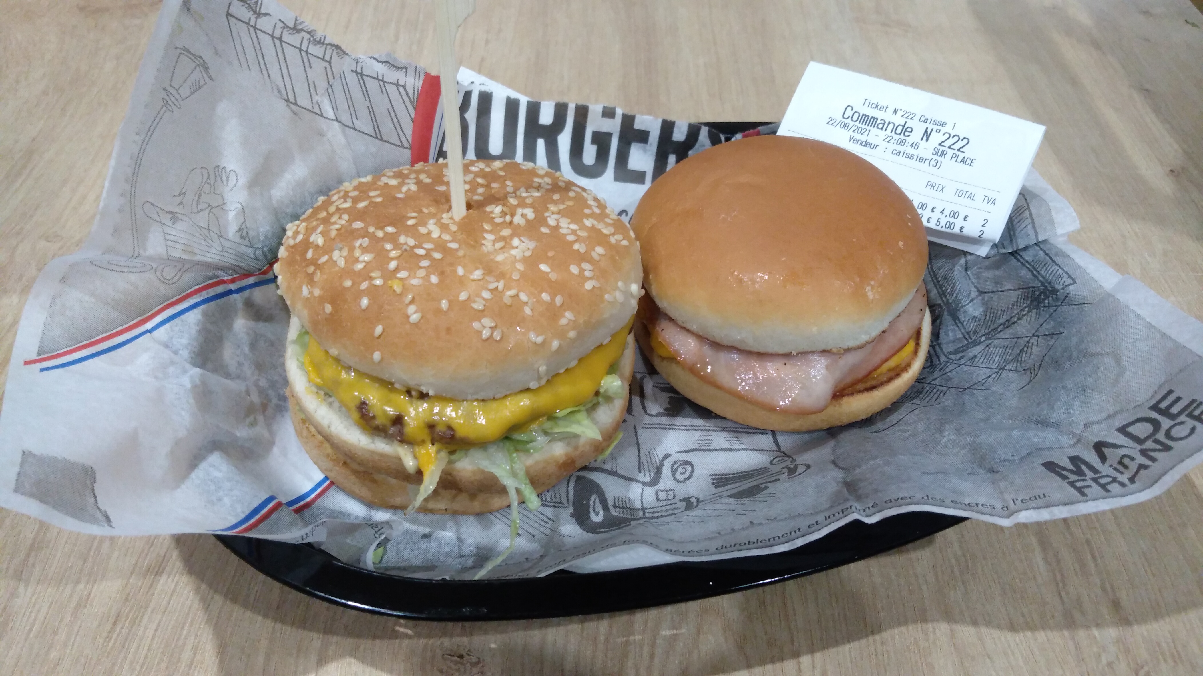 Accueil super sympa. Commande d’un double cheese bacon… Entre nous. On voudrais du vrai bacon( poitrine fumé grillé ) . Burger pas mauvais avec de l’oignon et les cornichon qui ne sont pas précisé dans la recette. Indique salade tomate oignons… Bref. Je reviendrais au vue des nombreux bon avis. Mais actuellement pour un mini sandwich je suis un peu déçu. On verra à ma prochaine commande … Ps: emballé des sandwichs dans du papier d’aluminium qui avec là chaleurs deviens un puissant neuro toxique. Faite un effort et vous aurais mes 5 étoiles avec grand plaisir parque vous les méritez. Je pense et je l’espère !