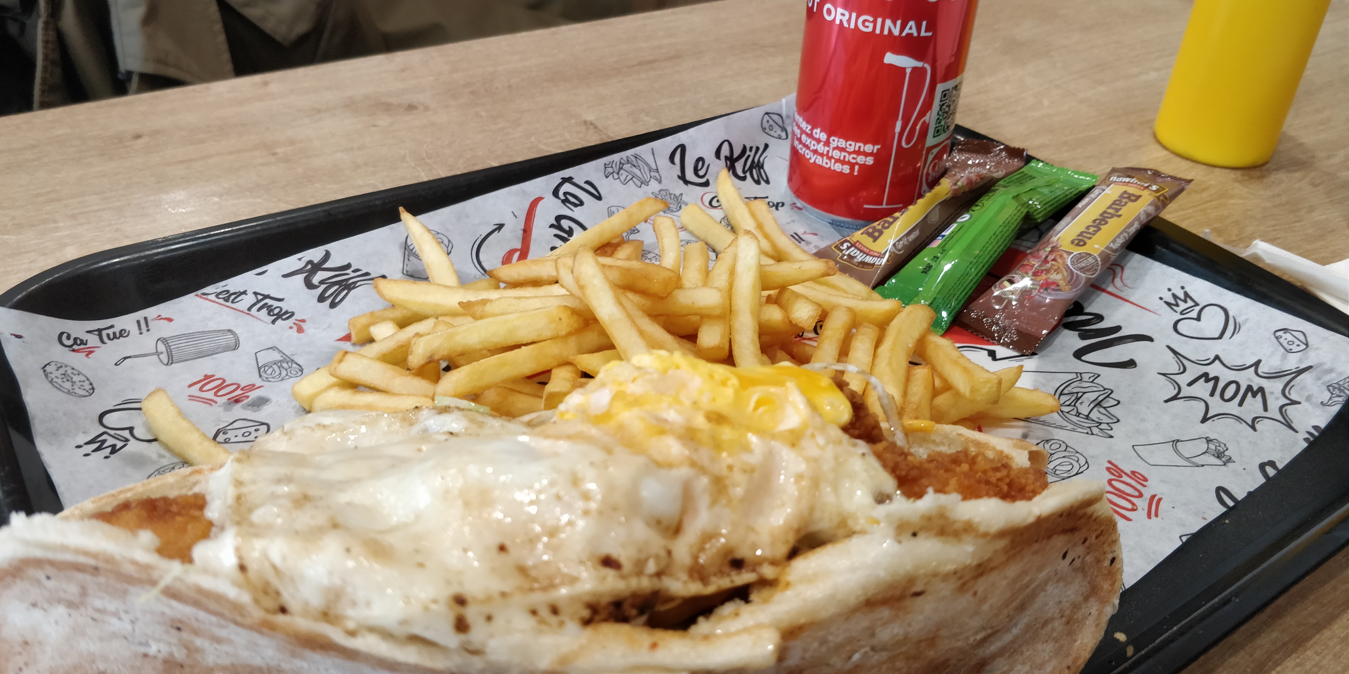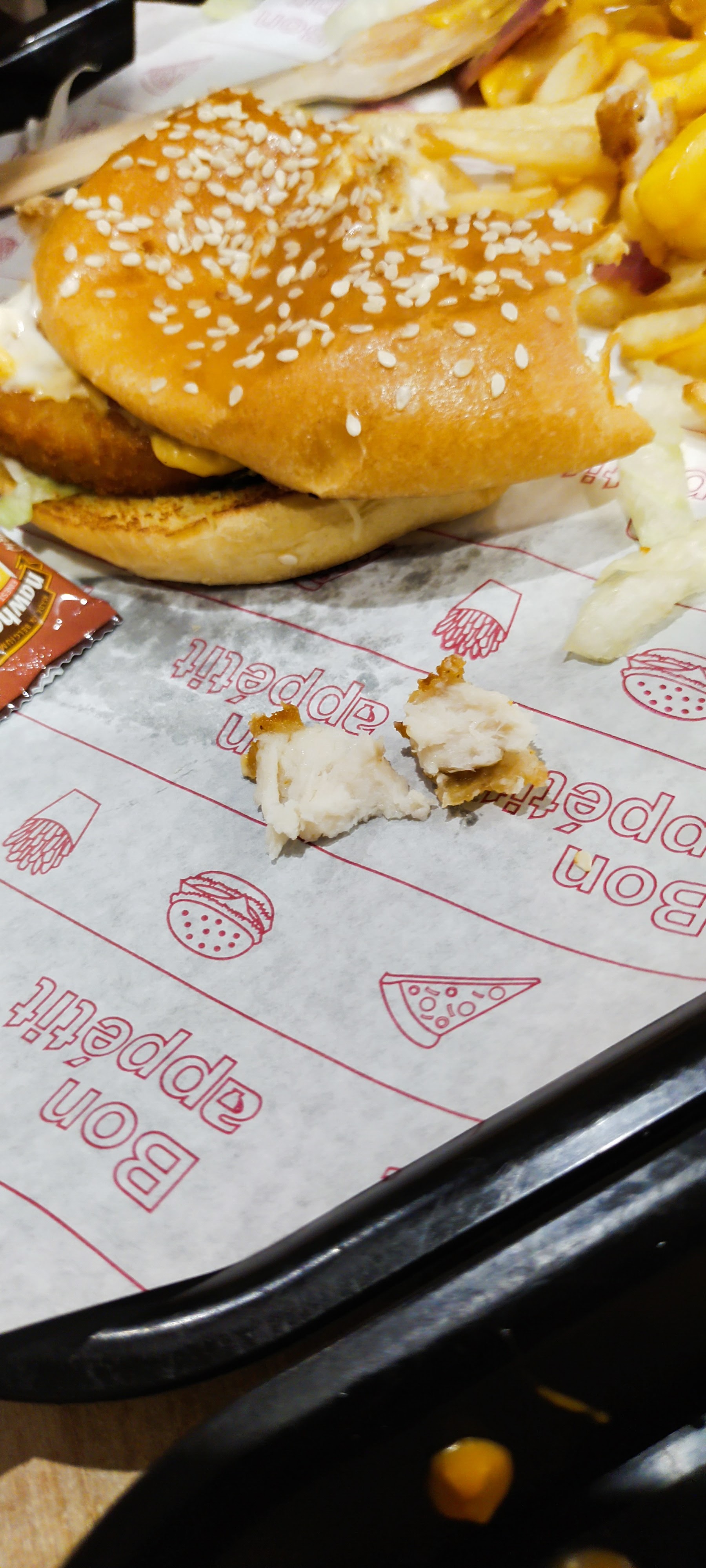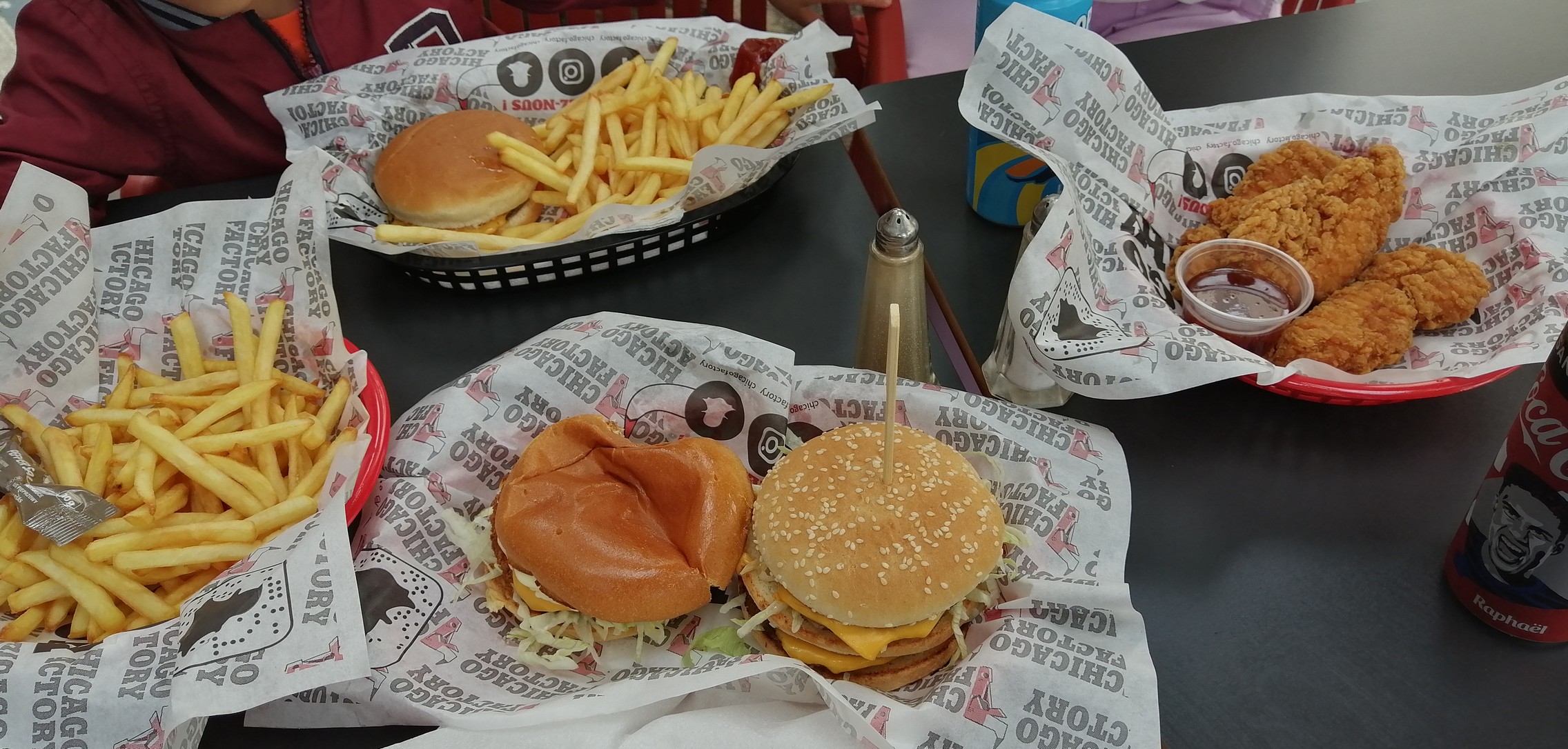 C'est un bon fastfood, très bonne quantité et bon service. Sur la photo: 1 menu C3 (2 sandwiches + frites + boisson pour 10€), 1 menu enfant (1 sandwich + frites + boisson pour 6€), 1 extra de 3 énormes tenders pour 4,5€ On en a pour 2 repas