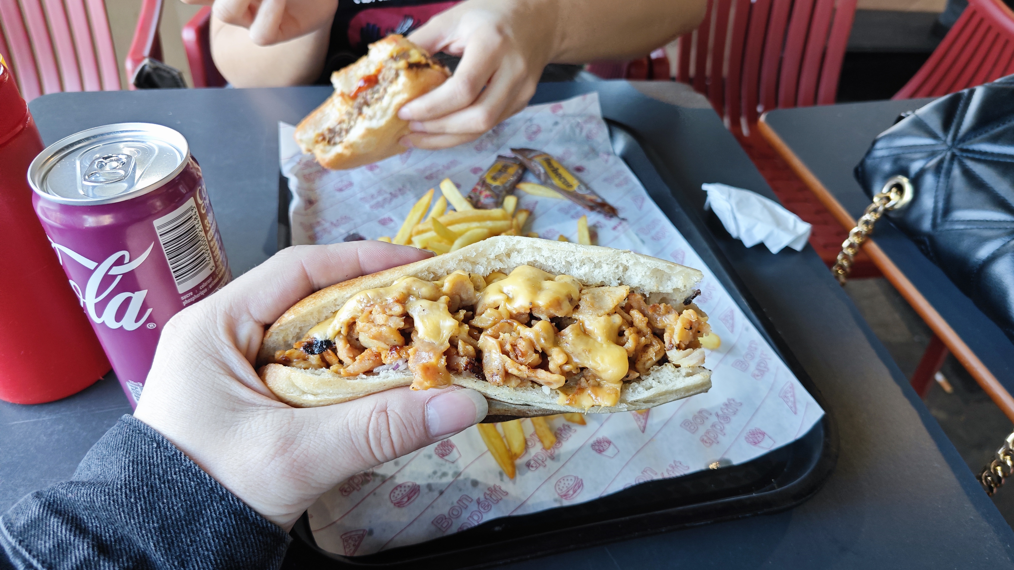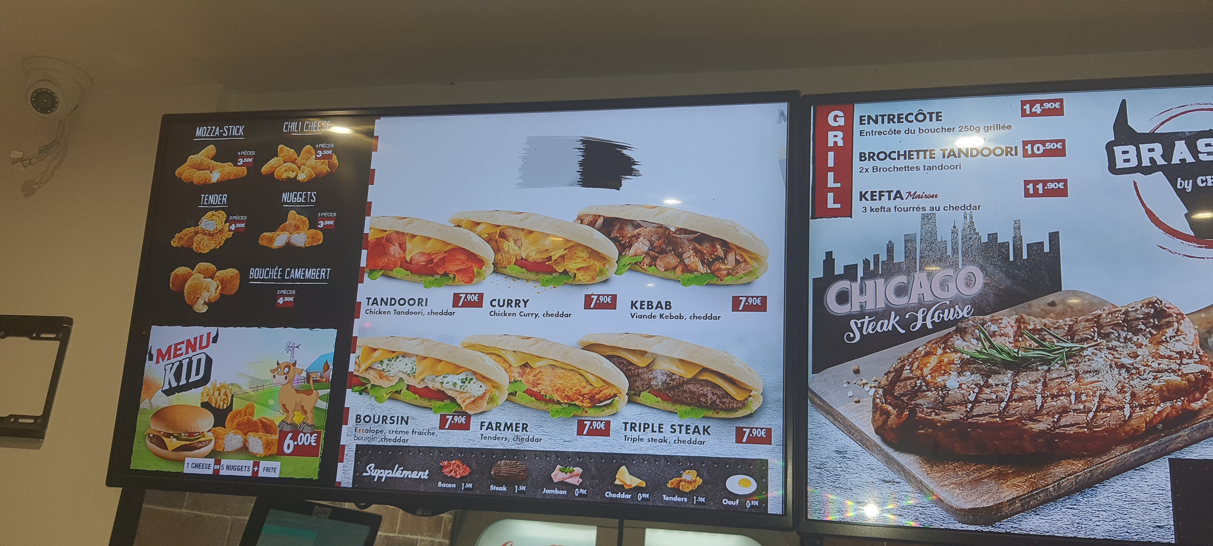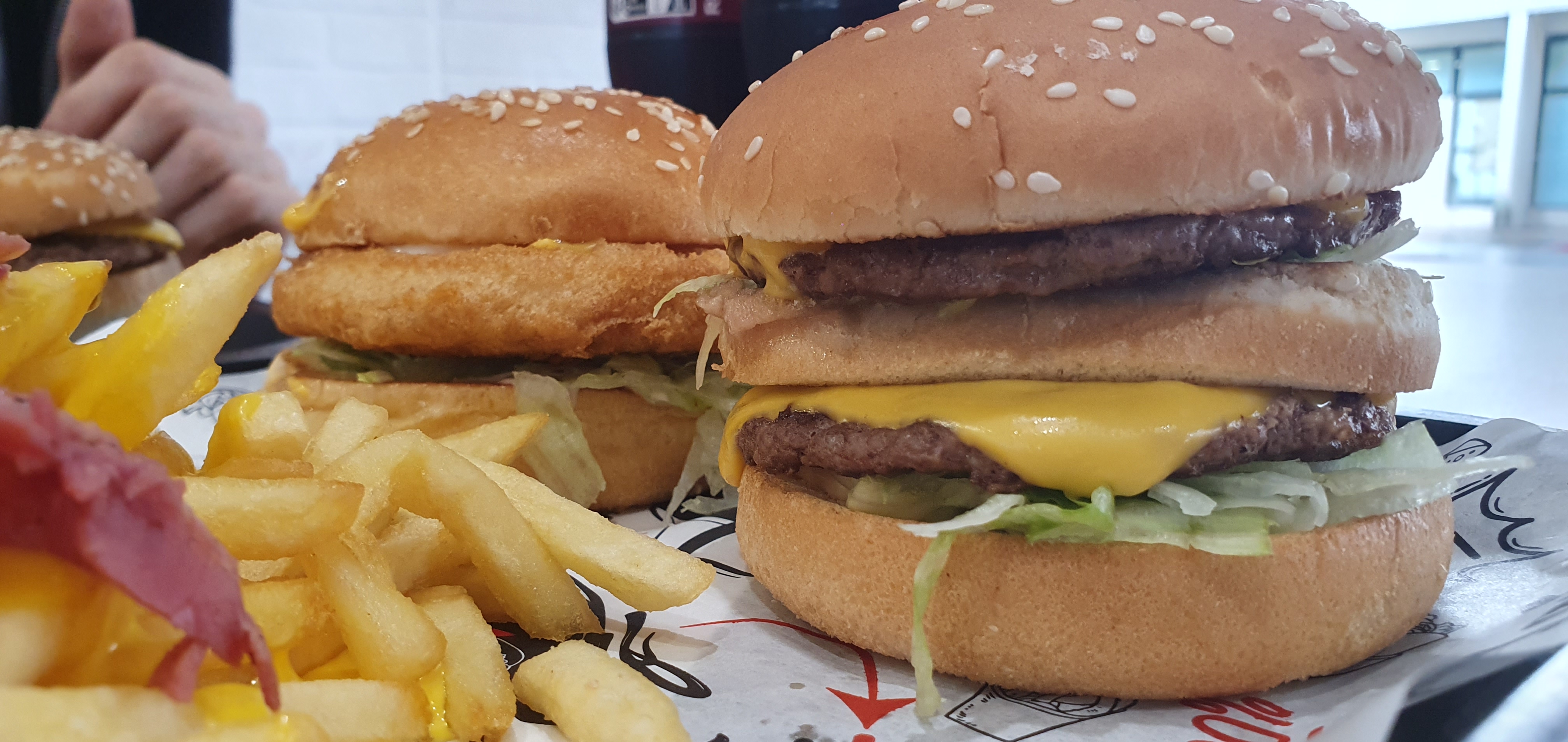 C'est un bon fastfood, très bonne quantité et bon service. Sur la photo: 1 menu C3 (2 sandwiches + frites + boisson pour 10€), 1 menu enfant (1 sandwich + frites + boisson pour 6€), 1 extra de 3 énormes tenders pour 4,5€ On en a pour 2 repas