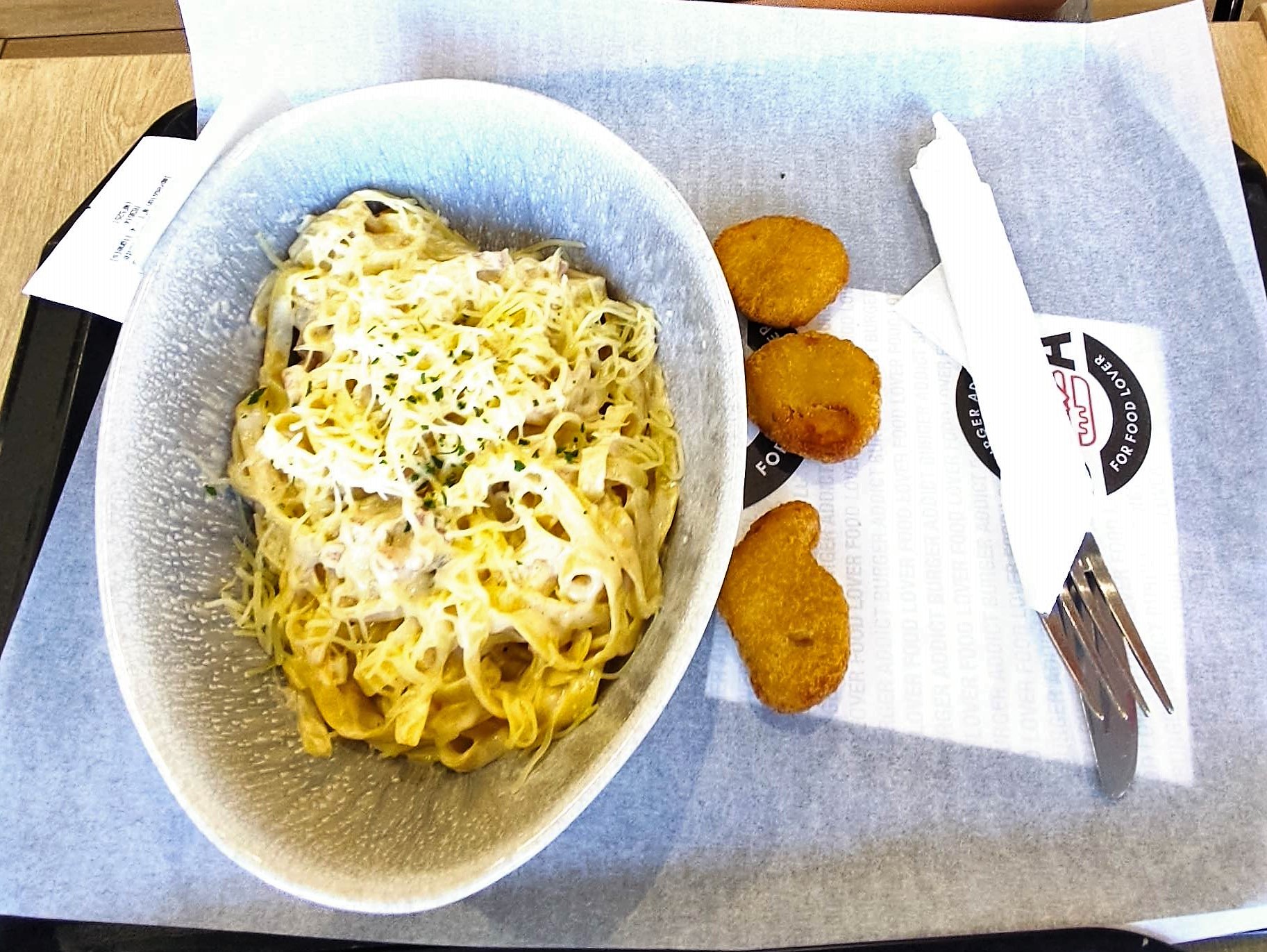 J'ai apprécié mon menu triple woops et les frites baignant dans le cheddar hier soir et mon fils les pâtes carbo, qu'il n'a pas réussi à finir tellement c’était copieux pour lui. Le temps d'attente était très correct et la disponibilité de la personne qui servait qui prenait le temps de blaguer avec les clients entre deux services et le nettoyage des tables, d'ailleurs le resto était propre, fait assez rare dans ce type de restauration pour être souligné.