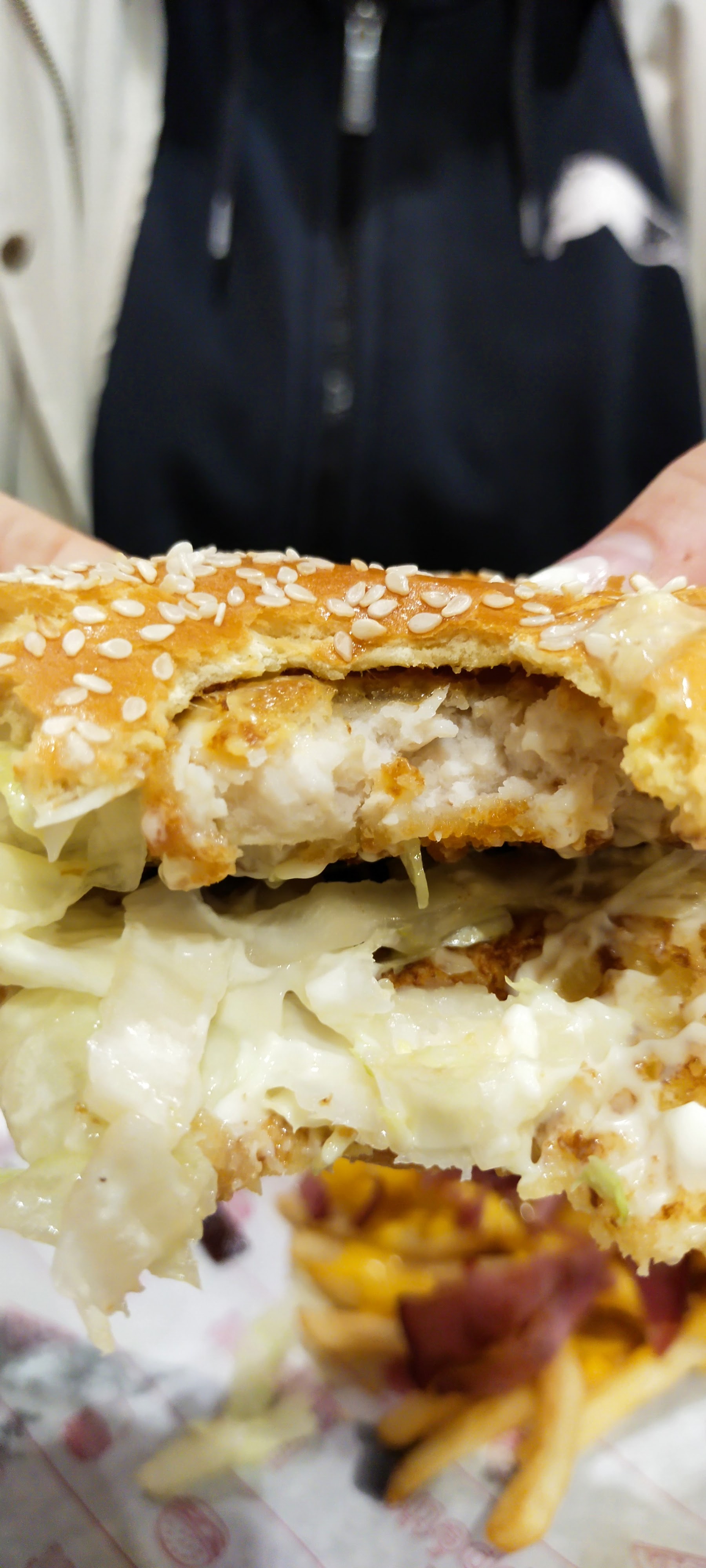 Voyant les avis Google je décide de tester et commande un Mc Chicken 🍗 Que dire? Le poulet c'est tout ce qu'il manque à ce sandwich. Entre 2 tranches de pain se trouve une forme de substitut de volaille industriel sans goût. Le sandwich est juste pâteux en bouche. Fast food qui fonctionne grâce aux gares à proximité. À FUIR !