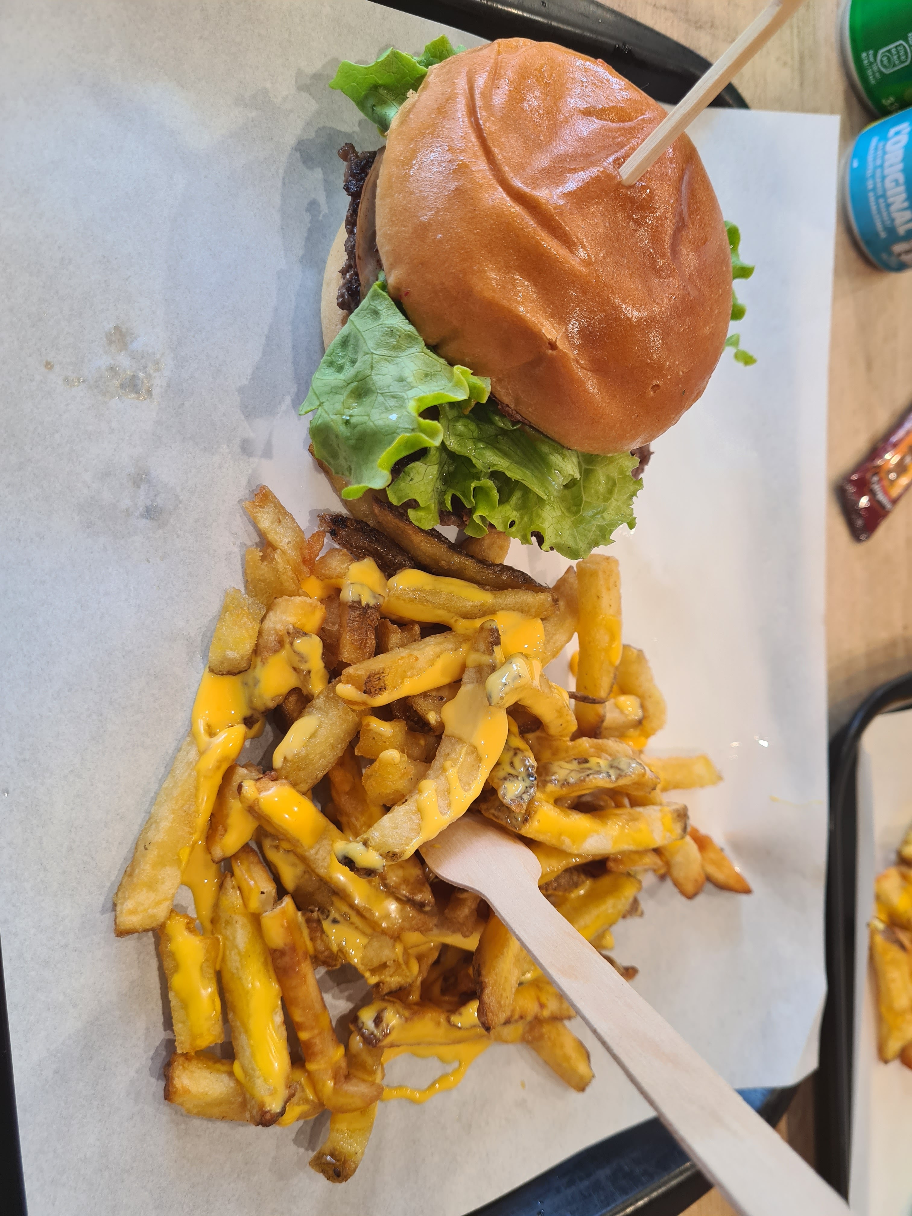 Je me suis basé sur les avis positifs, mais j'ai été grandement déçu. Le burger était insipide et sans saveur. Les frites étaient passables, mais insuffisamment cuites.