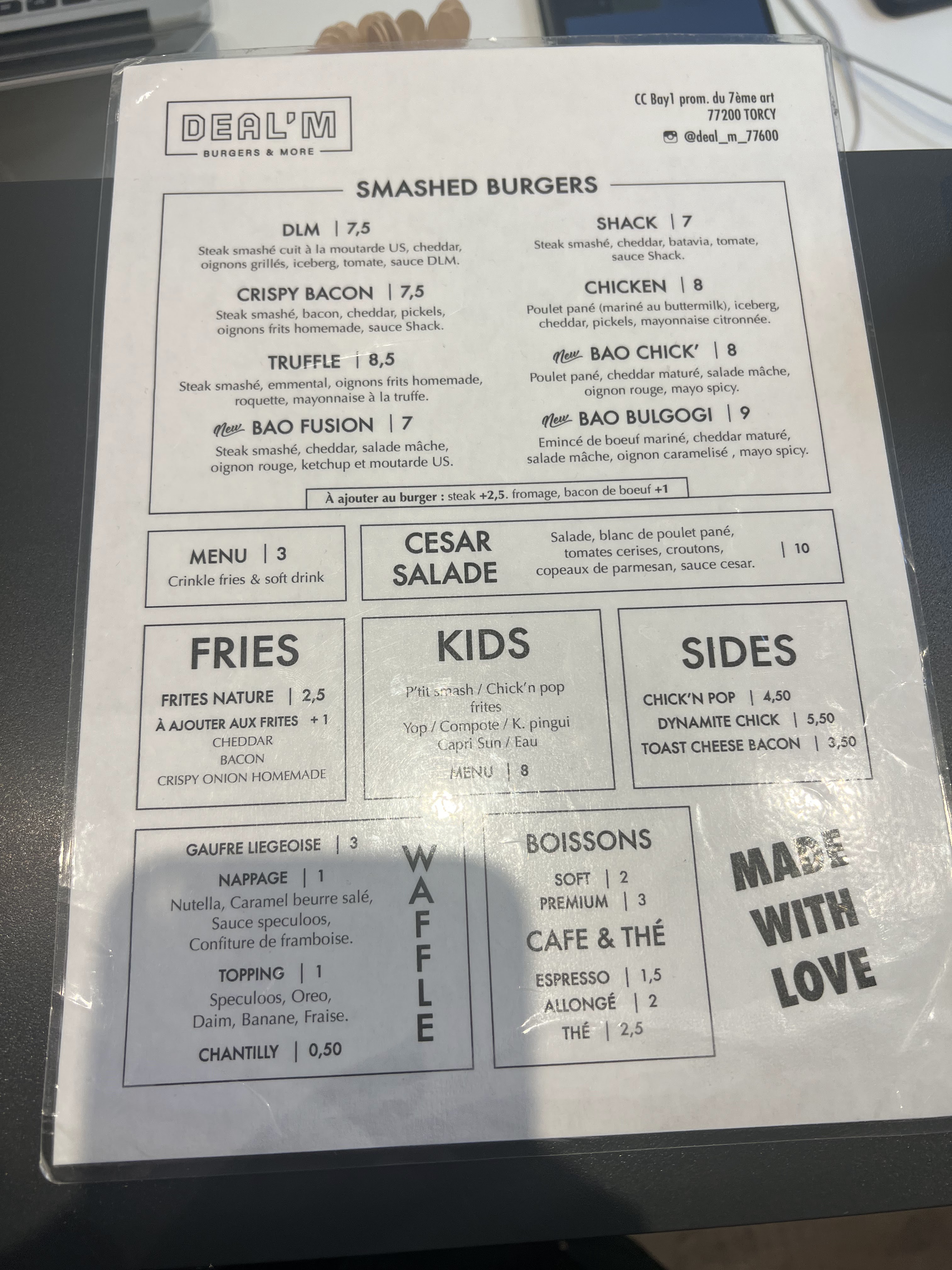 ++++++Le restaurant est d’abord très bien situé c’est à la sortie de la gare de Torcy. On avait très faim on a donc choisi ce restaurant parce que il est très bien noté sur le maps. A l’entrée je me rends compte que la personne propriétaire est un ancien joueur international dans l’équipe nationale d’Algérie : Mourad Meghni . (Les anciens vont le reconnaître). Si vous me lisez : Ça nous a fait un grand plaisir de vous croiser. Je ne suis pas objective mais je peux affirmer que l’accueil est chaleureux, le personnel souriant et à l’écoute. le Restaurant est propre. Les chaises sont ergonomiques. Nous avons donc commandé des burgers bap bulgogi ils sonnnnnnnt juste très très très délicieux , les ingrédients sont de très bonne qualité (le pain , la viande … ) les frittes super bonnes aussi. Le dynamite chicken top du top. Je vous recommande fortement ce charmant restaurant. N’hésitez pas à vous faire plaisir en dégustant les meiiiiiiilleirs burgers chez @Deal M . Bonne continuation et à la prochaine.
