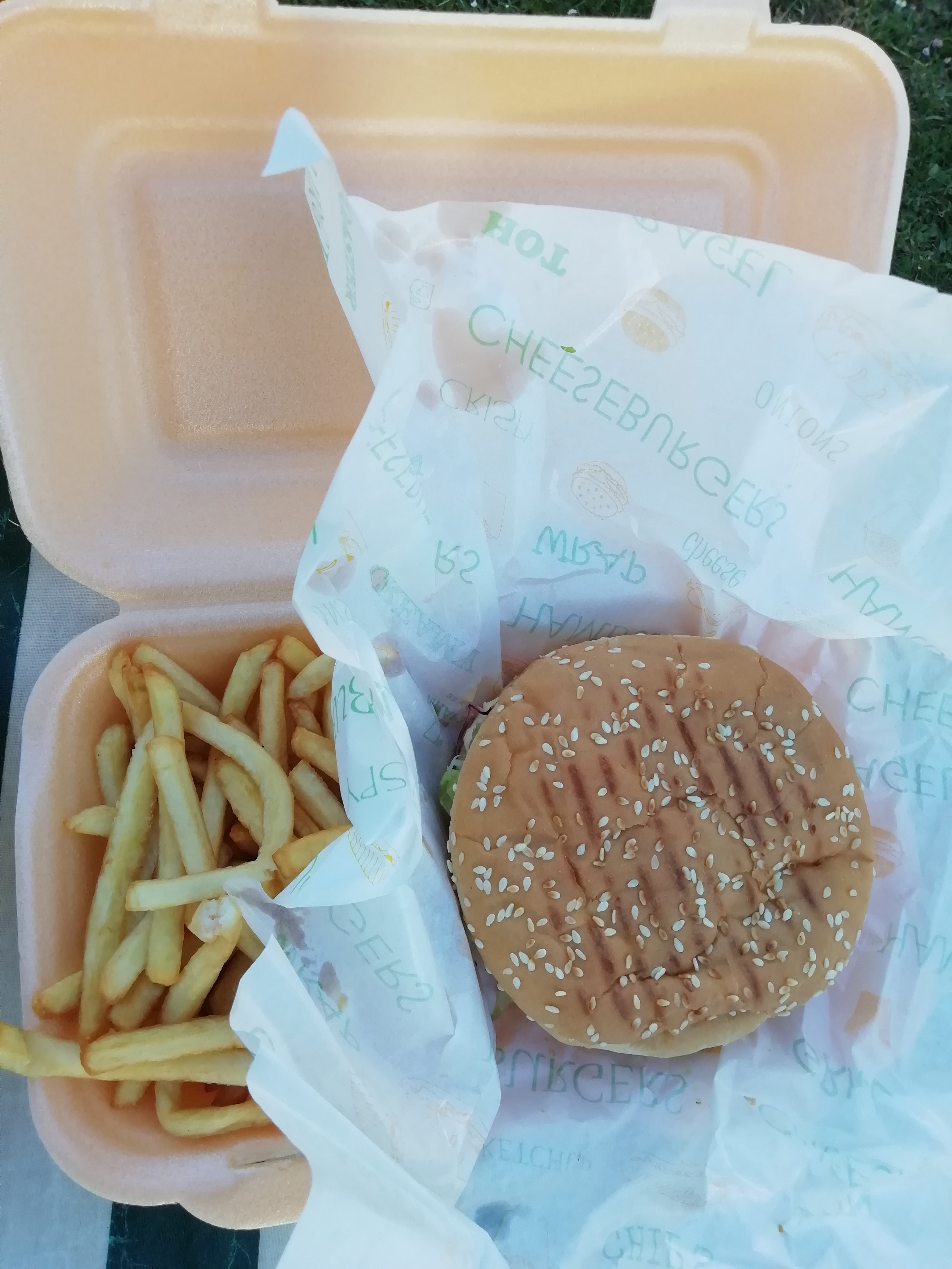 Livreur ponctuel, commande complète, du choix avec un burger végétarien et des frites de patates douces