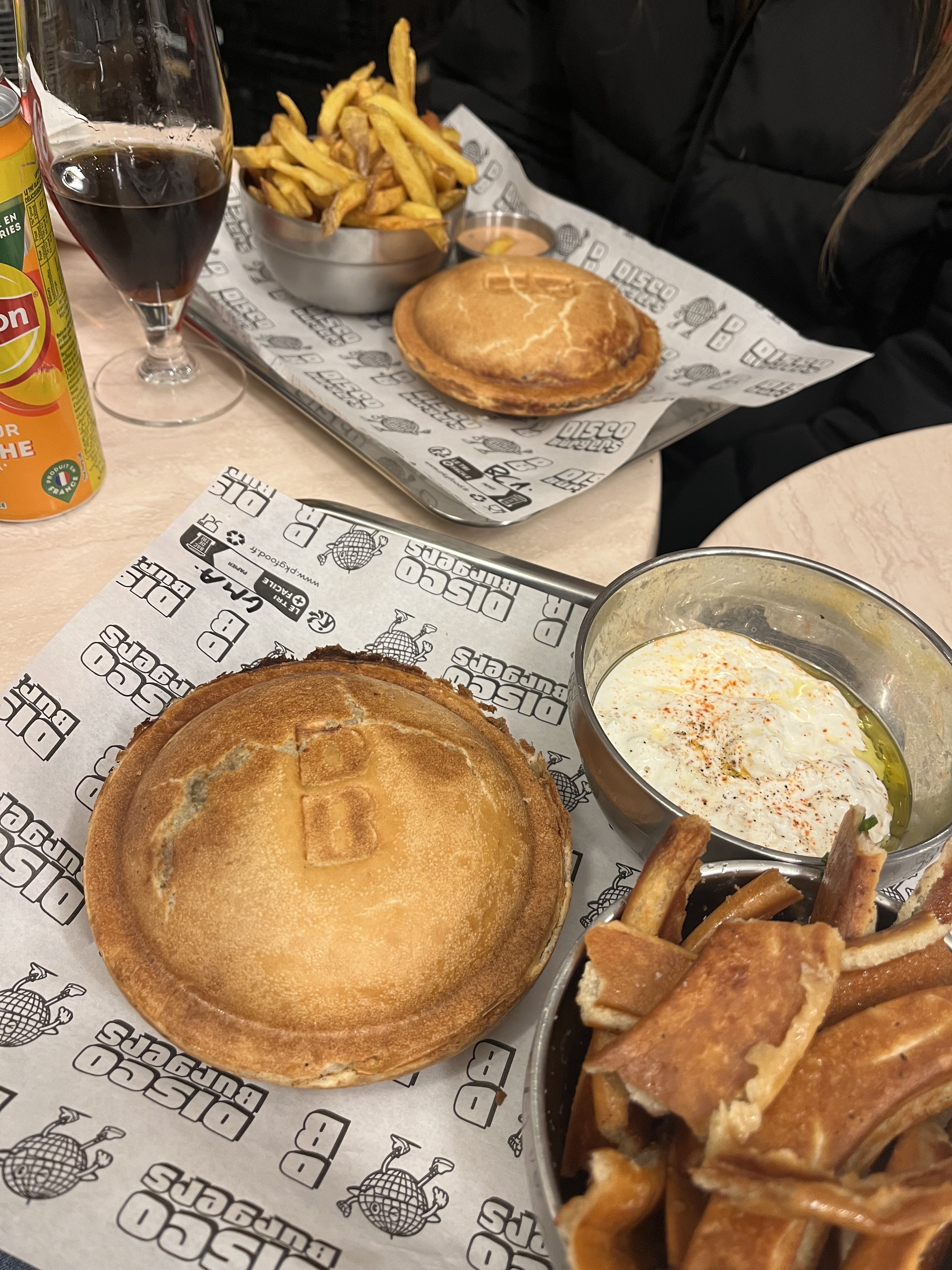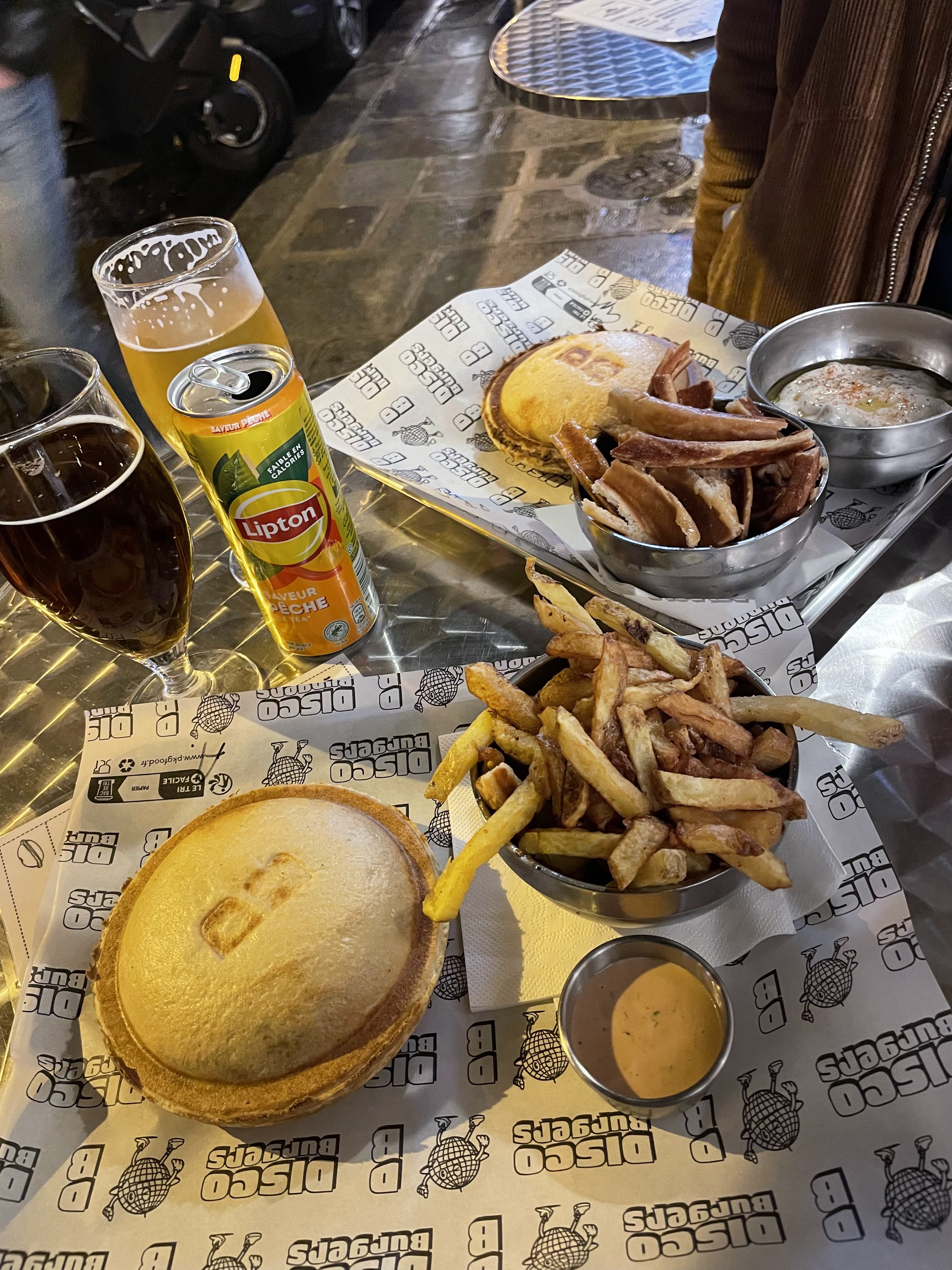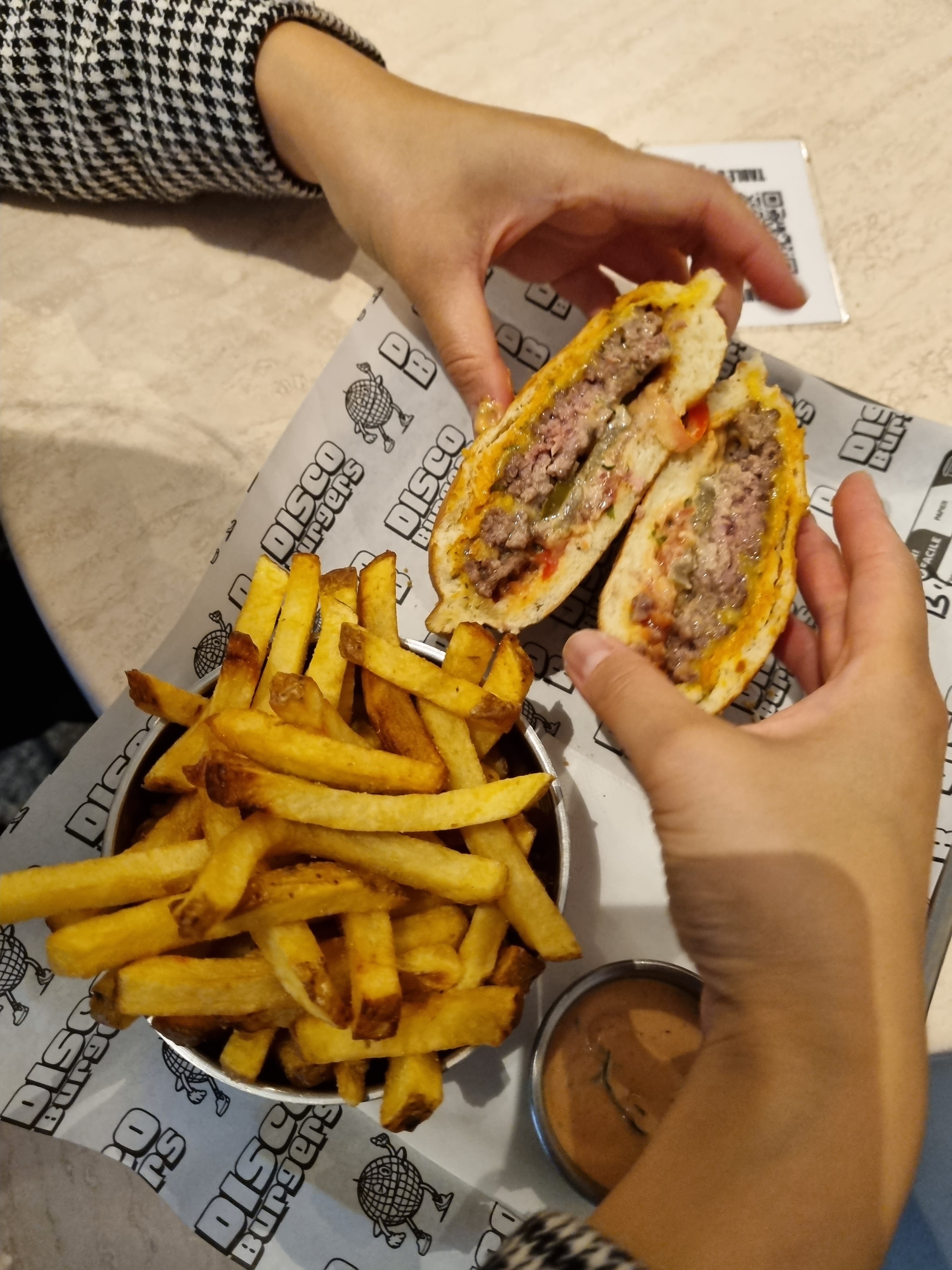 Bonne ambiance, les frittes sont trop bonnes et surtout le concept du burger est assez original car il est fermé. Les ingrédients sont bons et frais. Projet monté par deux jeunes super motivés. Des supers prix pour un bel emplacement dans le 9e. Une table dehors pour déguster le burger chaud sur le pouce ou bien au bar. Disco BURGERS a tout pour cartonner !!!! Allez y les yeux fermés.