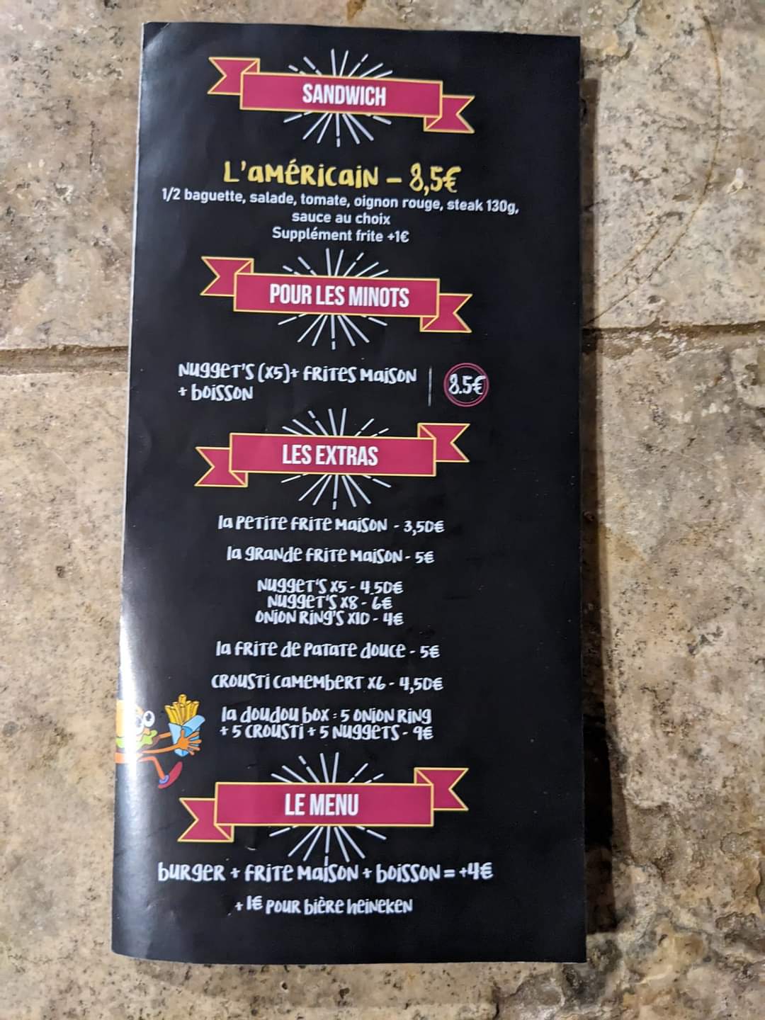 Excellent burger. Bien loin de ceux des chaînes FastFood. J’ai pris un menu avec un doudou burger que la pluie nous a obligé d’emporter pour le manger à l’abri. Les frites étaient bonnes sans plus.