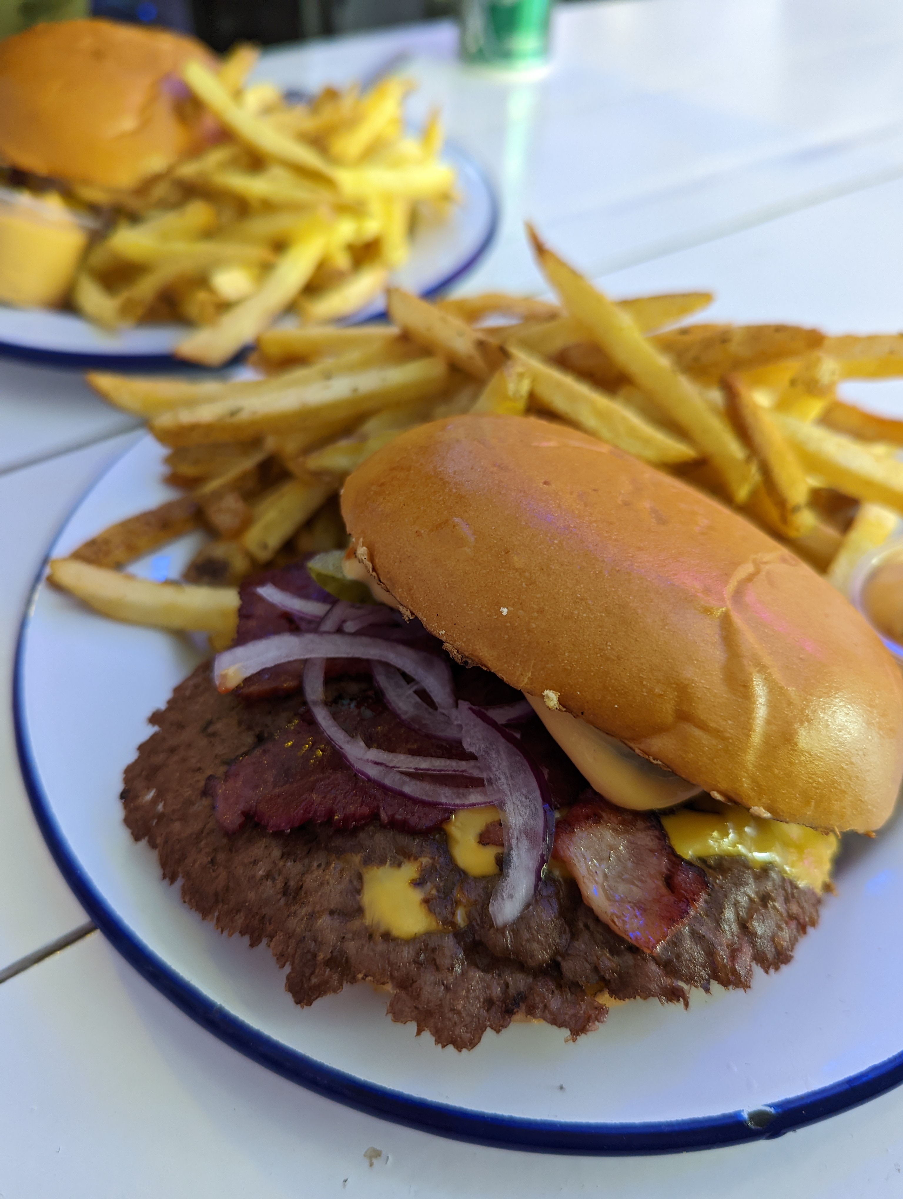 Je suis allé sur place pour commander, le salle est pas trop grande mais j'avais prévu de prendre à emporter. Ce fut assez rapide, un peu plus de 5 minutes d'attente. J'ai testé le bacon smashed en menu. Les frites sont maison et très bonnes, même 10 minutes après (j'ai pris a emporter). Le burger, super bon aussi. Il est assez costaud et c'est très frais. J'ai bien aimé le les steaks et le bacon avec un bon goût caramélisé. Une très bonne expérience gustative.