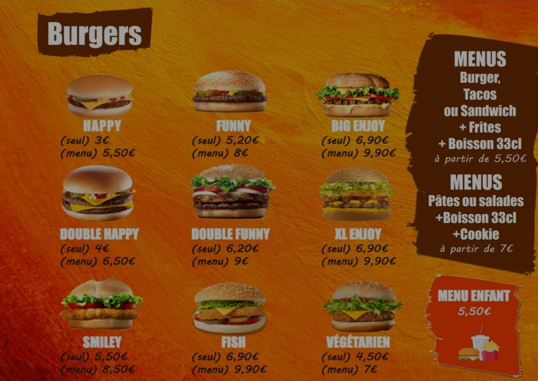 Bon, les burgers sont pas fou mais c'est correct, un peu sec c'est tout. Les frites sont plutôt bonnes pour un établissement de ce genre, par contre...ne prenez SURTOUT PAS de viande kebab ! Elle est, désolé, vraiment ignoble, c'est juste bon à avoir un arrêt maladie de 2 jours. Je vous jure que j'exagère à peine, c'est inhumain de servir ça.