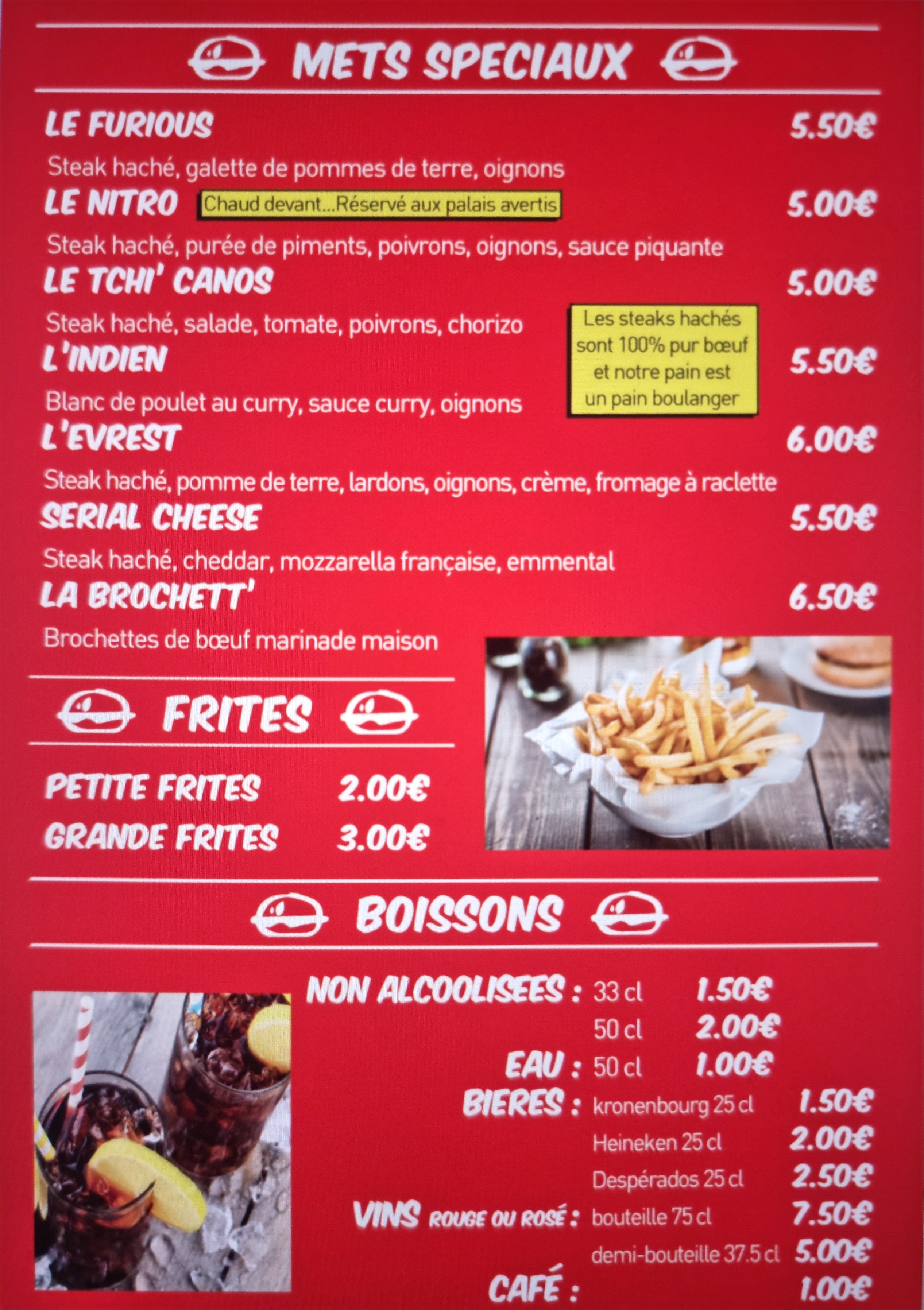 Bonjour, nous sommes désolés que notre qualité de viande vous ait déçue, mais nous pouvons vous certifier que nous fournissons à nos clients de vrai steak haché surgelé (certes pas d'une grande marque) pour pouvoir garder un rapport qualité-prix très acceptable au vu de l'augmentation importante du prix de la viande, mais en aucun cas du steak hamburger mélanger à je ne sais quoi comme certains snack peuvent vous servir et nous pouvons vous assurer que malgré ça leurs tarifs sont beaucoup plus élevés que les nôtres. Mais nous avons très bien compris que vous étiez de passage dans notre région et que pour vous le prix n'était pas une priorité, vous avez la chance de faire partie d'une grosse société qui vous rembourse vos frais de repas, je pense que si ça sortirai réellement de votre poche votre critique sur la qualité de nos produits serait moins acerbe, nous vous remercions tout de même pour le compliments sur la sympathie du personnel.