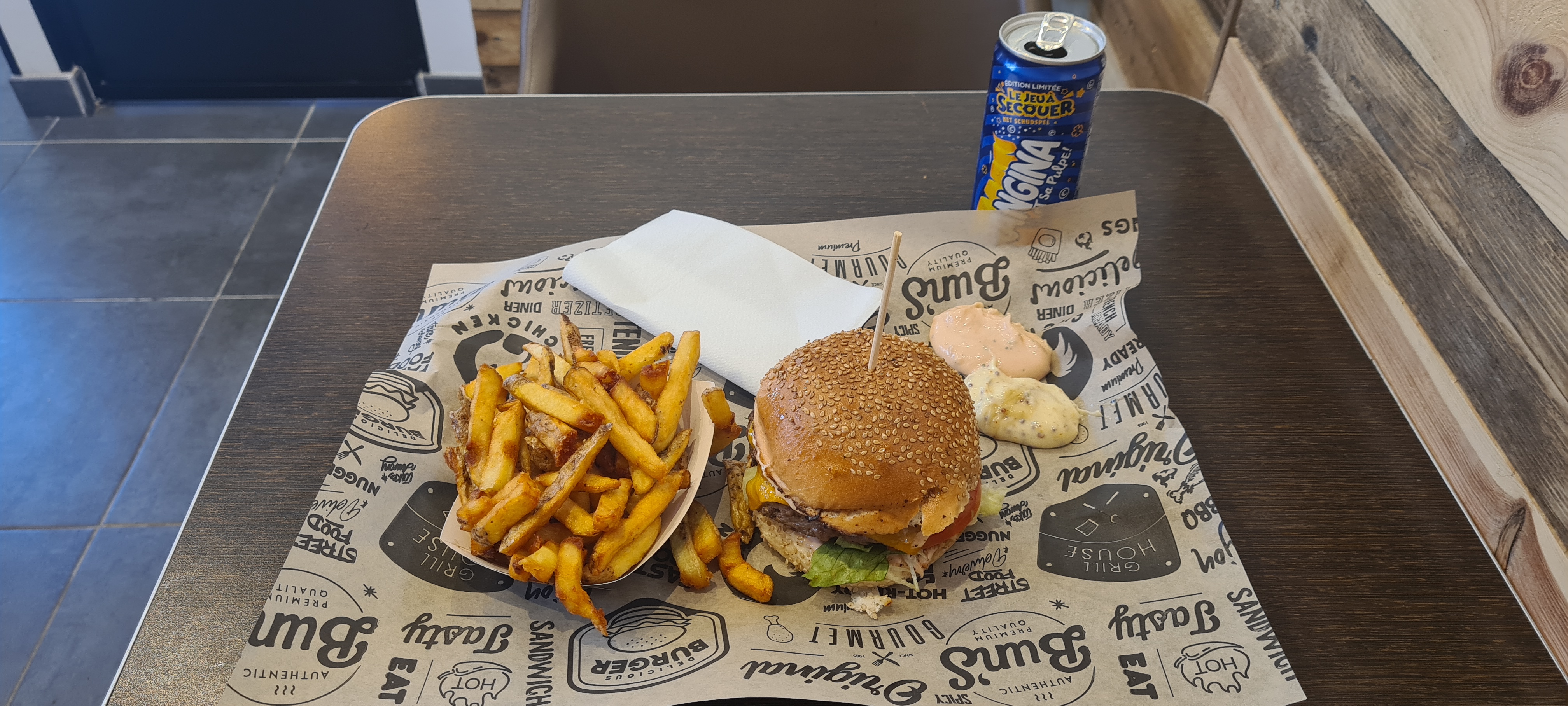 Un délice accueil au top et je vous recommande le frite au cheddar avec du vrai cheddar et ça ce n'ai pas négligeable. Burger delicieux et sauce maison trop bon ! En somme des produits qualité !!! Et un vrai savoir faire parfait! ! Et merci pour la découverte du sanpellegrino figue de barbarie ;)