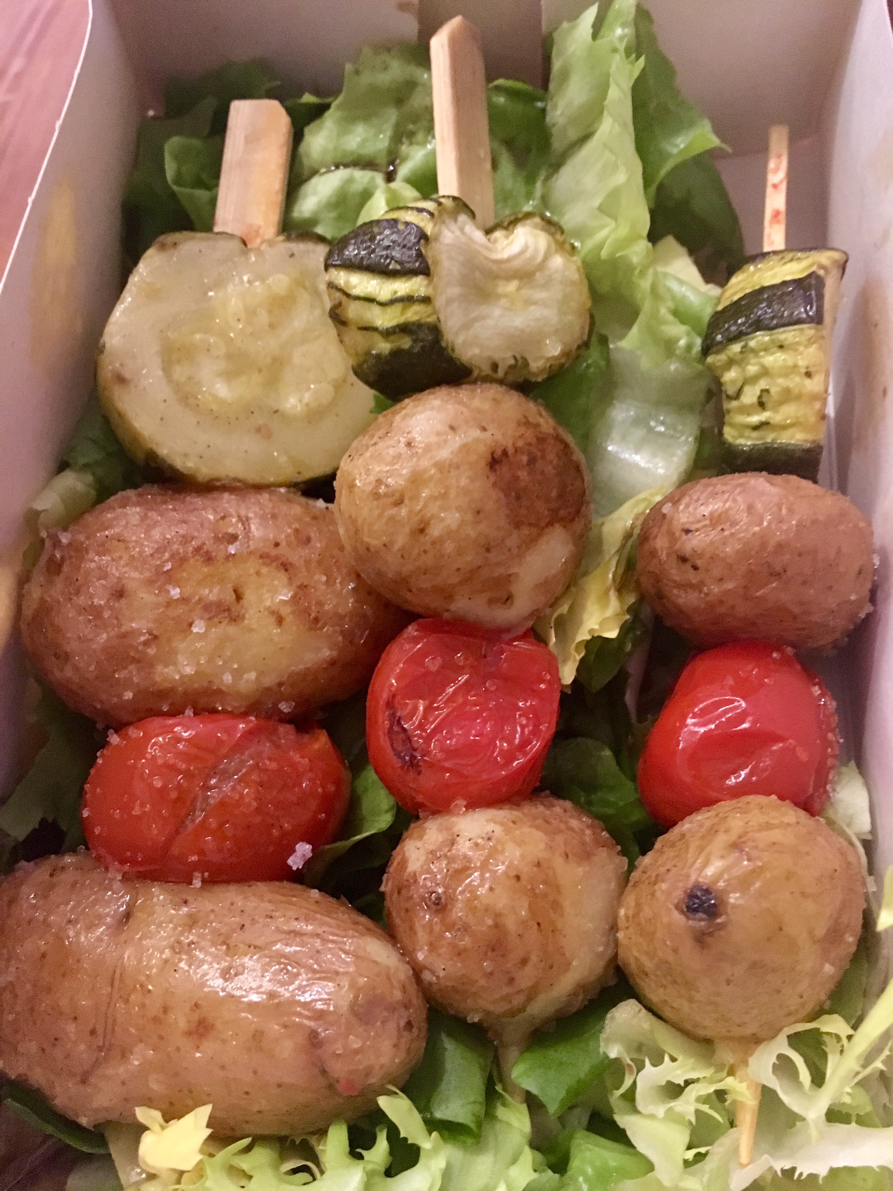 Commande à emporter, il n’y avait plus de brochettes de légumes mais une alternatives satisfaisante a été trouvée et j’en ai été ravie. Et le burger ! Aïe aïe aïe un délice, pain très bon, l’équilibre des saveurs était parfaites pour moi, c’était ni trop ni trop peu, J’y reviendrais sans hésiter !