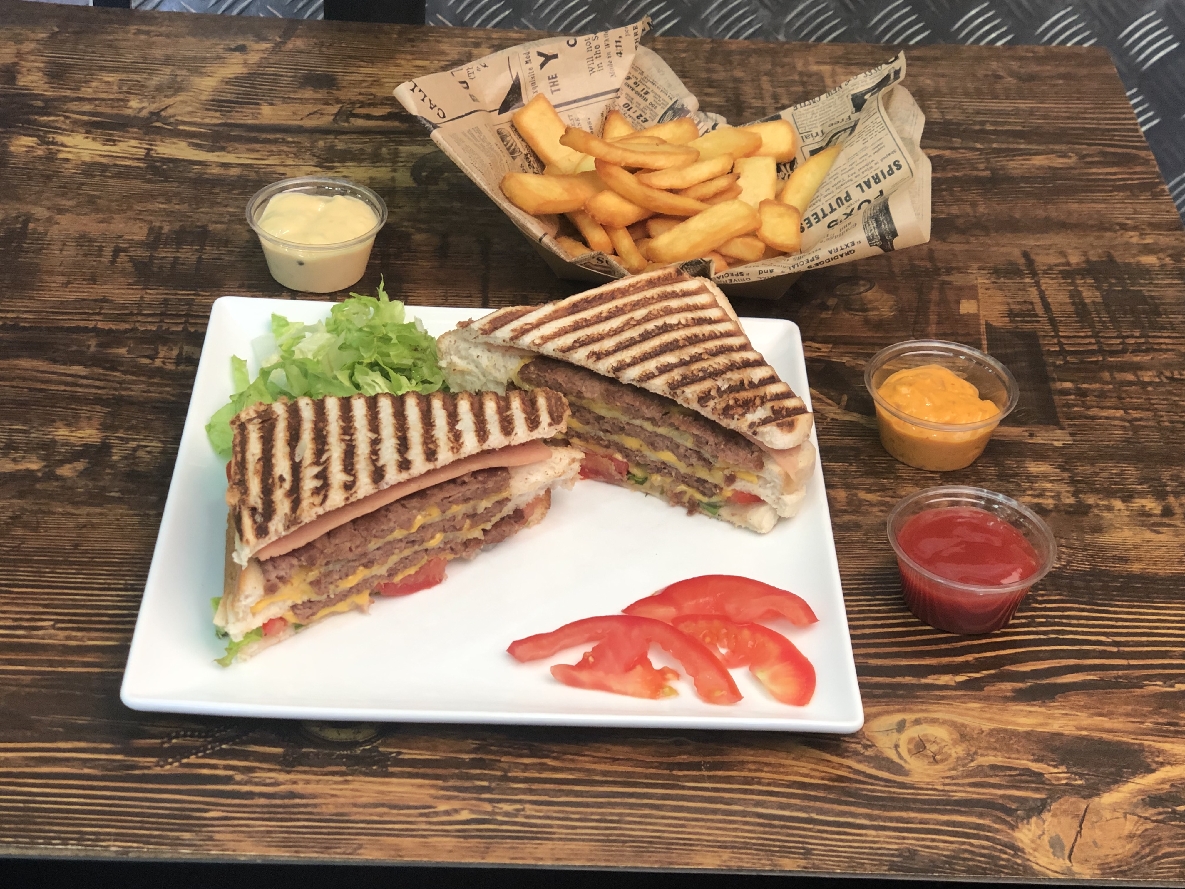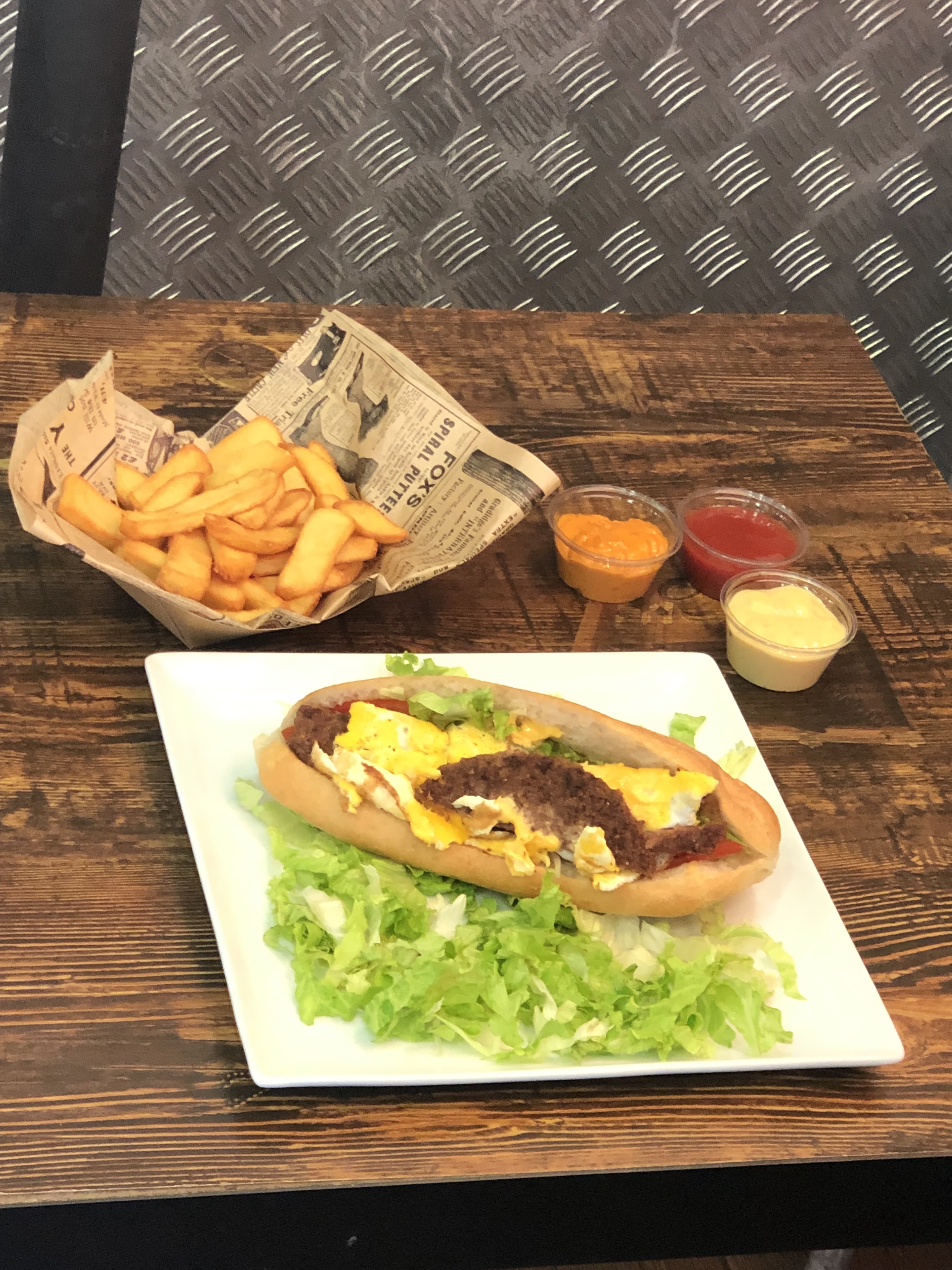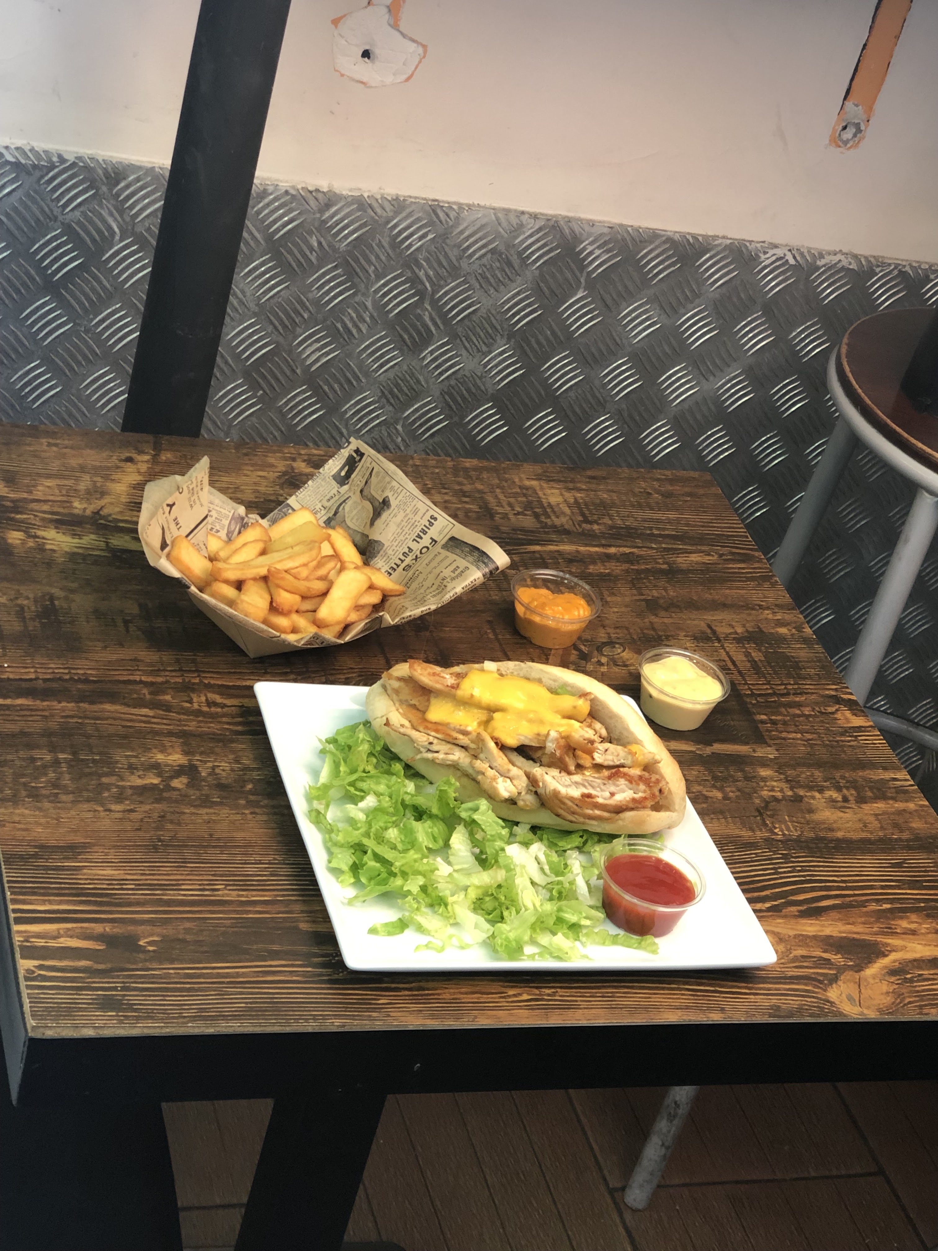 Honnêtement très content. Je ne parle pas un peu de français mais j'ai réussi à communiquer avec le personnel. J'ai eu un assez gros burger avec des frites et une boisson pour seulement 7 €, je le recommanderais aux personnes séjournant dans des auberges de la région qui ne peuvent pas se rassasier en dépensant 20 € pour une salade au 1er étage. J'ai également apprécié qu'ils utilisent une machine à panini et du fromage à l'américaine, ce qui signifie qu'il était fondu, également généreux en sauces. Contrairement à d'autres critiques, les frites étaient frites et les galettes de hamburger étaient plutôt savoureuses, nettement meilleures que celles de McDonald's.