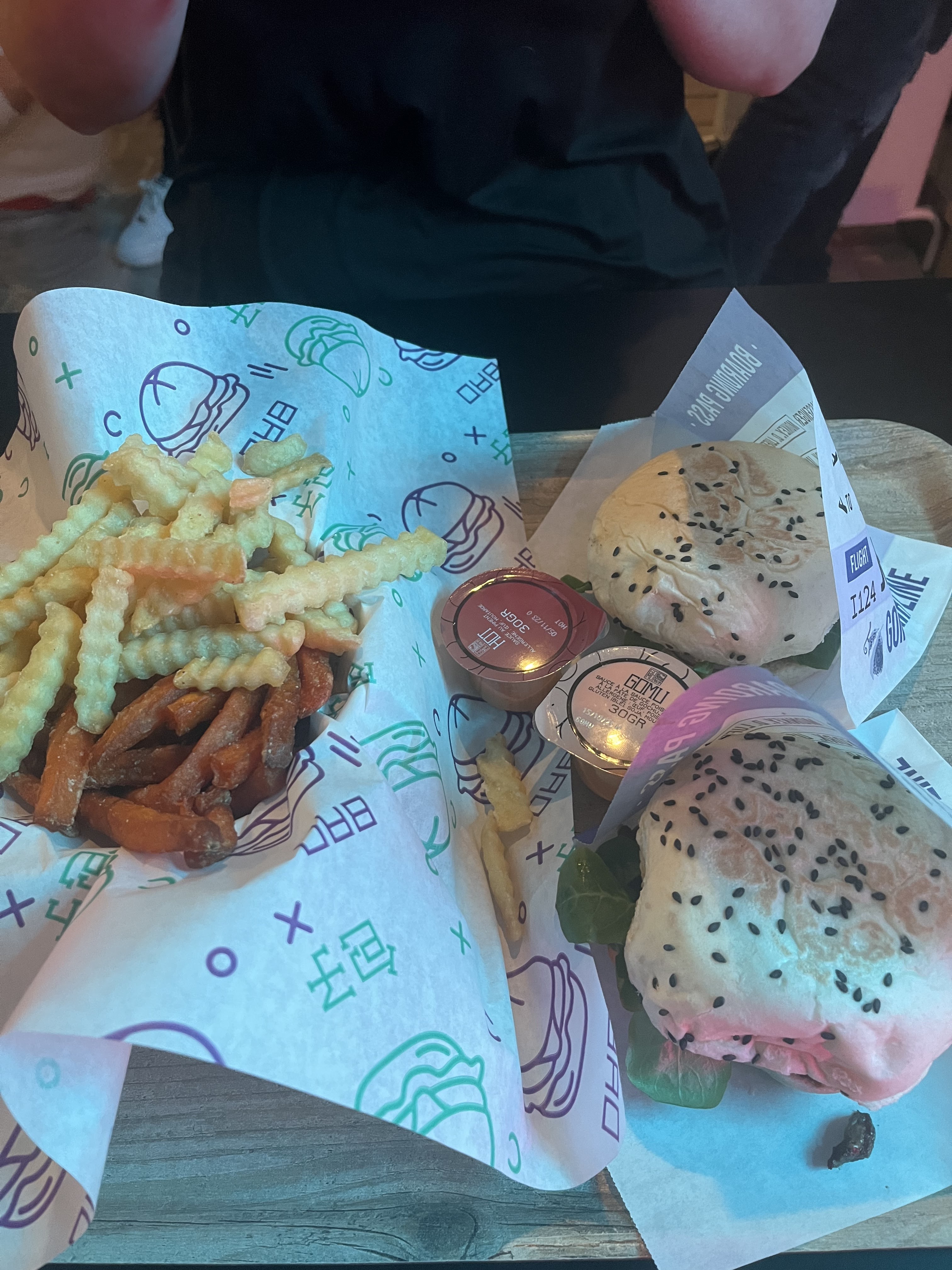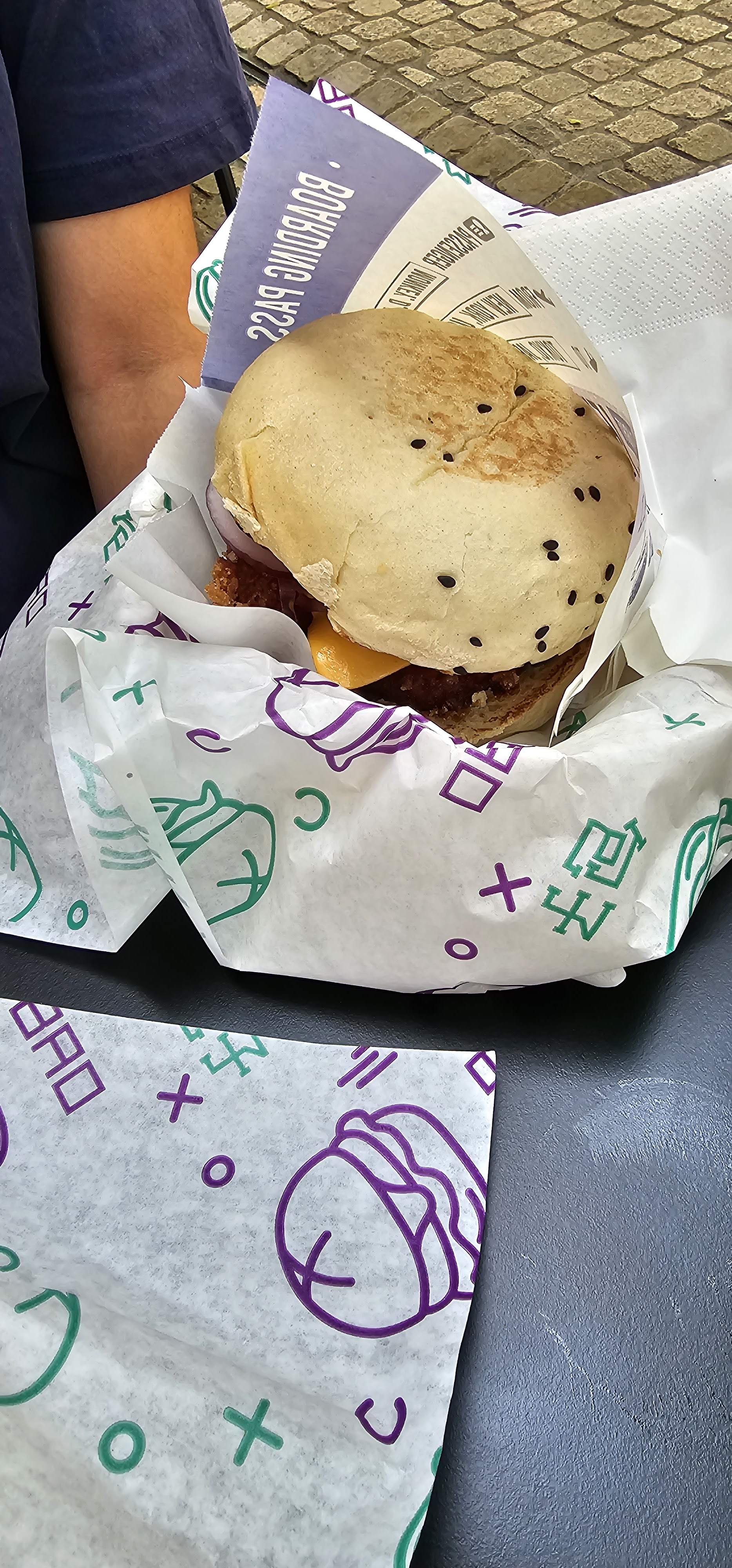 Les burgers sont originaux, mais désolé les portions sont beaucoup trop petites, vraiment dommage car les saveurs sont là. Les frites ne sont pas faites maison ( Du moins celle comprise de base ) elles sont toutefois correctes pour du surgelé, aucune sauce comprise ( 0.40€ la sauce ) un peu dommage, cela dit les sauces sont bonnes dont le prix est raisonnable, le prix des boissons est aussi très correct, des boissons un peu plus originales pour compléter l'expérience pourraient être un plus quitte à les payer un peu plus chère. concernant le lieu là ça devient compliqué, la salle est petite et extrêmement bruyante, il y a très peu de place nous y sommes allés un midi en semaine c'était totalement plein nous avons réussi à prendre les dernières places en salles, malheureusement sauf en hurlant entre la musique et les autres clients impossibles de s'entendre. Le service était un peu long mais contenu du monde je ne peux pas leurs en tenir rigueur, le staff était tout de même accueillant et sympathique. J'enlève donc une étoile pour les lieux, et une autre pour les portions même si je le répète les burgers est vraiment délicieuse, mais beaucoup trop petite.