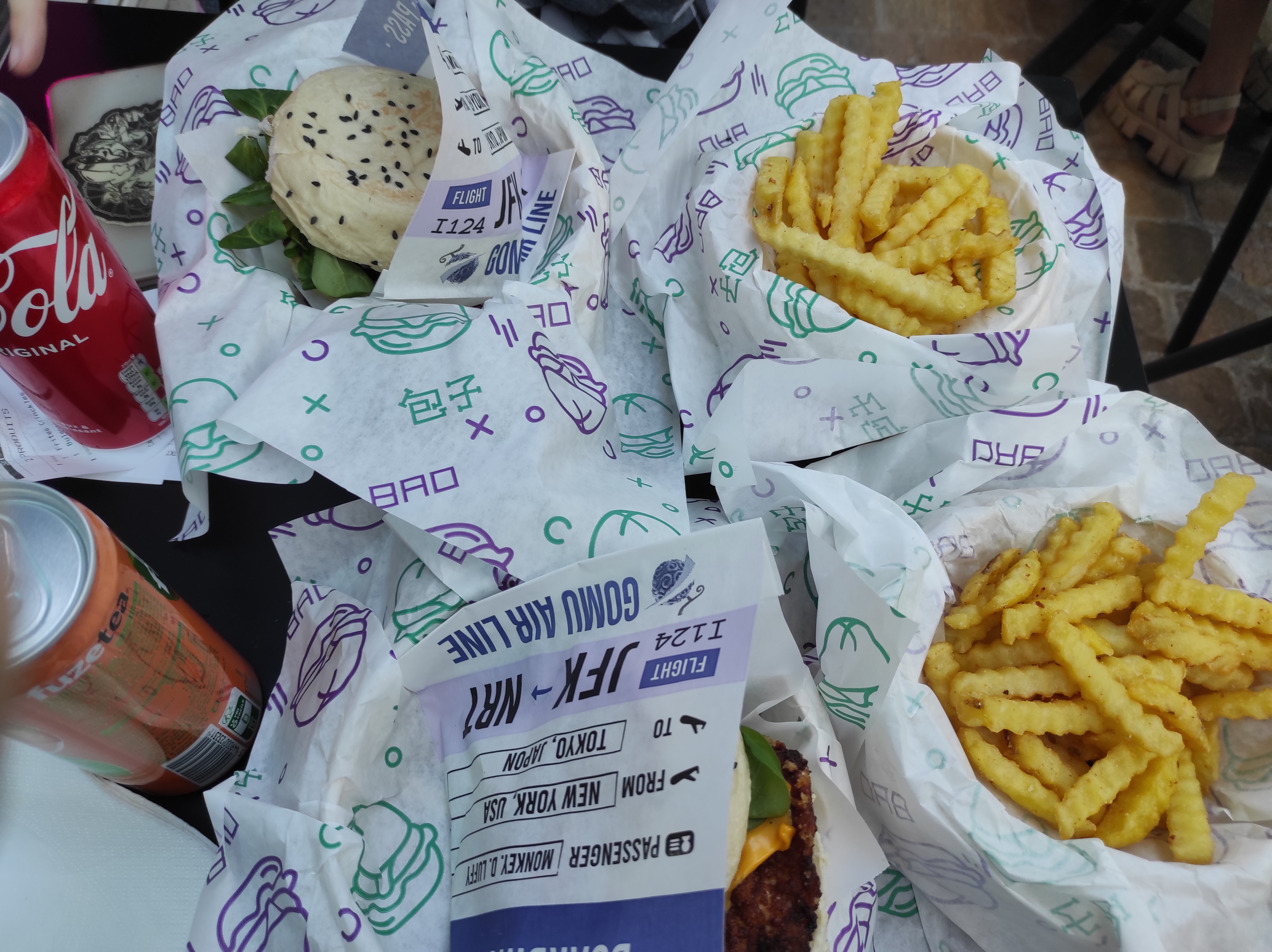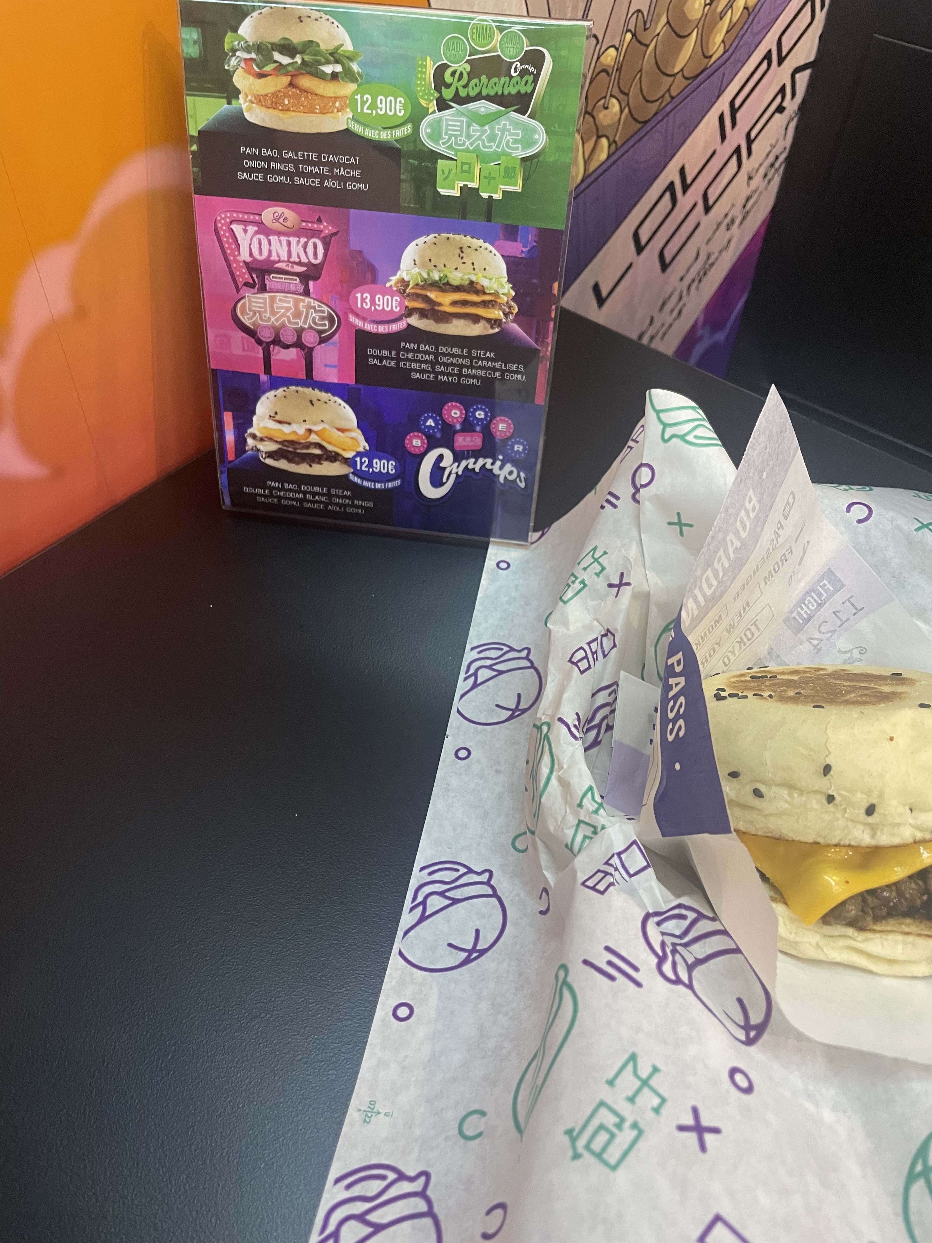 J'y suis passé avec ma copine pour tester les nouveaux burgers qui étaient très bien mis en valeur sur les affiches de la façade du restau', bonne ambiance (musique, couleurs), c'est propre et les employés sont accueillant et bienveillant, en revanche après avoir goûté les deux menus que nous avons achetés pour 24,90€ au total dont 12.90€ le mien (menu yonko et menu ebi), nous sommes assez déçus, le ebi pour ma part était très peu garnis, en plus du fait qu'il soit très petit pour un burger ! (1 tomate, 2 petits oignons rouge et une petite salade avec le palet de crevette), avec une portion de frites très minime et non salés, le bao était croquant, pas très tendre finalement et un peu fébrile.. Au niveau du goût il n'y avait que la crevette du coup.. (mon menu en photo, je l'ai juste sorti et n'ai strictement rien touché pour vous donner une idée, c'est littéralement du vol à ce stade.) Ma copine a également été déçu de son burger yonko, la sauce n'était pas à son goût, un peu amère, assez décevant concernant la présentation des burgers aussi qui avait l'air magnifique sur les photos.. Dommage parce qu'en les regardant c'est vraiment deux antagoniste entre ce que nous avons vu sur celles-ci et entre ce qui nous a été préparé...