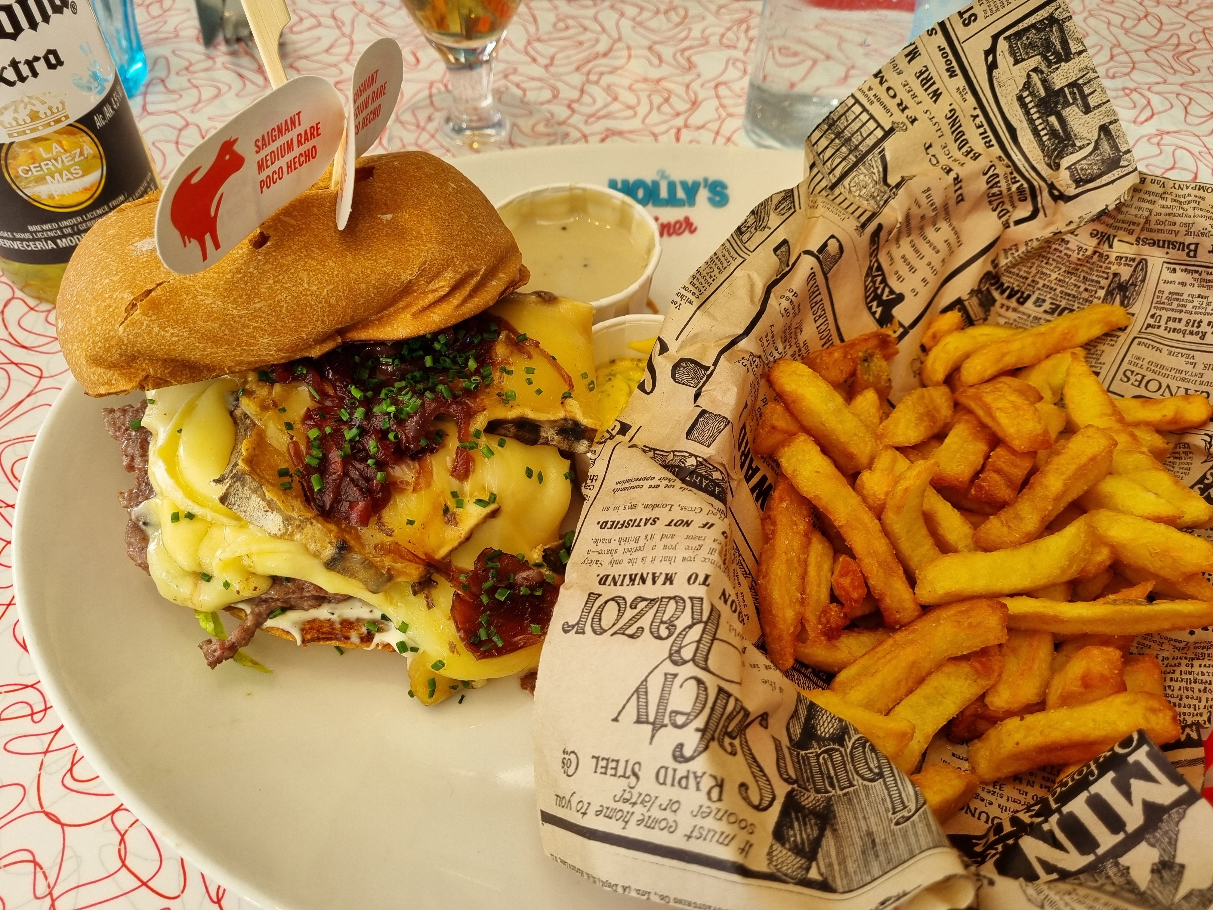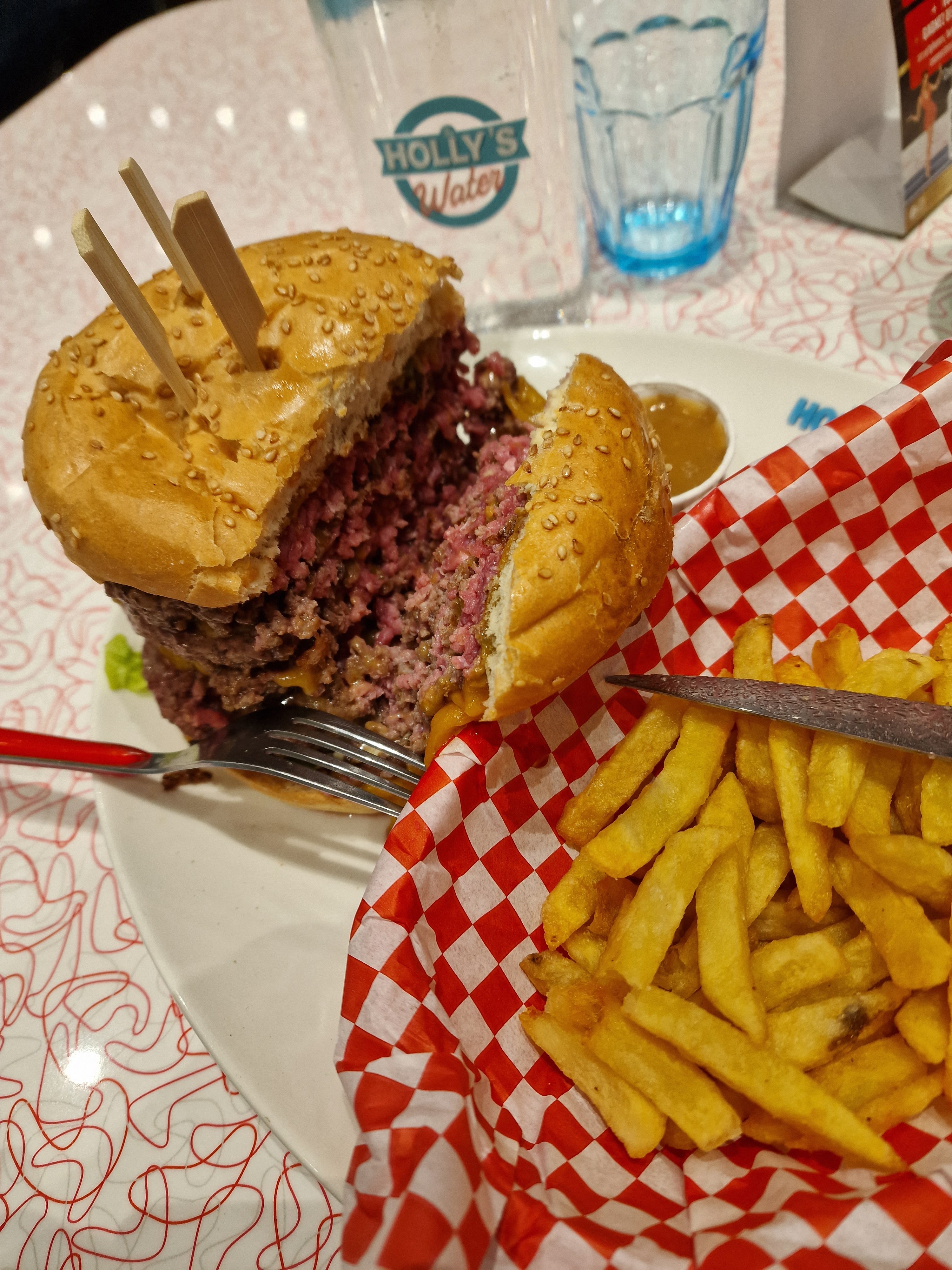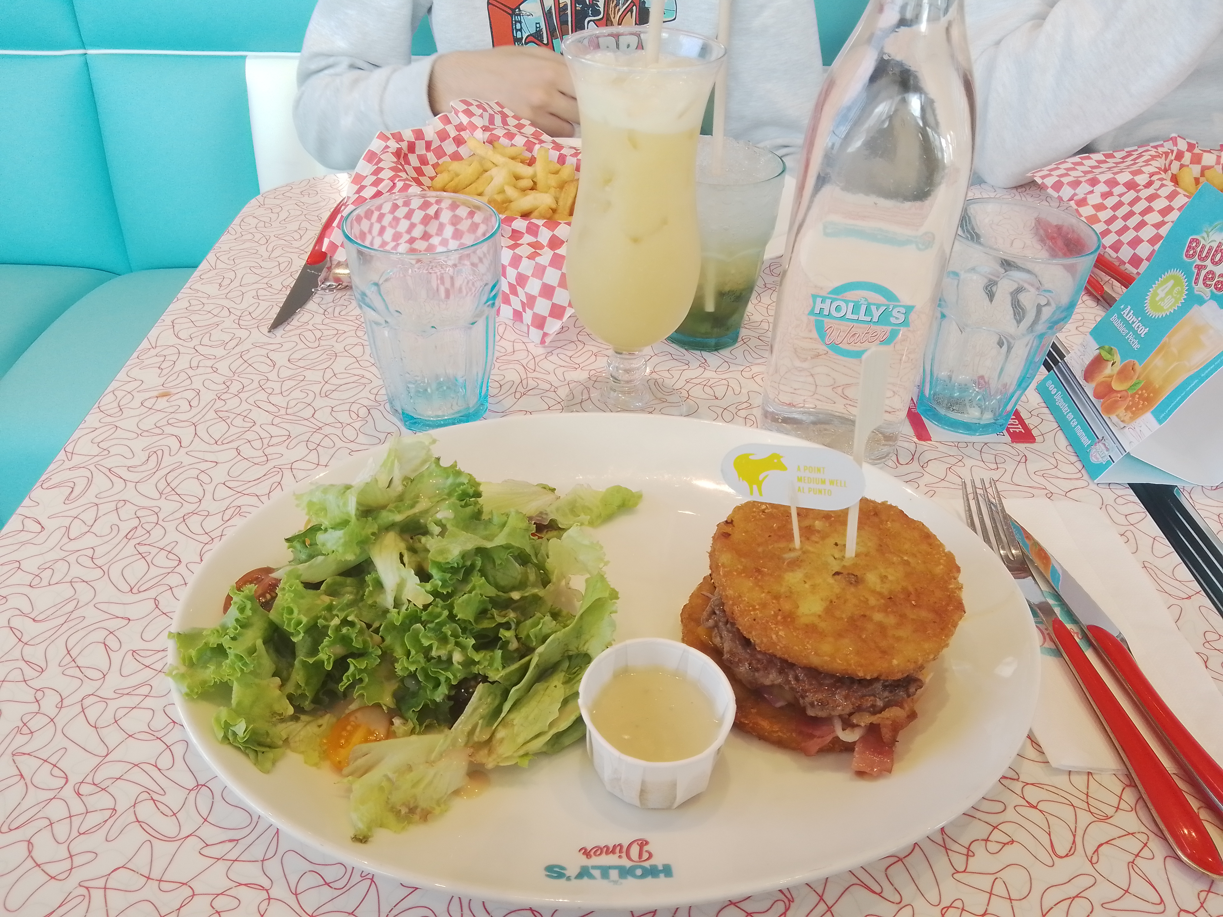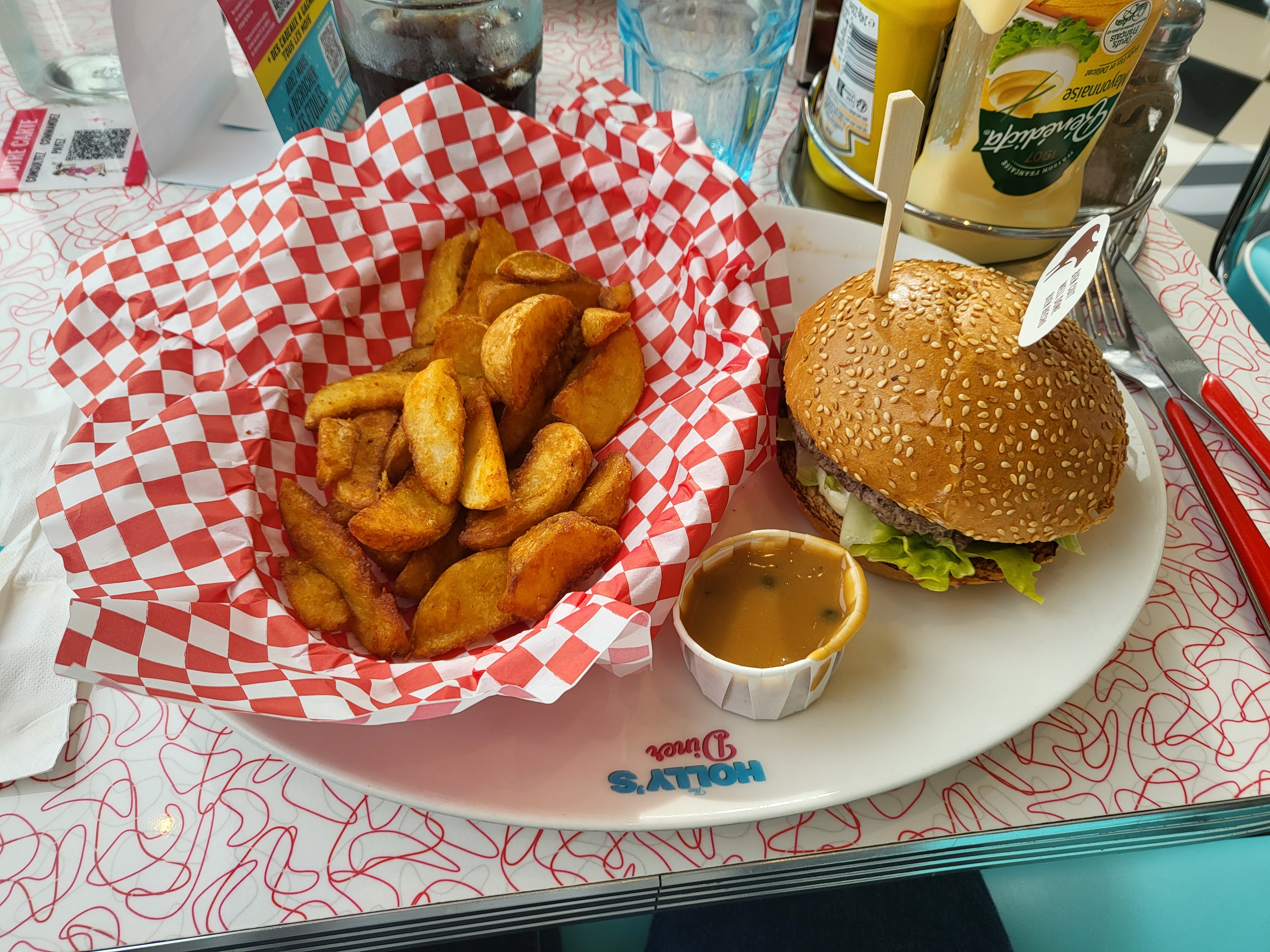 Holly's dîner est un restaurant plus qu'un fastfood. Les hamburgers sont copieux et il y a un grand choix même pour les végés. Il y a beaucoup de monde, ne pas venir vers 20h, vous risquez d'attendre avant d'avoir une table. Ce qui fait, du coup, que le personnel nous presse un peu à finir mais en restant correct et poli. Les plafonds étant très haut, c'est un peu bruyant. Nous avons pris la formule à 19€90 pour 1 hamburger et 1dessert( +2€ pour choisir un dessert plus conséquent)et.( sans boissons)