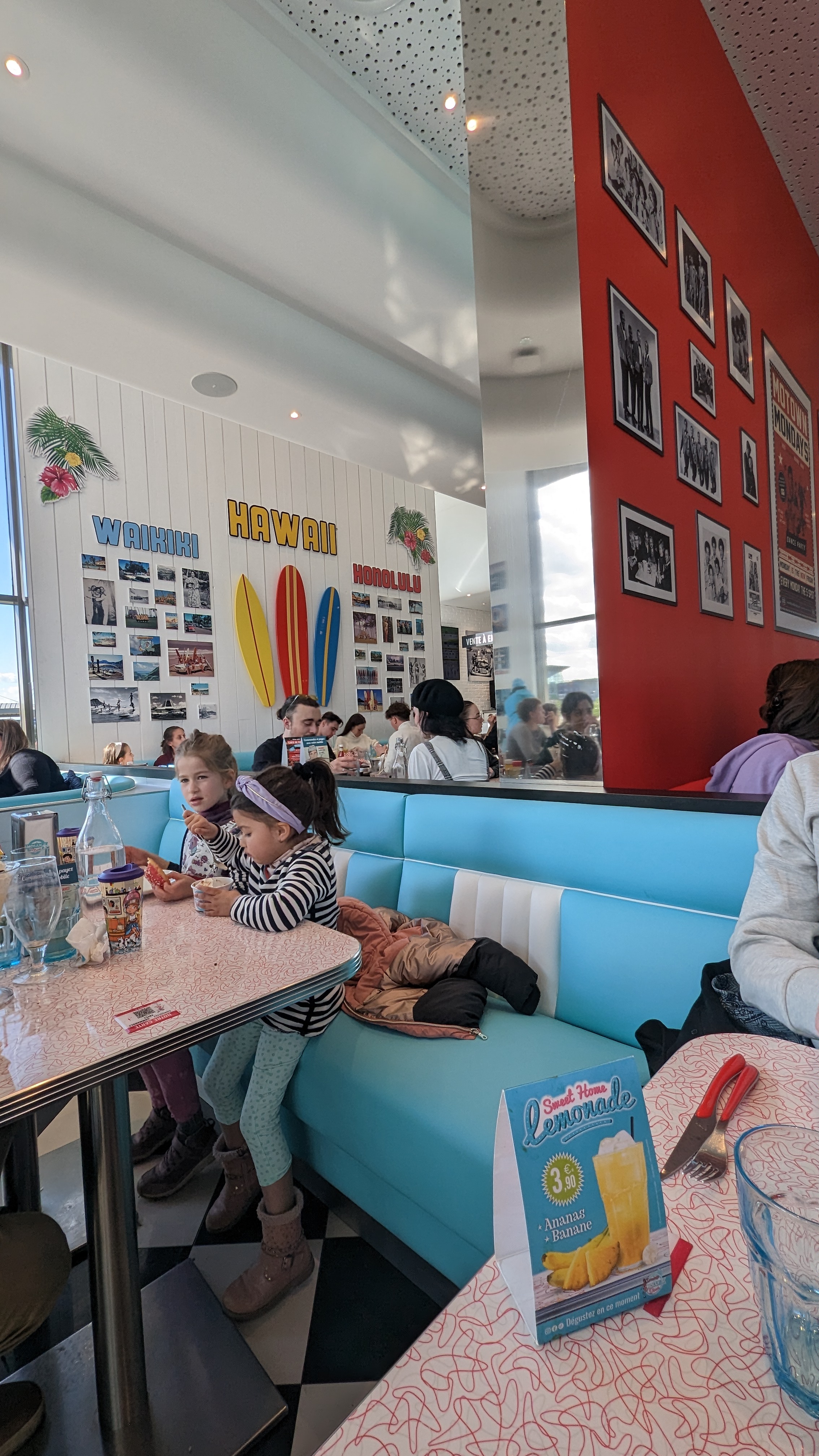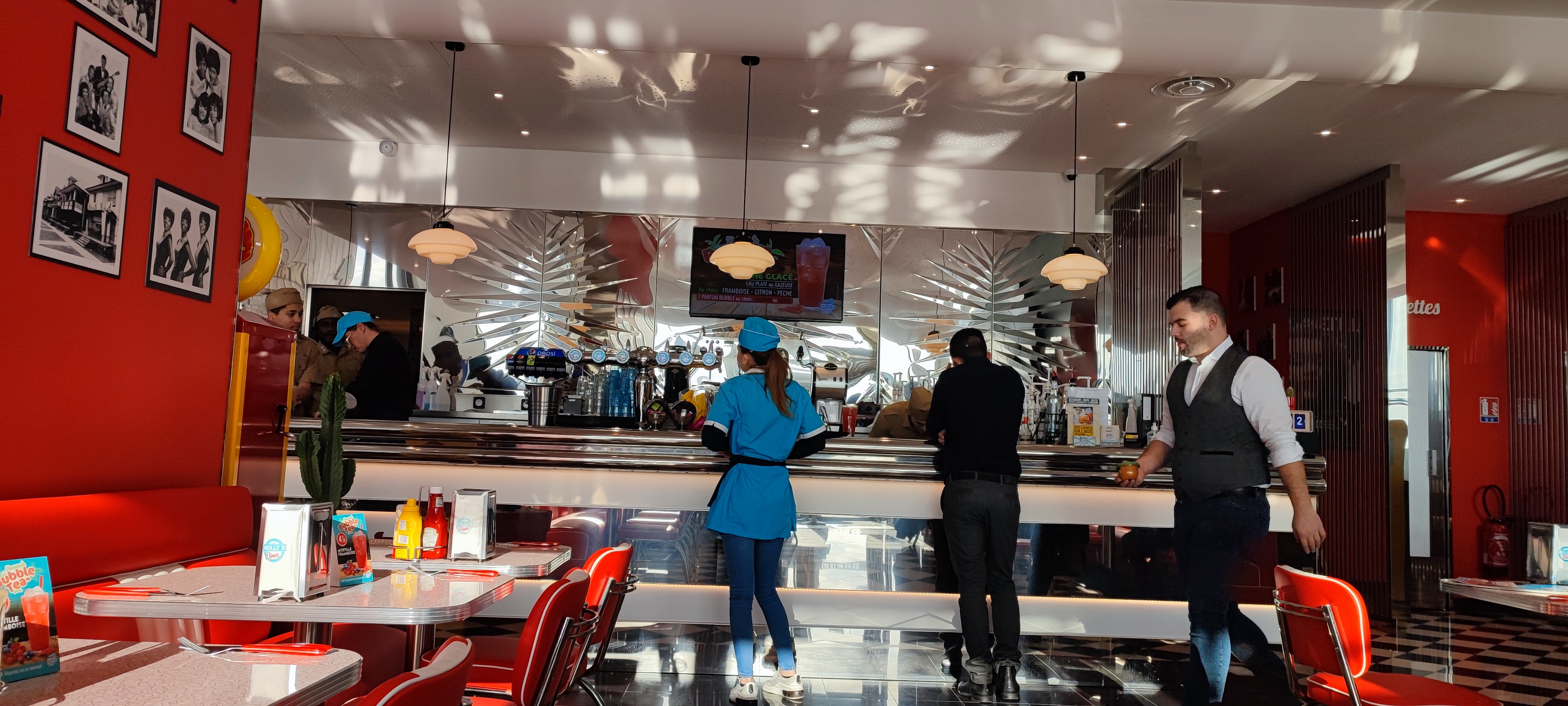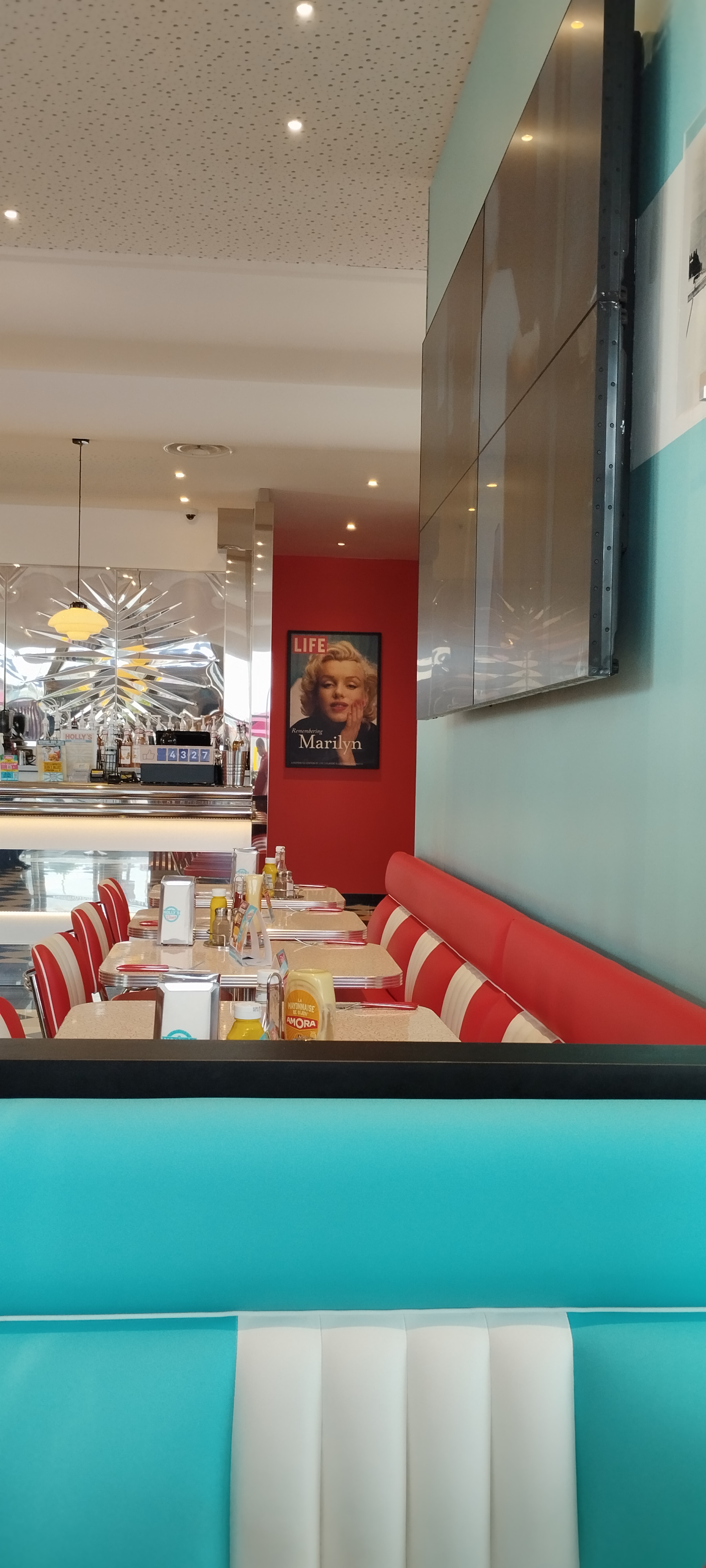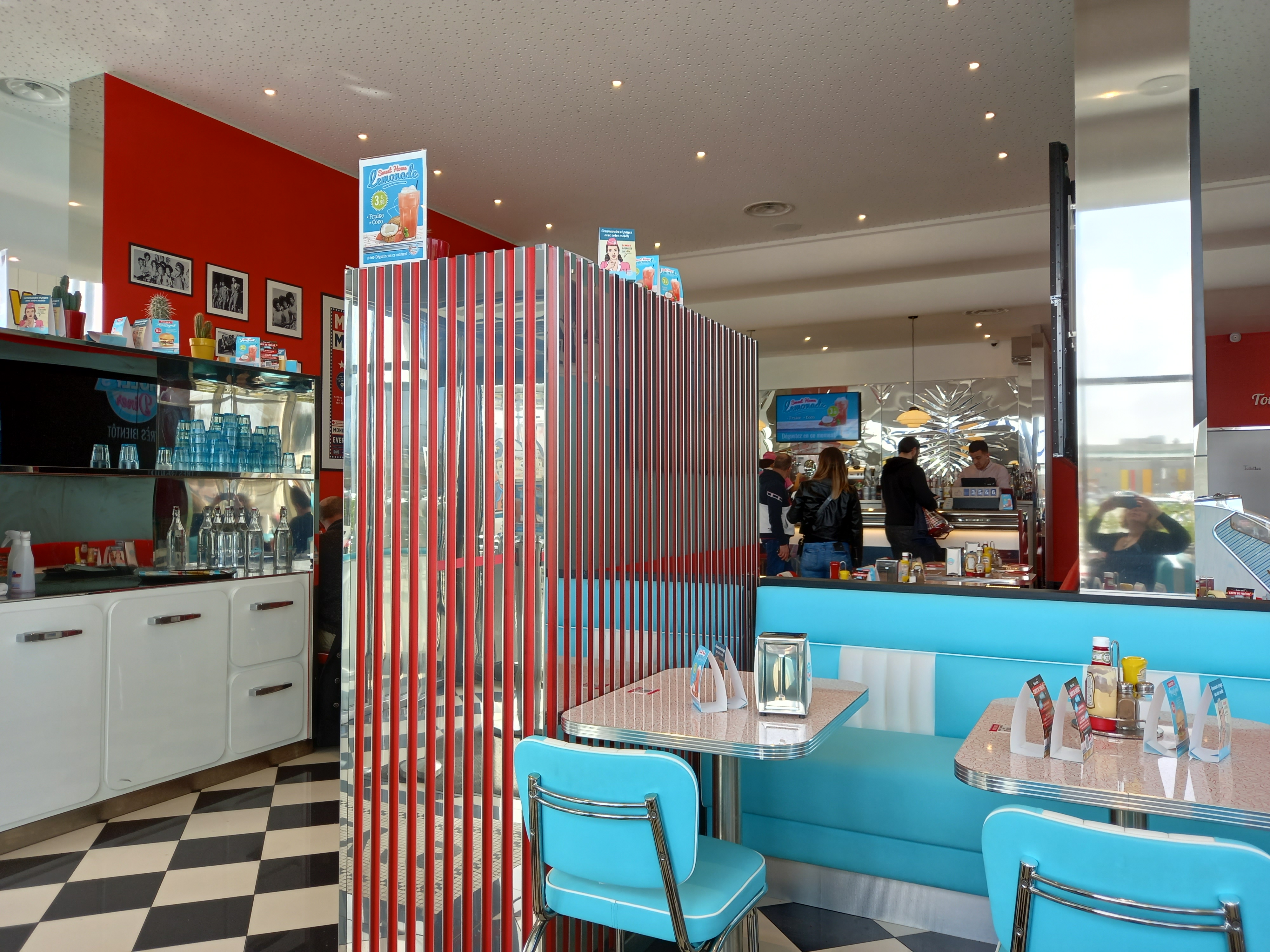 Nous avons testé avec mon mari sur un jour de semaine : un mercredi vers 12h. Vous êtes accueilli à l'entrée avec une serveuse, l'ambiance est top et le décor vraiment adapté, ça rappelle vraiment les anciens restaurants avec les banquettes bleues. Les Burgers sont très bons, bien servi avec des frites, copieux. Je recommande, nous y retournerons.