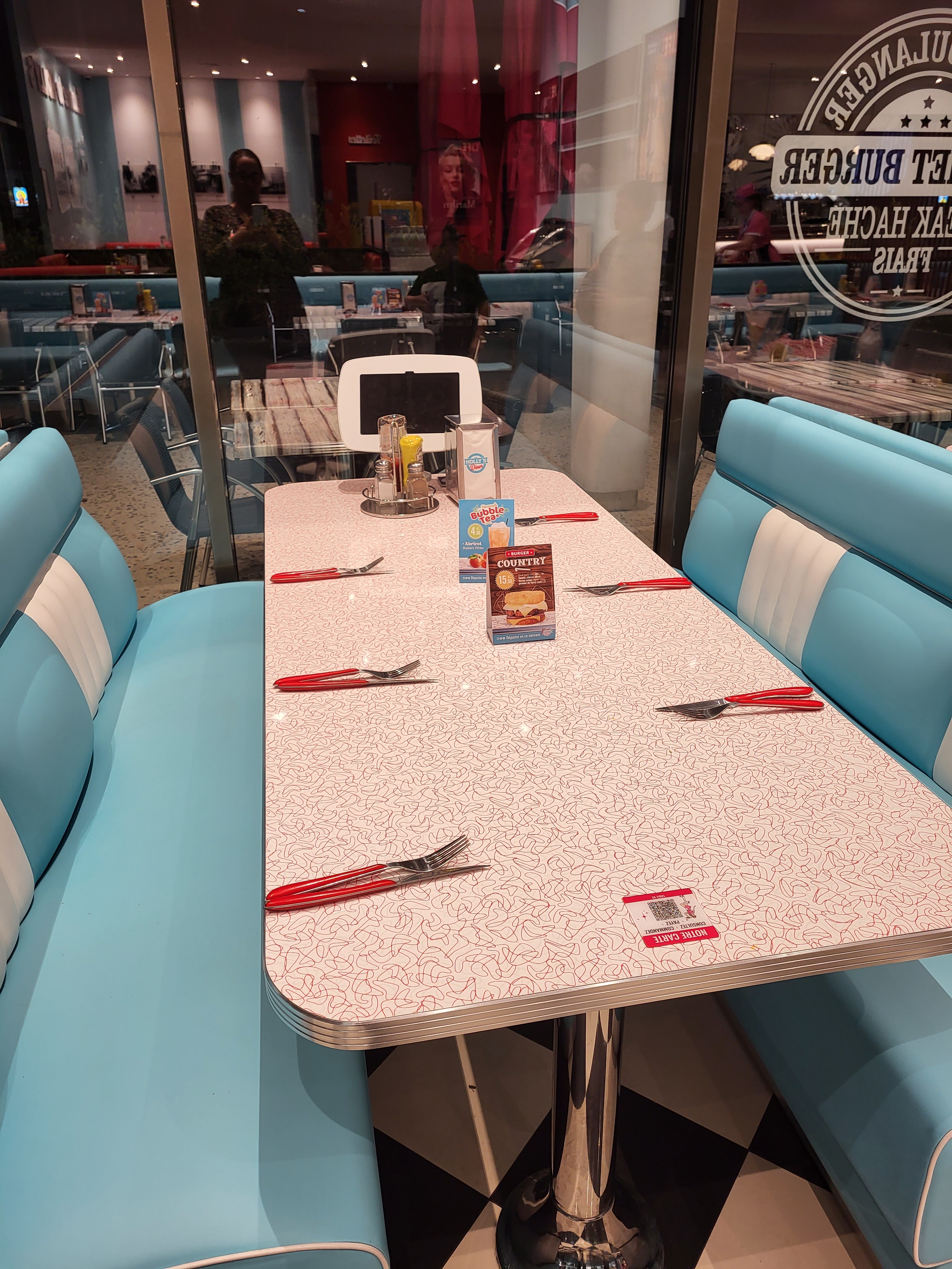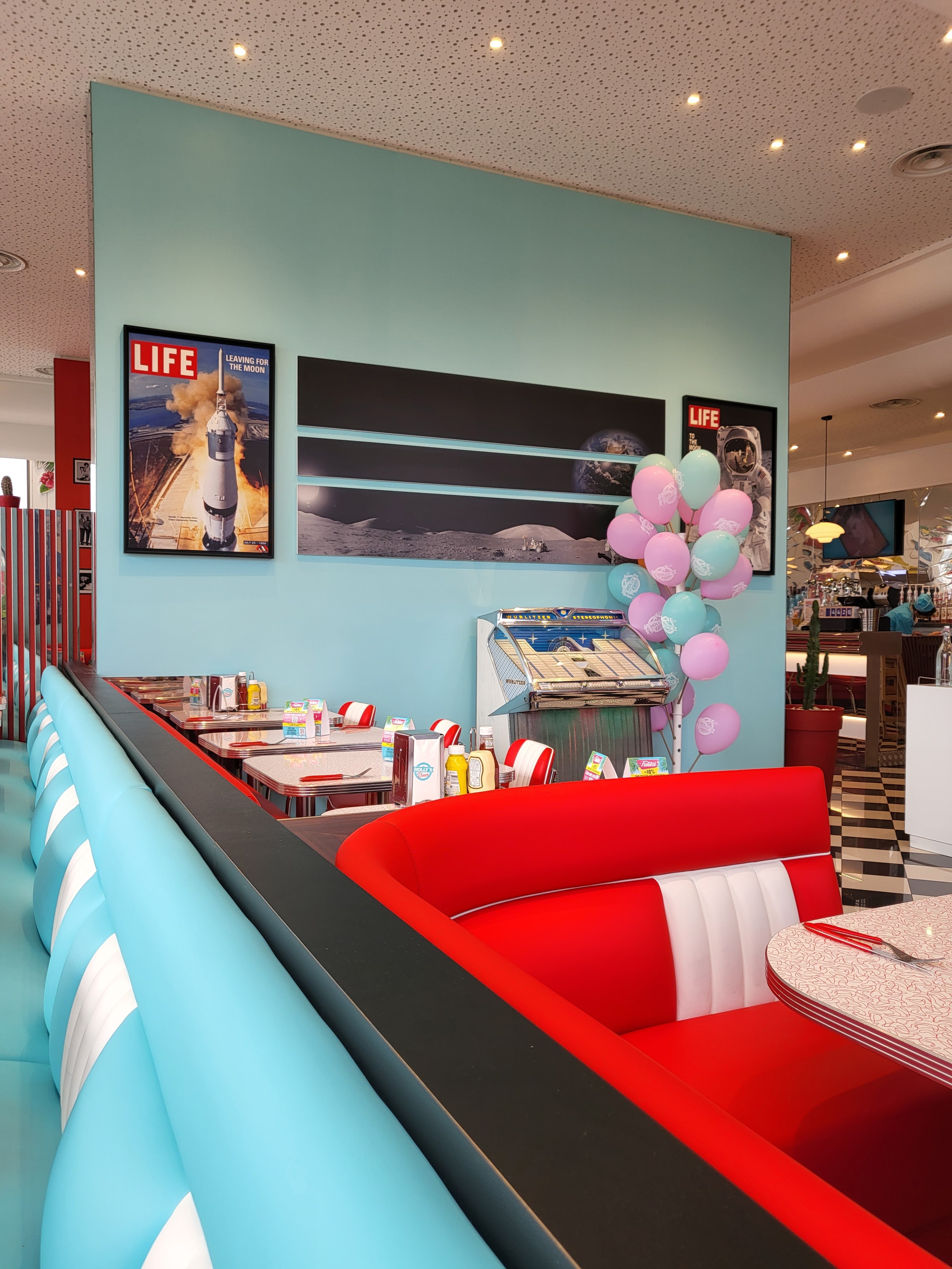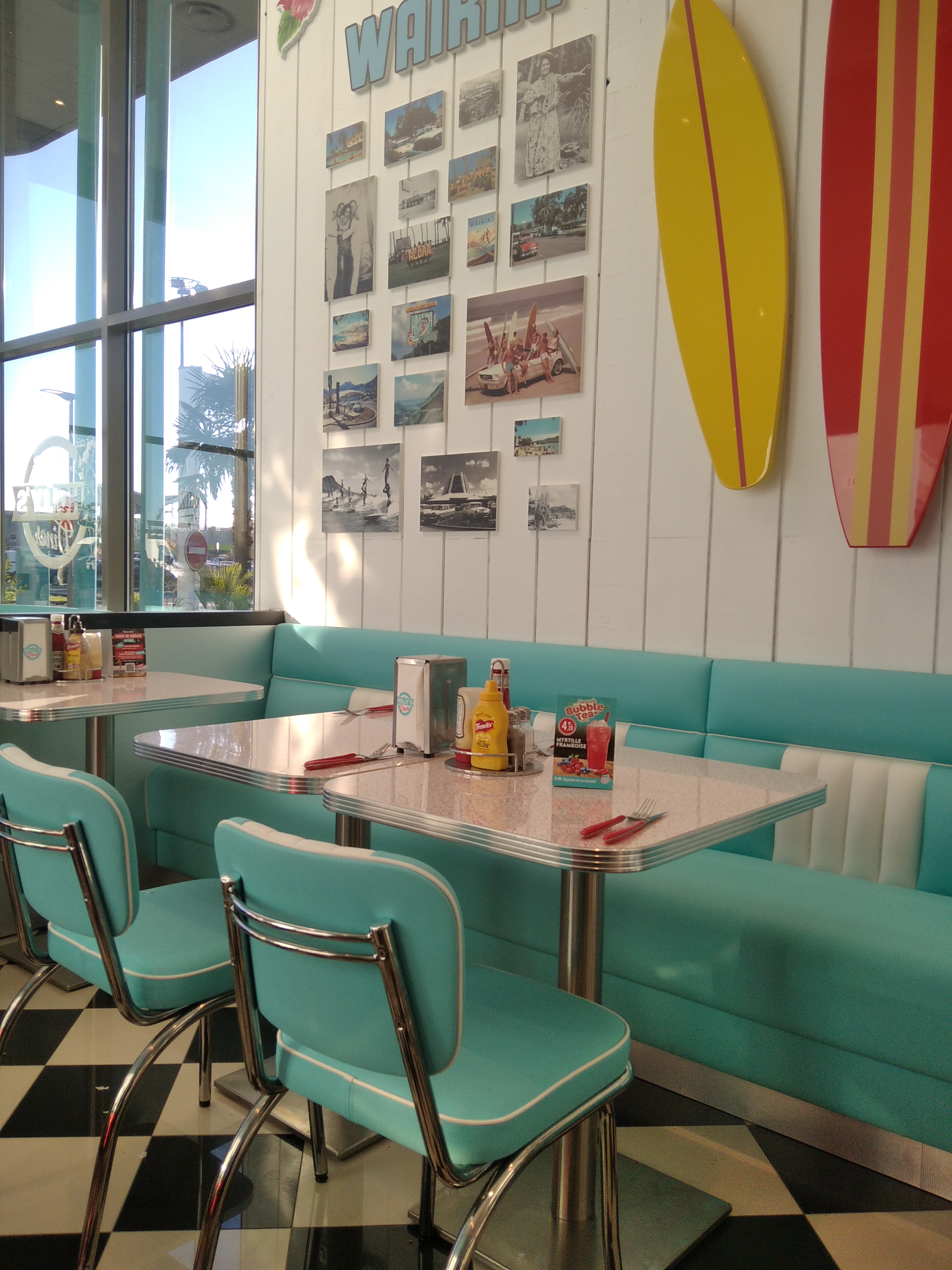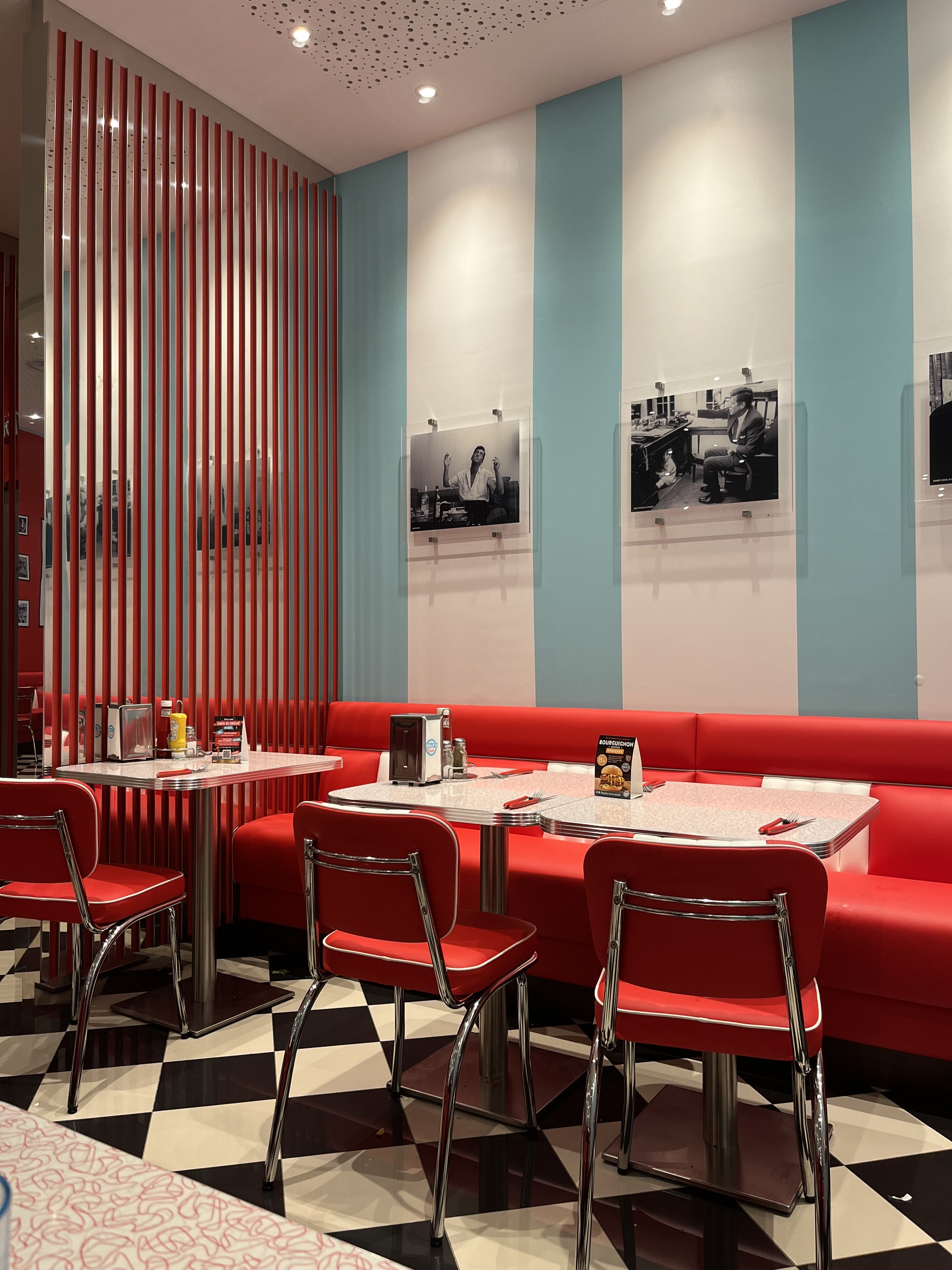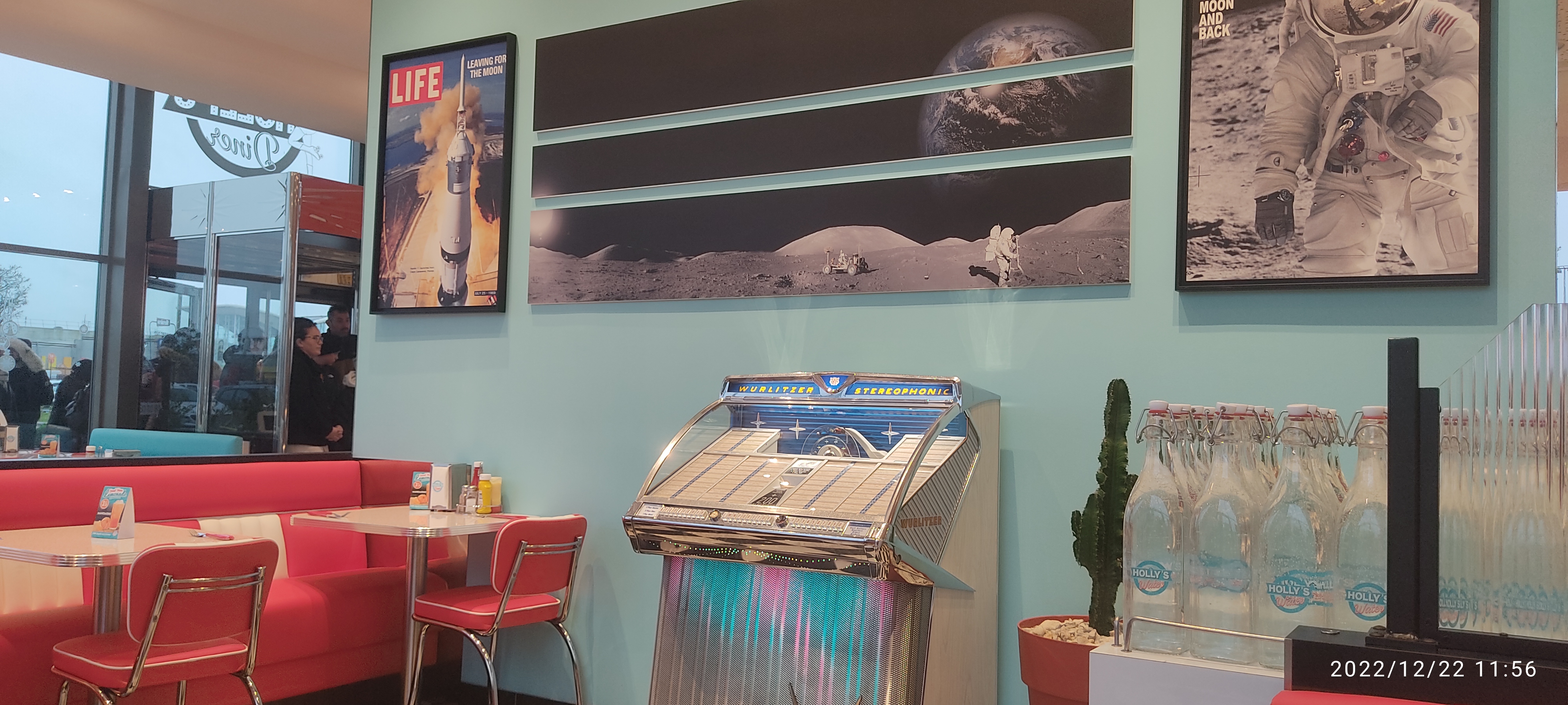 Nous avons testé avec mon mari sur un jour de semaine : un mercredi vers 12h. Vous êtes accueilli à l'entrée avec une serveuse, l'ambiance est top et le décor vraiment adapté, ça rappelle vraiment les anciens restaurants avec les banquettes bleues. Les Burgers sont très bons, bien servi avec des frites, copieux. Je recommande, nous y retournerons.