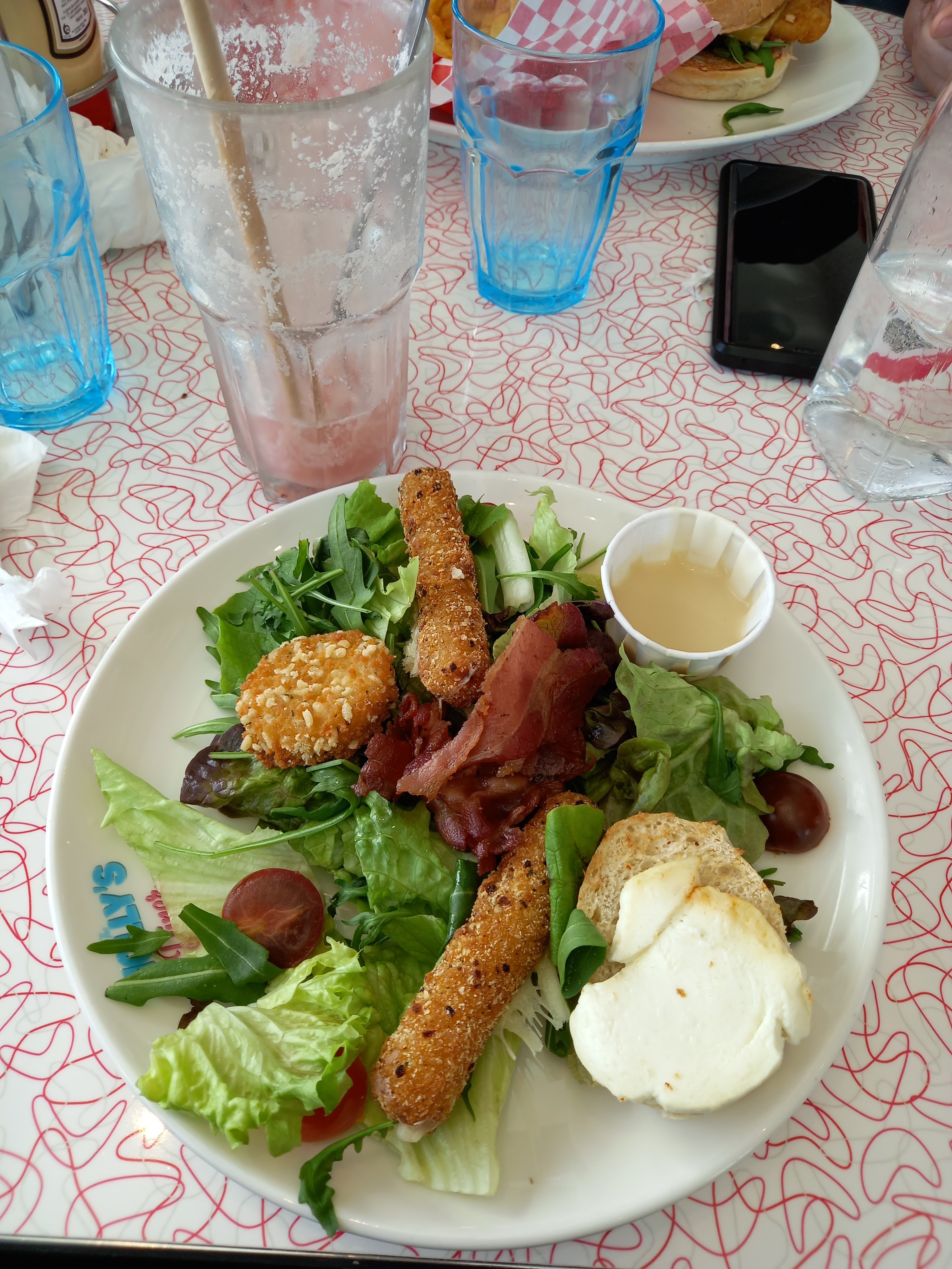 Nous avons pris à emporter. Nous arrivons à l'heure mais la commande mettra 40mn à nous parvenir. Aucune information et aucune excuse. Nous avons entendu un gars du staff insulter un livreur UberEat pendant notre attente 😱 c'était juste surréaliste ! Le hamburger et la salade sont à 10€ piéce, je vous laisse admirer le dressage.