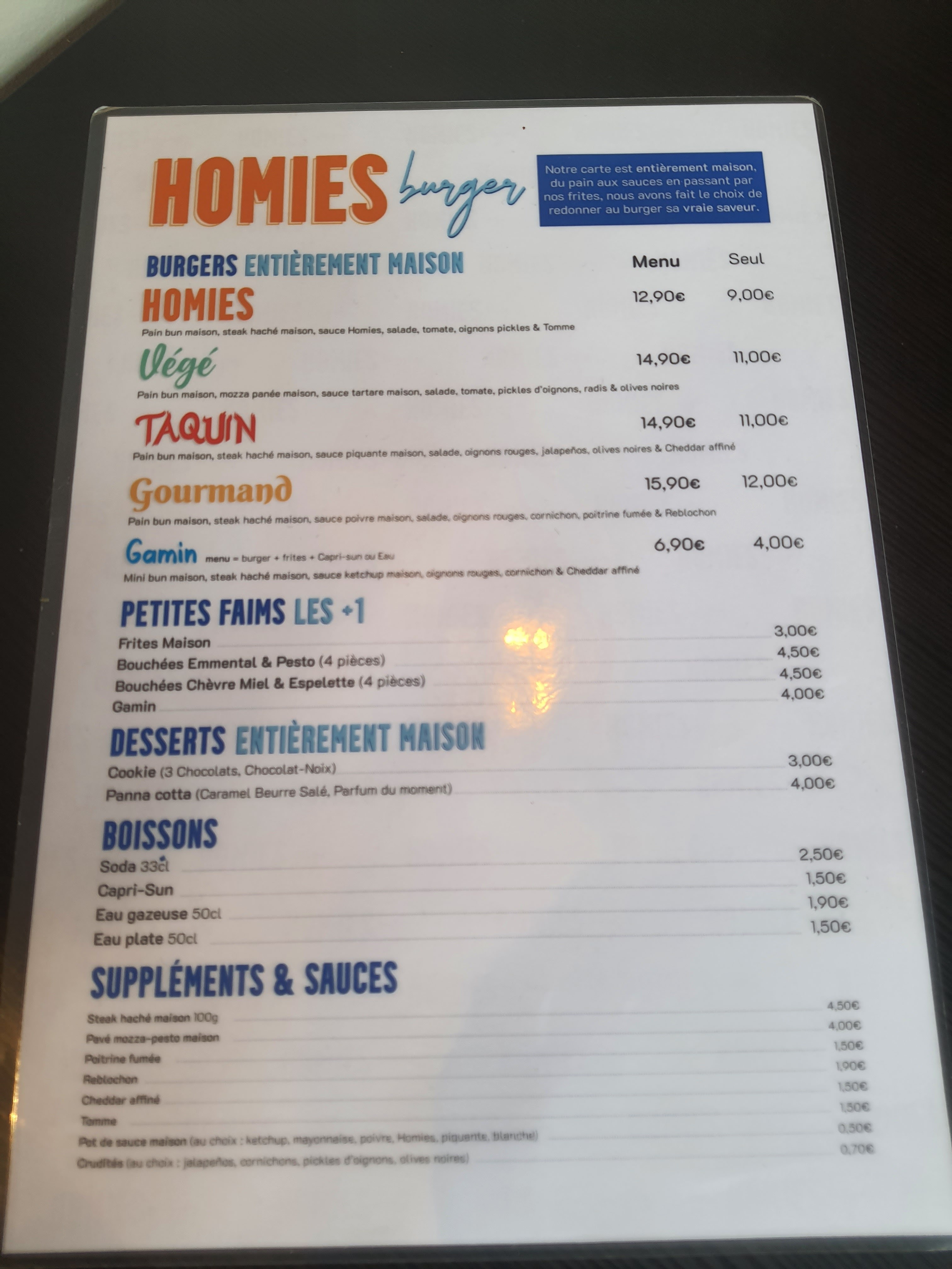 Super moment ! Jai pris le homies et le taquin car je suis gourmande ... les deux étaient très bons , les pains sont maisons et sont tres réussis, le ketchup maison est délicieux. Je reco à 1000% !
