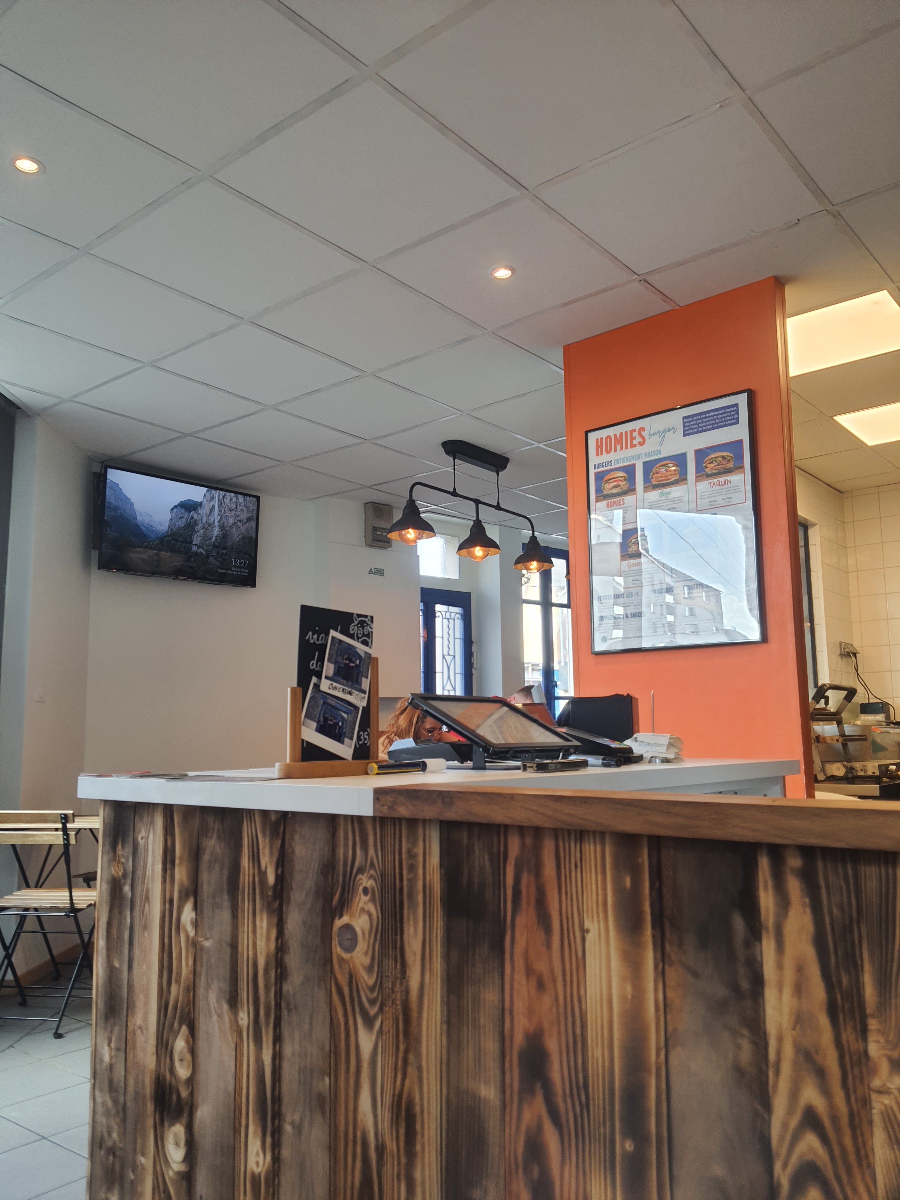 Nous avons pris à manger à emporter, c’était près en 10 minutes ! Les burgers sont excellents et très qualitatifs, de plus , les petits croustillants chèvres sont aussi de très bonne qualité. Leur sauce maison « Homies » se marie très bien avec leurs produits. Je recommande vivement !