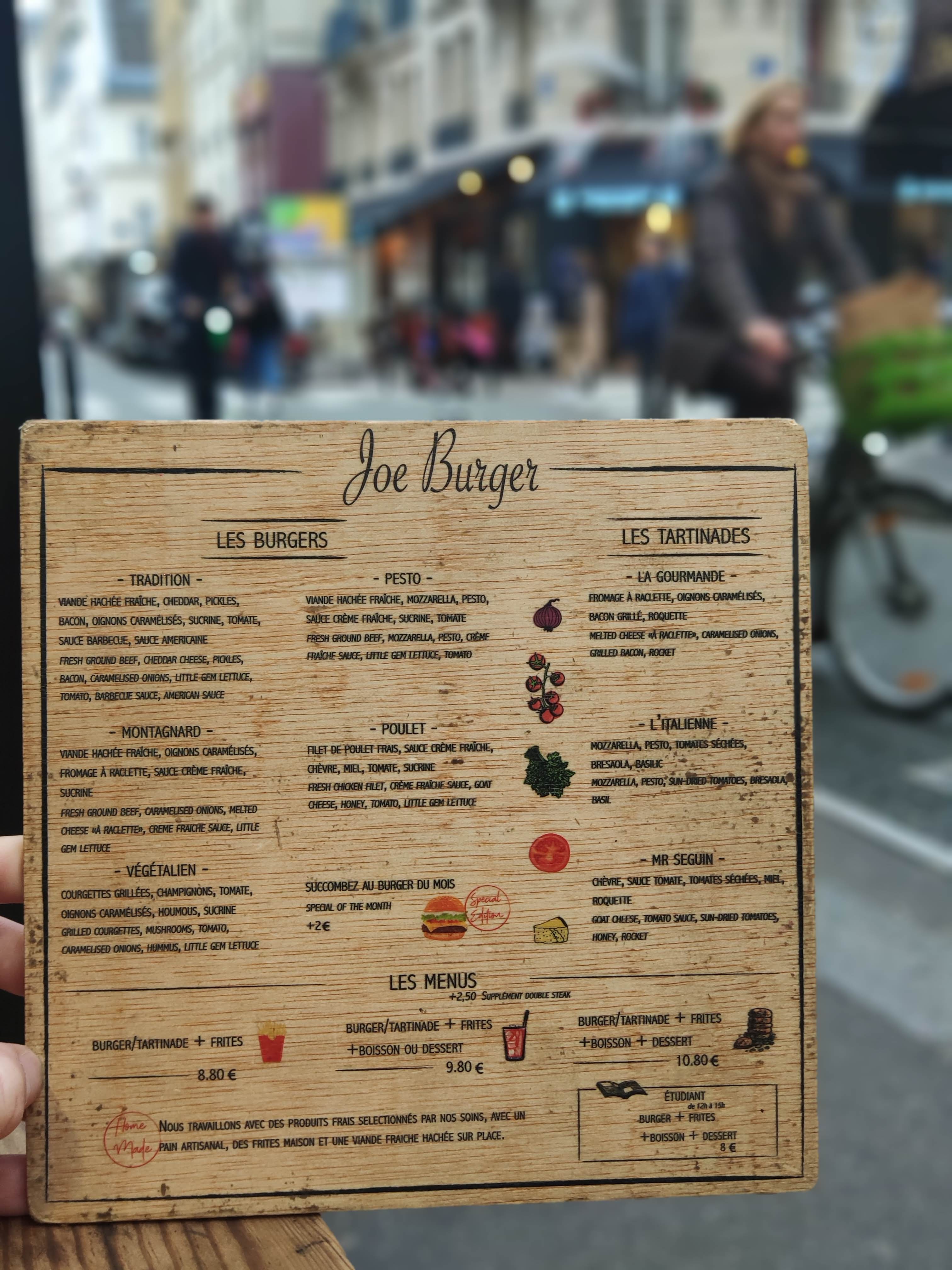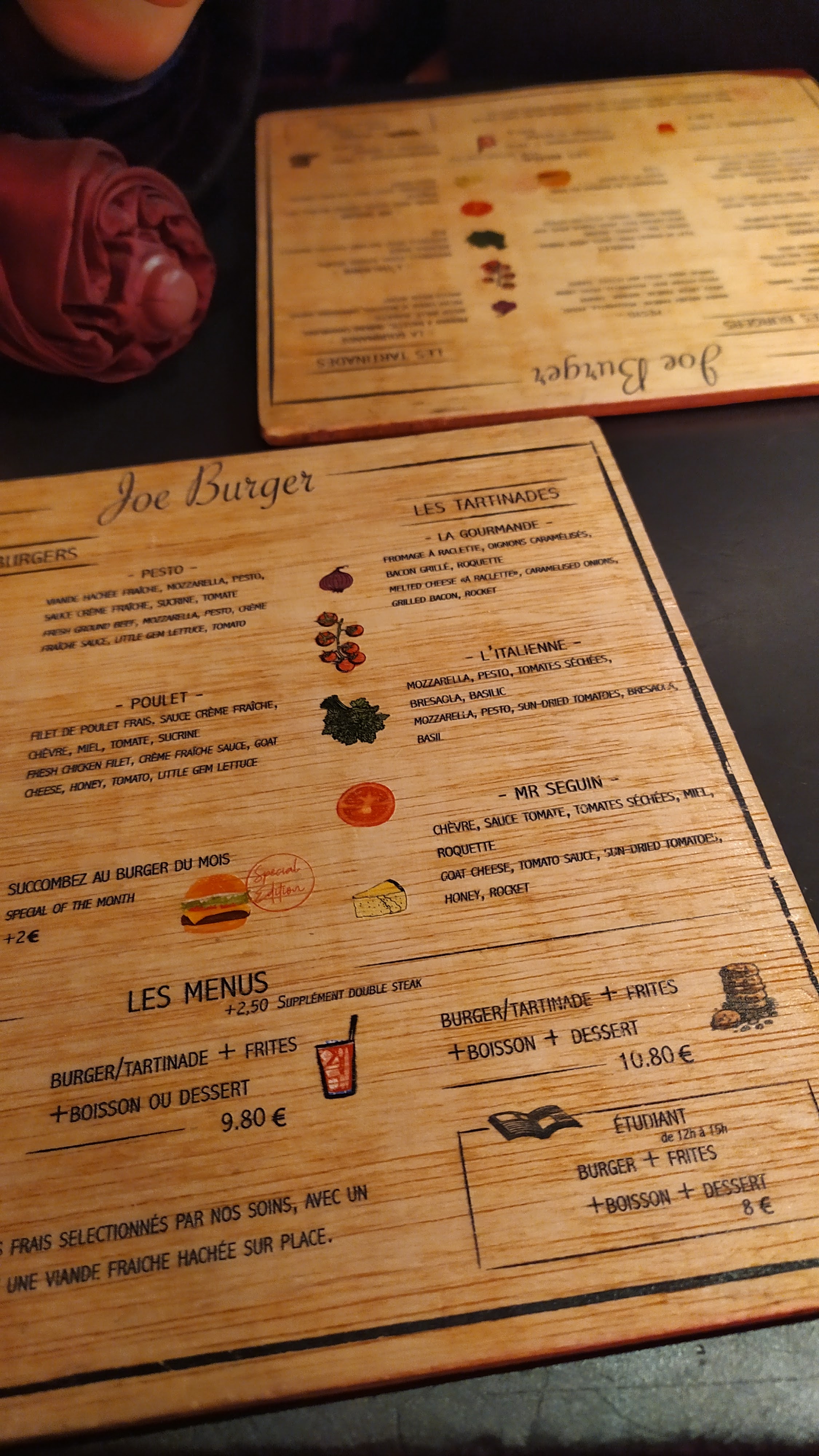 C'est bien connu, après la bière vient l'heure de manger. Ce soir là, après nos pintes du vendredi soir à la tireuse, avec mes copains nous avons cherché un endroit sympa où manger. Et on a tous voter pour un burger. Bon ok en même temps il pleuvait bien, donc on a pas eu envie de chercher pendant longtemps. Joe Burger c'est tout petit, mais c'est sympa. Le staff est très accueillant, et la carte propose plein de burgers différents dont... un burger végétalien !! Mais pour moi un burger c'est avec du fromage obligatoirement (sinon c'est pas un burger, ne soyons pas fou), et j'ai donc demandé à la p'tite serveuse toute sympa si je pouvais avoir le même burger que mes copains (celui avec du fromage à raclette) mais version végé. Il était bon, et le MIEUX dans tout ça c'est que les cuistot font fondre le fromage dans une petite casserole :) C'est coulant, ça fond et c'est bon. La formule est servis avec des frites (pas très maison), et tu peux aussi prendre l'option boisson. Et j'en ai eu pour 9€, donc vraiment vraiment pas cher. En bref, une bonne adresse de burger où faire une pause pendant ta soirée, pour changer du traditionnel kebad / sushis.