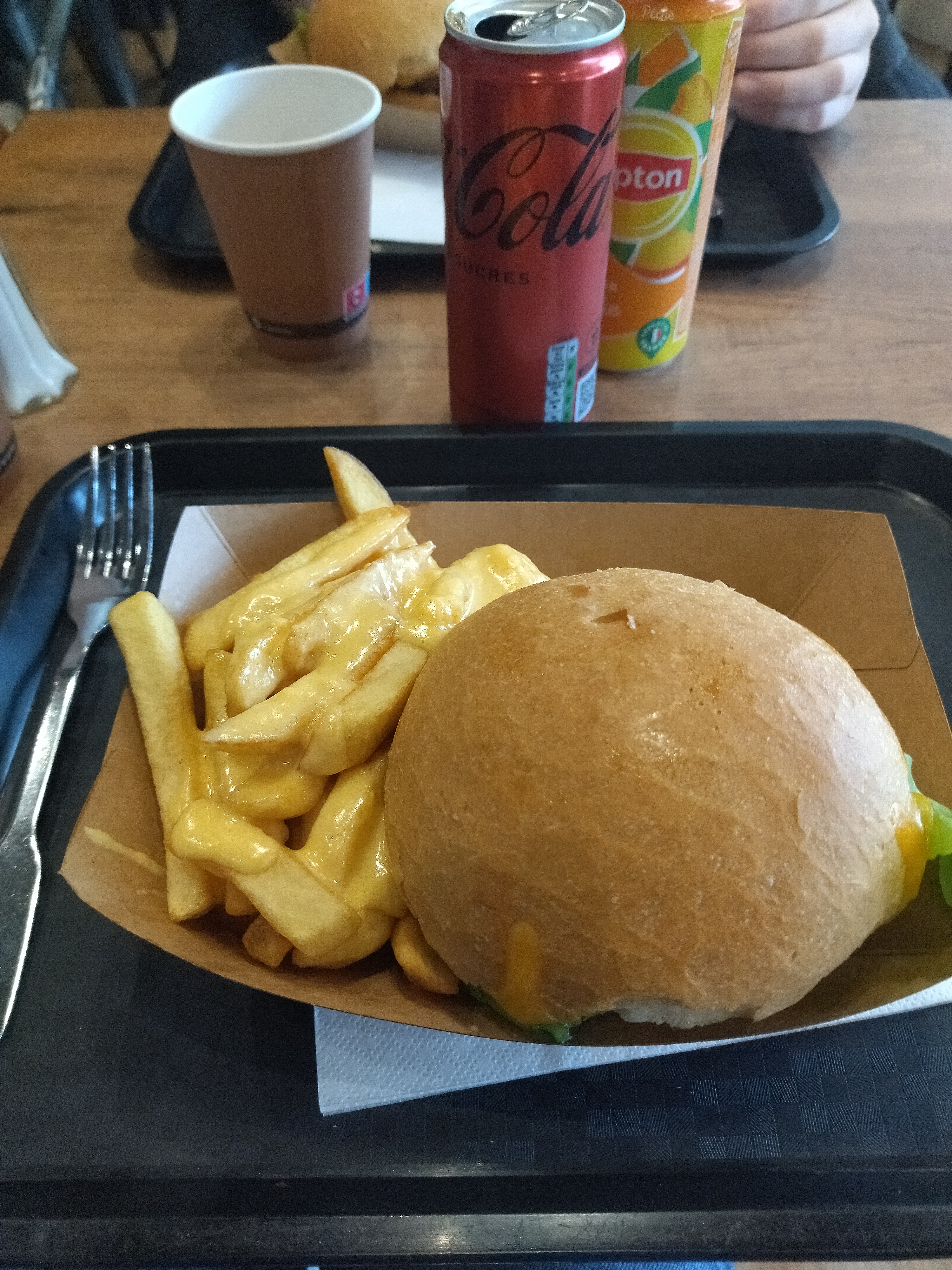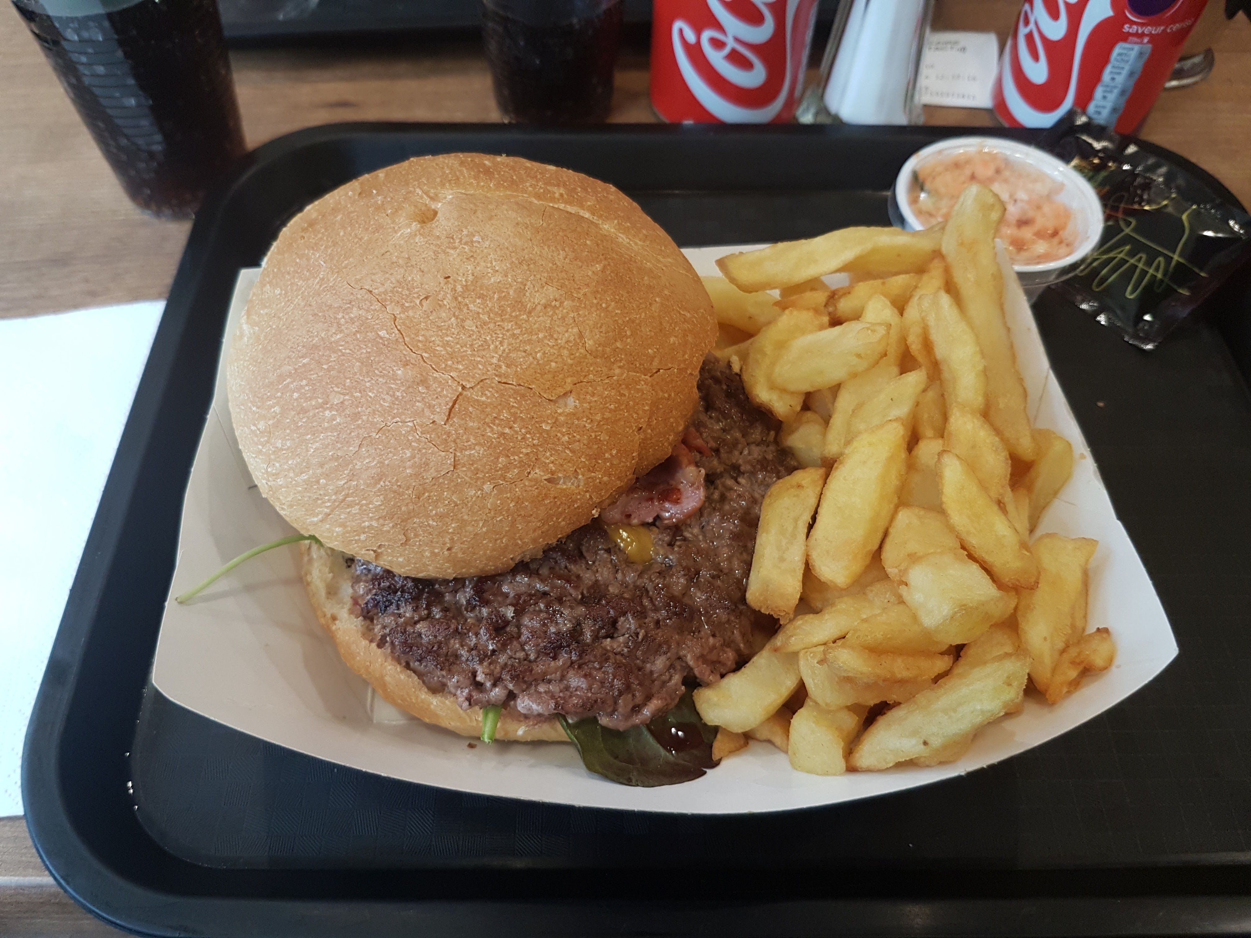 Bon Burger, fait avec une base pain, pas de la viennoiserie Frites carbonisées un peu trop nombreuses dans ma portion, lors de mon dernier passage Donc révision d'avis avec perte d'une étoile à des fins de vigilance pour ce petit désagrément