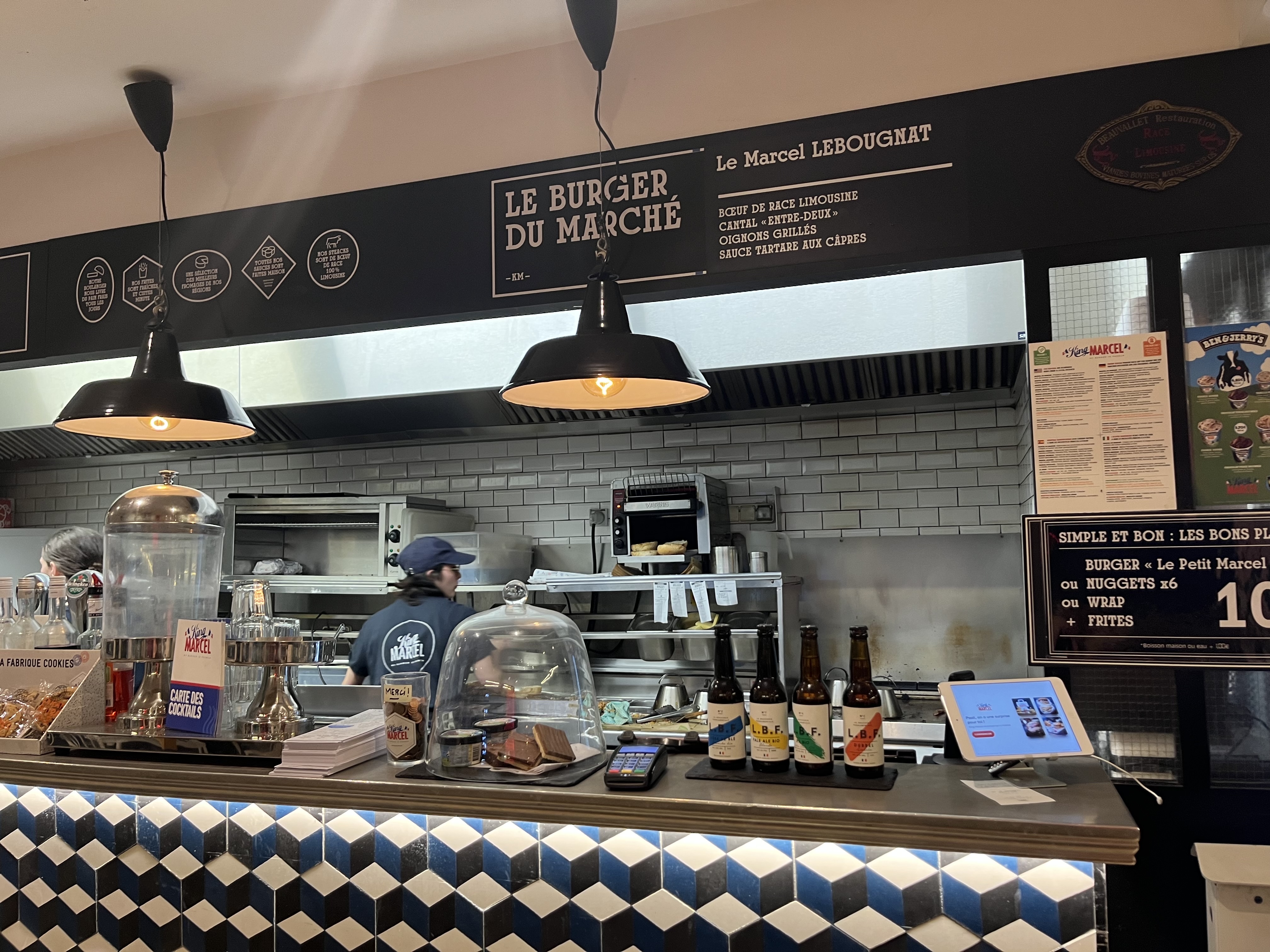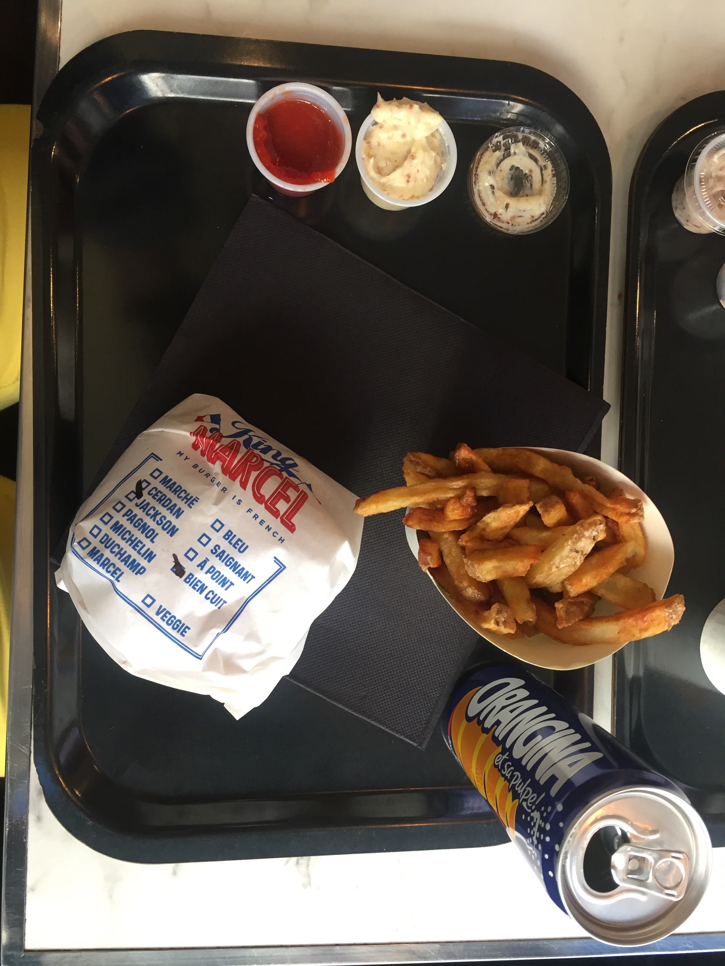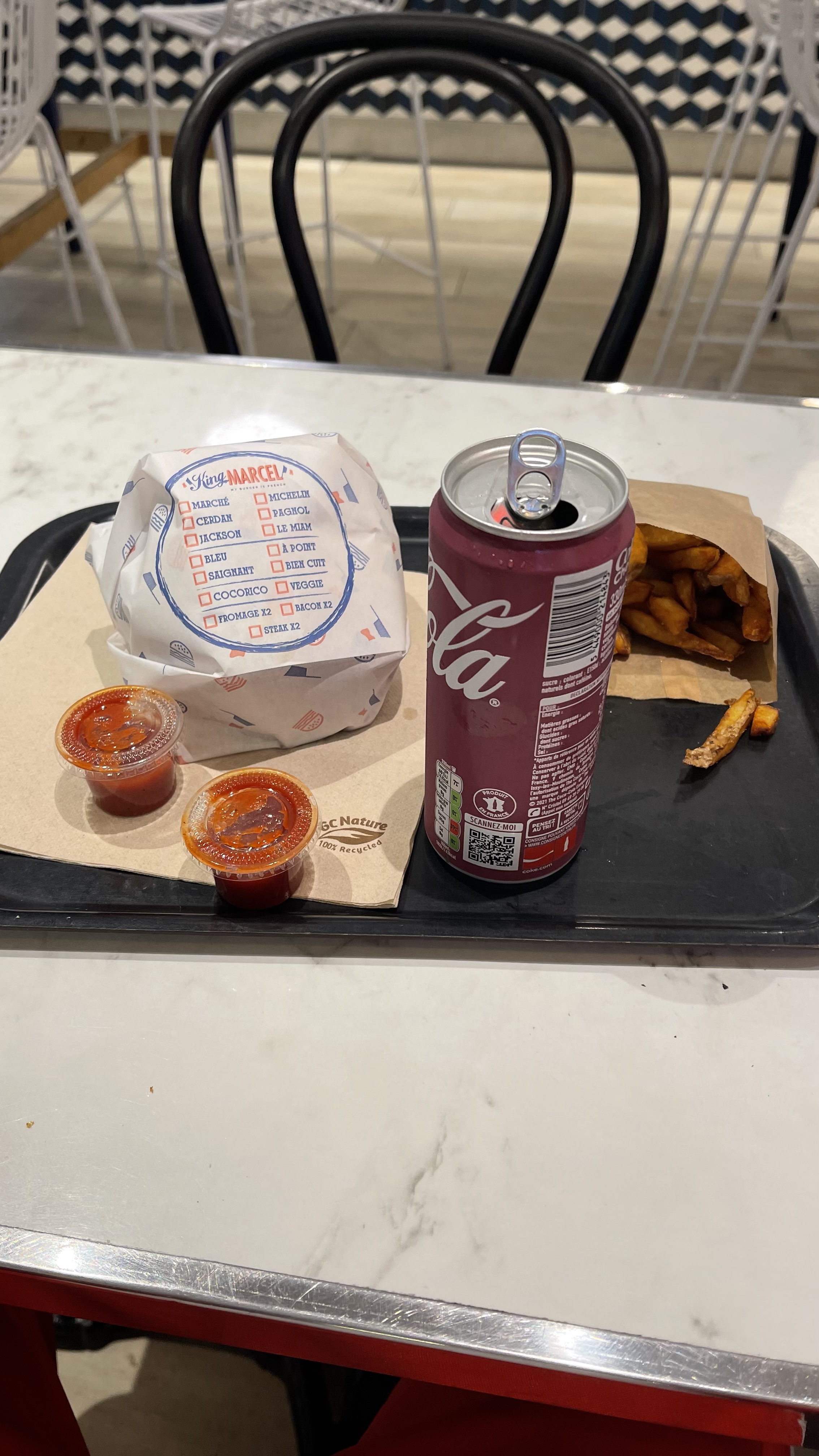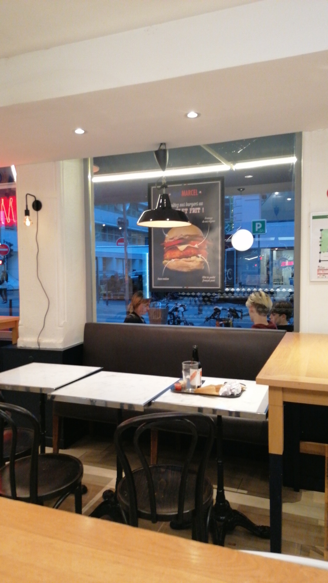 Je ne connaissais pas cette enseigne King Marcel de fast food, j ai découvert ce restaurant par hasard. On nous propose des hamburgers faits maison avec des ingrédients frais et locaux, combinant la cuisine américaine et française. Bien accueillie par une serveuse souriante et très efficace, j ai été agréablement surpris par l hamburger avec un vrai steack limousin et une bonne sauce, des frites maison accompagné d une excellente citronnade. Les quantités sont suffisantes et je n'ai pas eu faim 2 heures après . On remercie encore la serveuse pour sa gentillesse et son service de qualité .