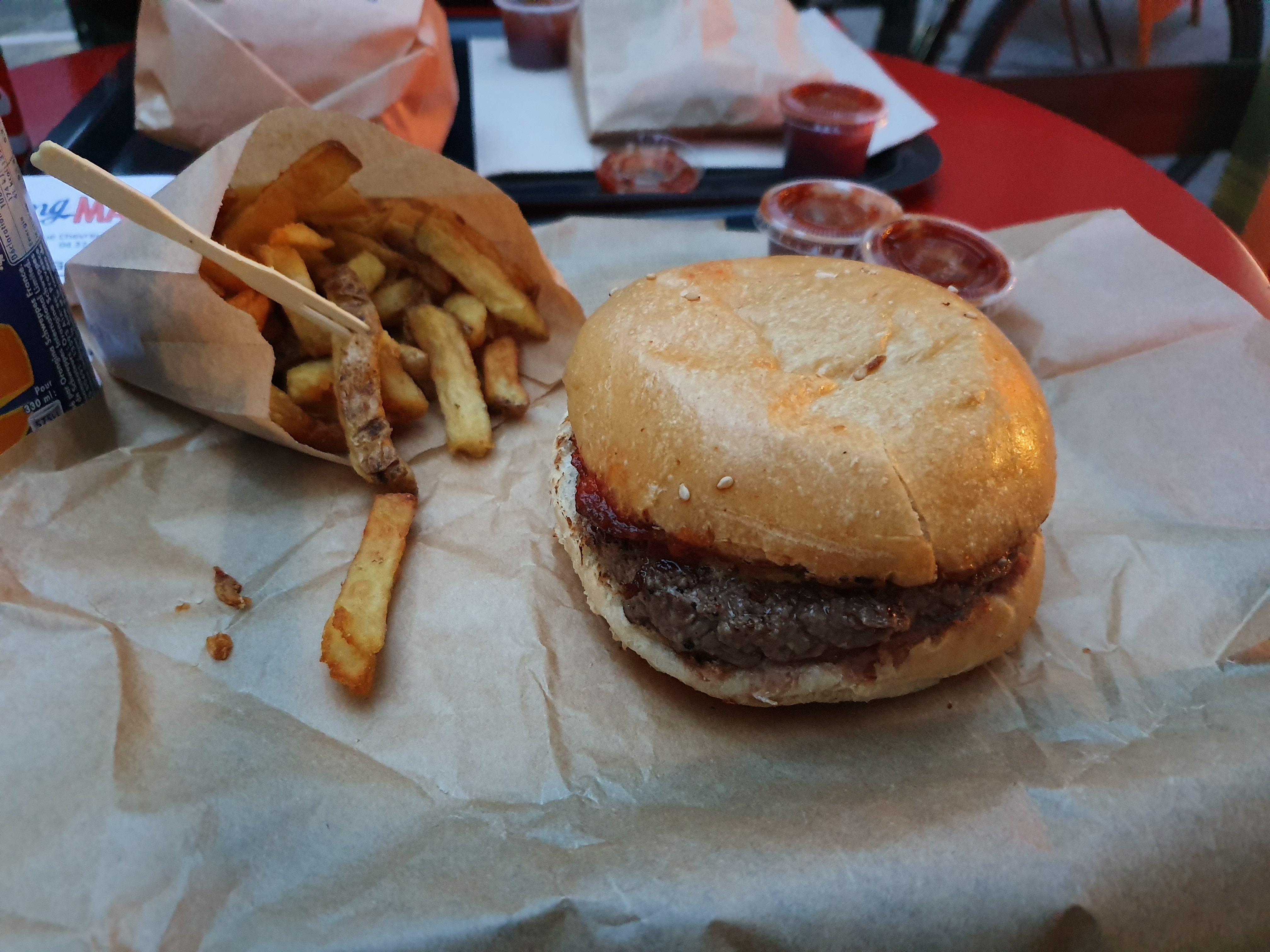 Bon burger, je préfère les frittes plus épaisses mais on est pas non plus sur des frittes ultra fines donc très correct à mon gout. J'ai trouvé le burger très bon, la viande, le pain, l'accompagnement tout était bien, je le classe dans les bonnes chaînes. 3 étoiles dans l'absolu mais 4 étoiles dans la catégorie burger.