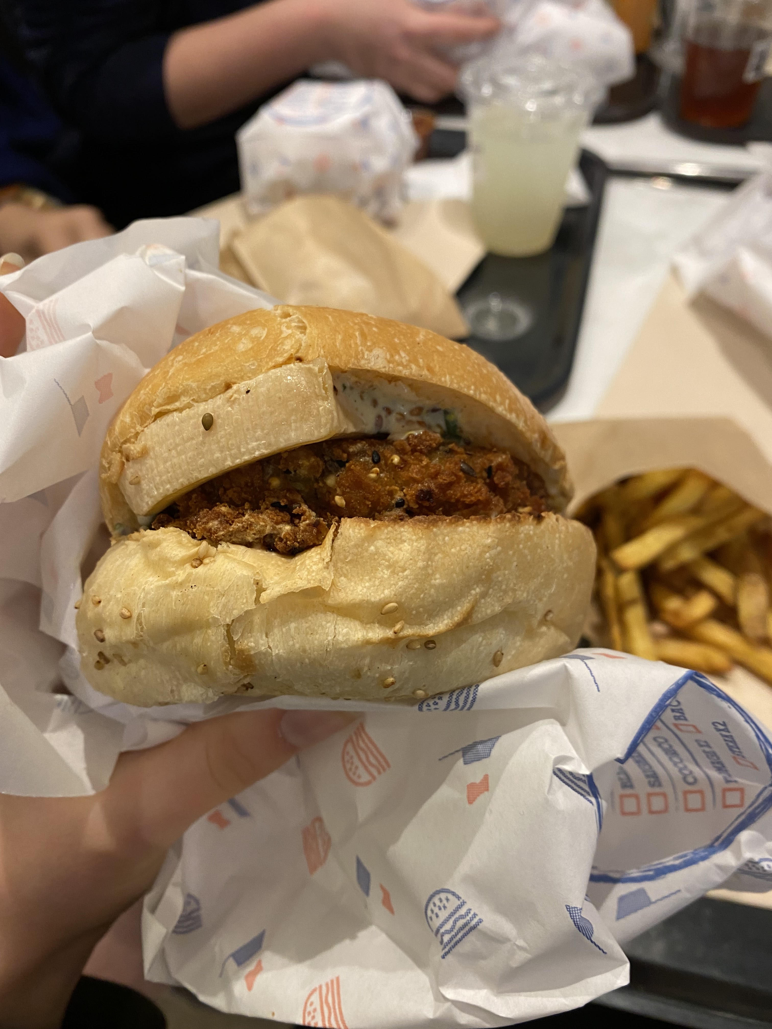 Je suis arrivé vers 16h. J'ai demandé un M végétarien. Impossible, il faut nécessairement passer sur une formule classique. Allez hop, 3 euros de plus... Merci. Je demande le tout à emporter. On me l'amène a table. Rien de grave, j'ai mangé sur place du coup. Pas de serviette sur le plateau. J'en demande une et mange donc. Le burger était un mix roquefort steak végétarien oignon. Le tout était extrêmement gras, le fromage était sous forme de sauce, non pas entier. Le goût du roquefort était trop prononcé pour cette recette. Je ne suis pas parvenu à finir le burger. Poids sur l'estomac qui a évolué vers une crampe par la suite... Bref, je ne recommande pas, malgré les efforts du personnel.